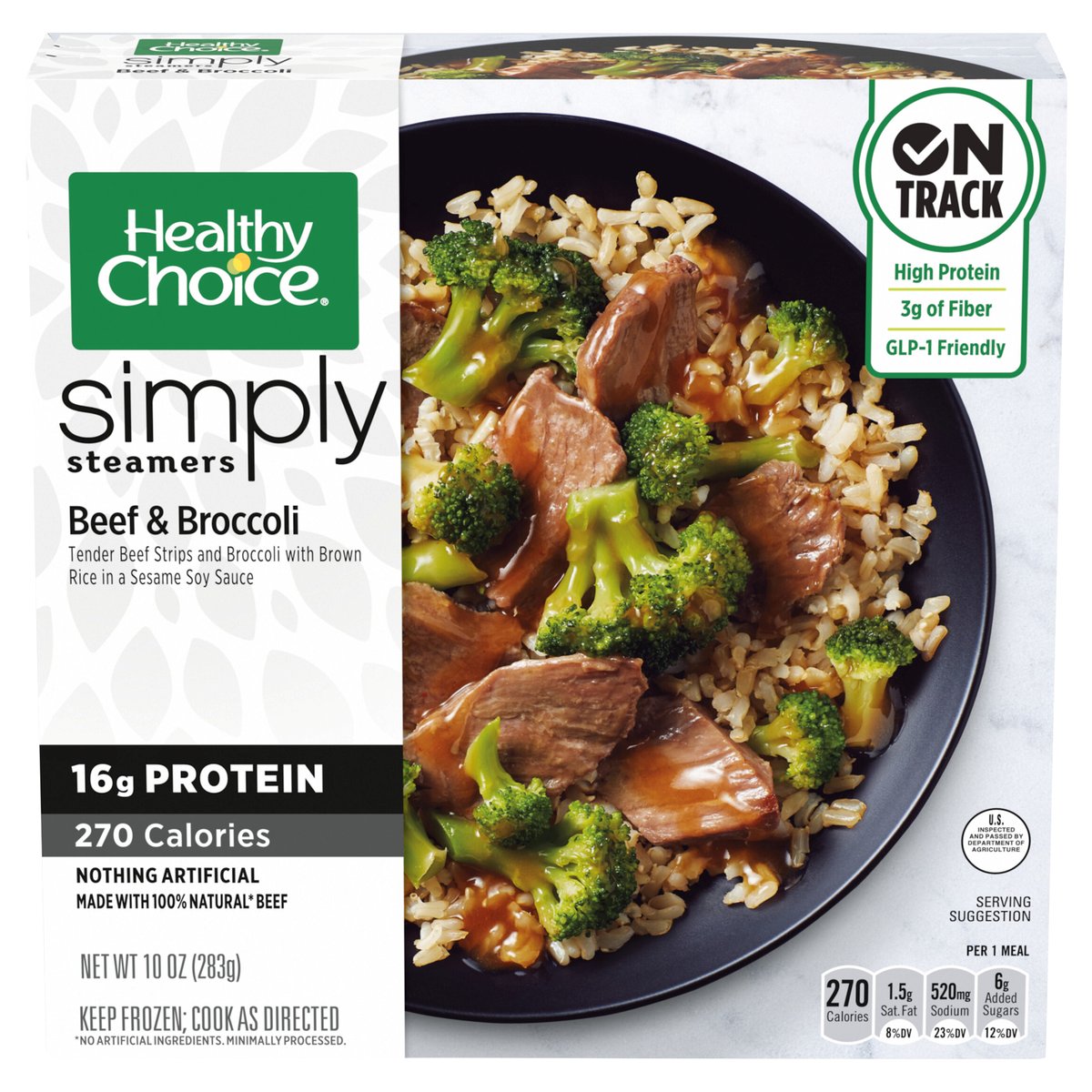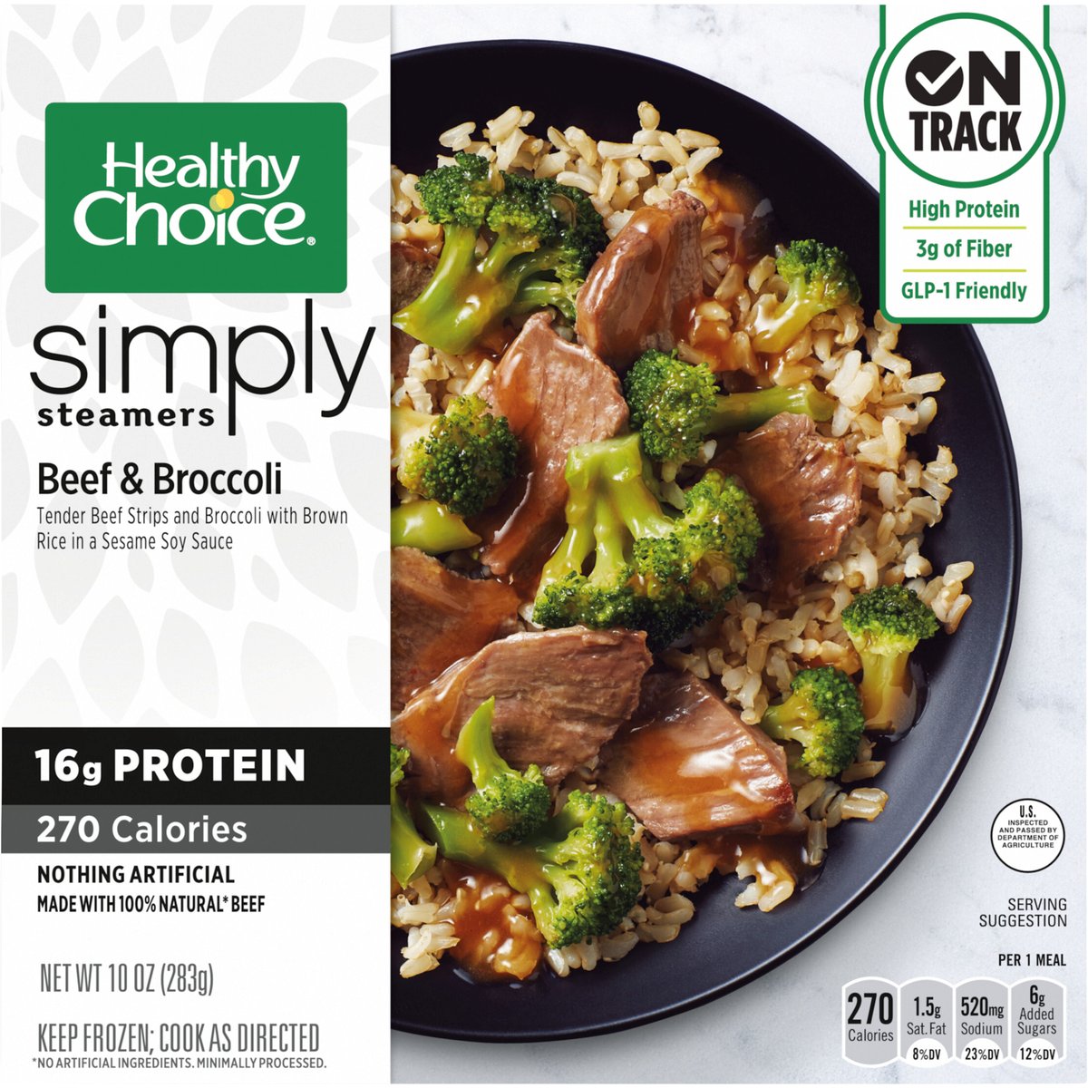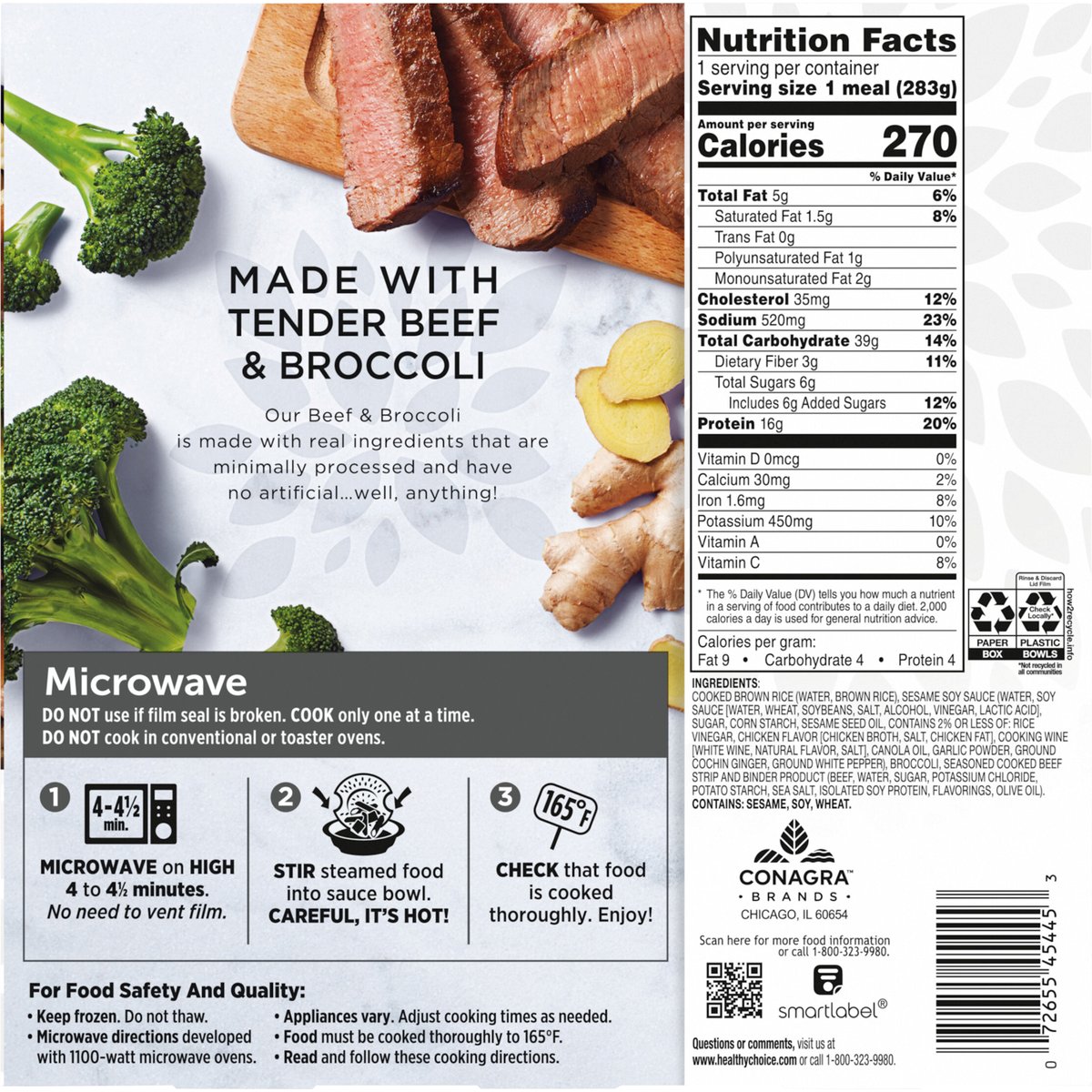 Tender beef strips and broccoli with brown rice in a sesame soy sauce. 3 g of fiber. 16 g protein. 270 calories. Per 1 Meal: 270 calories; 1.5 g sat. fat (8% DV); 520 mg sodium (23% DV); 6 g added sugars (12% DV). High protein. Nothing artificial. Made with tender beef & broccoli. Our beef & broccoli is made with real ingredients that are minimally processed and have no artificial...well, anything! U.S. inspected and passed by Department of Agriculture. how2recycle.info. www.healthychoice.com. SmartLabel: Scan for more food information or call 1-800-323-9980. Questions or comments, visit us at www.healthychoice.com or call 1-800-323-9980.