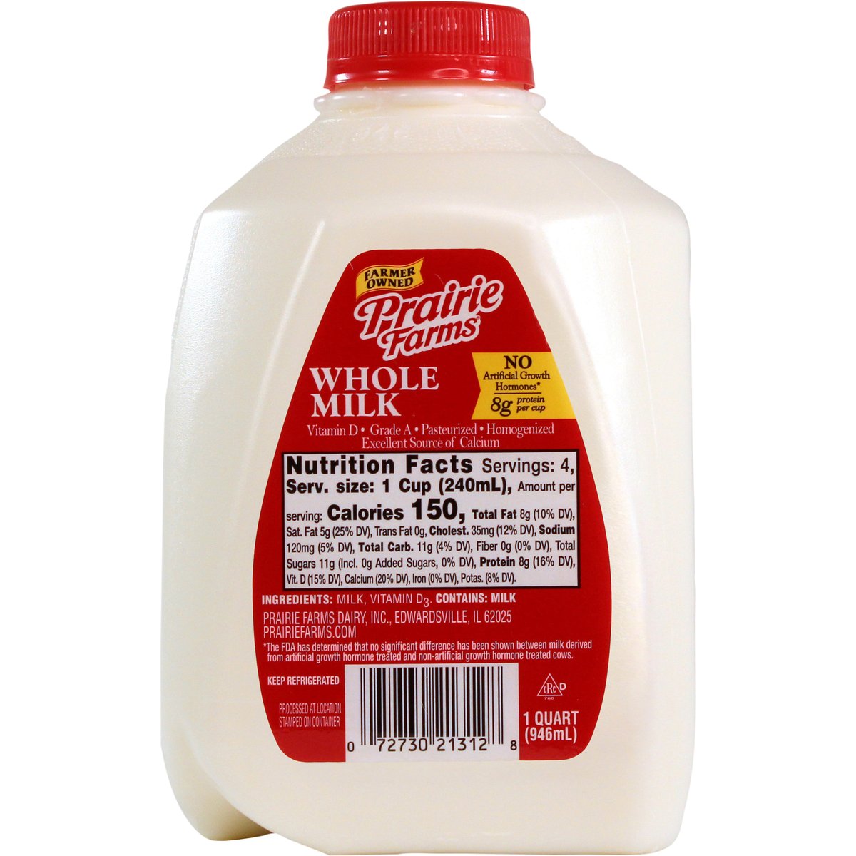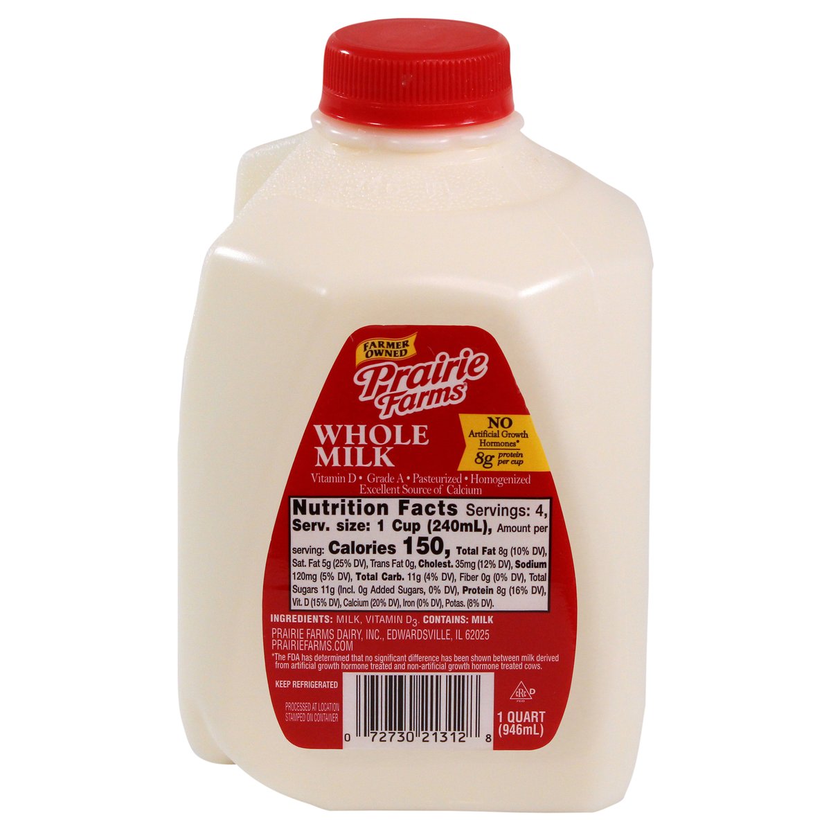 8 g protein per cup. Vitamin D. Excellent source of calcium. Farmer owned. Pasteurized. Homogenized. No artificial growth hormones*. Processed at location stamped on container. * The FDA has determined that no significant difference has been shown between milk derived from artificial growth hormone treated and non-artificial growth hormone treated cows. Grade A. PrairieFarms.com.