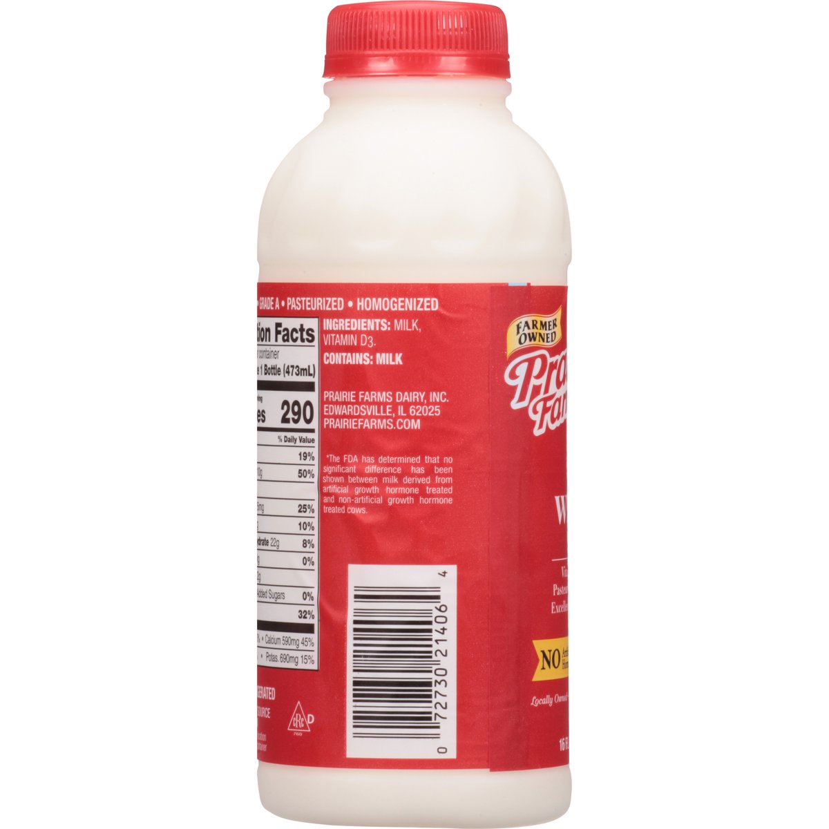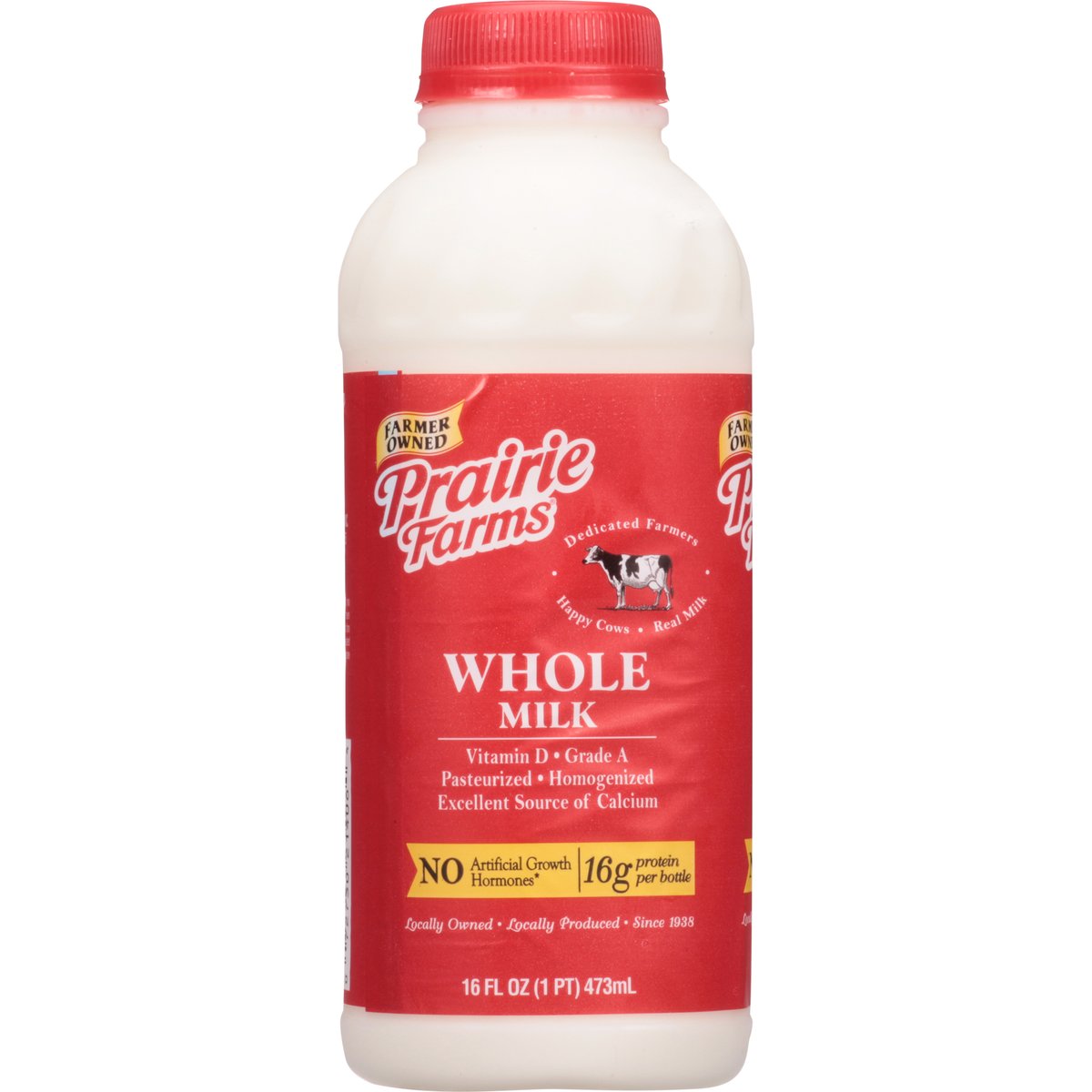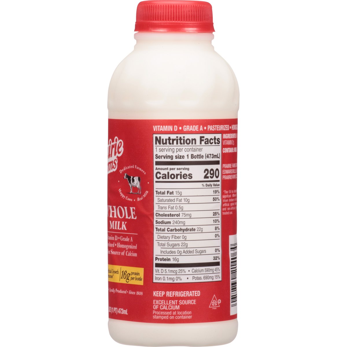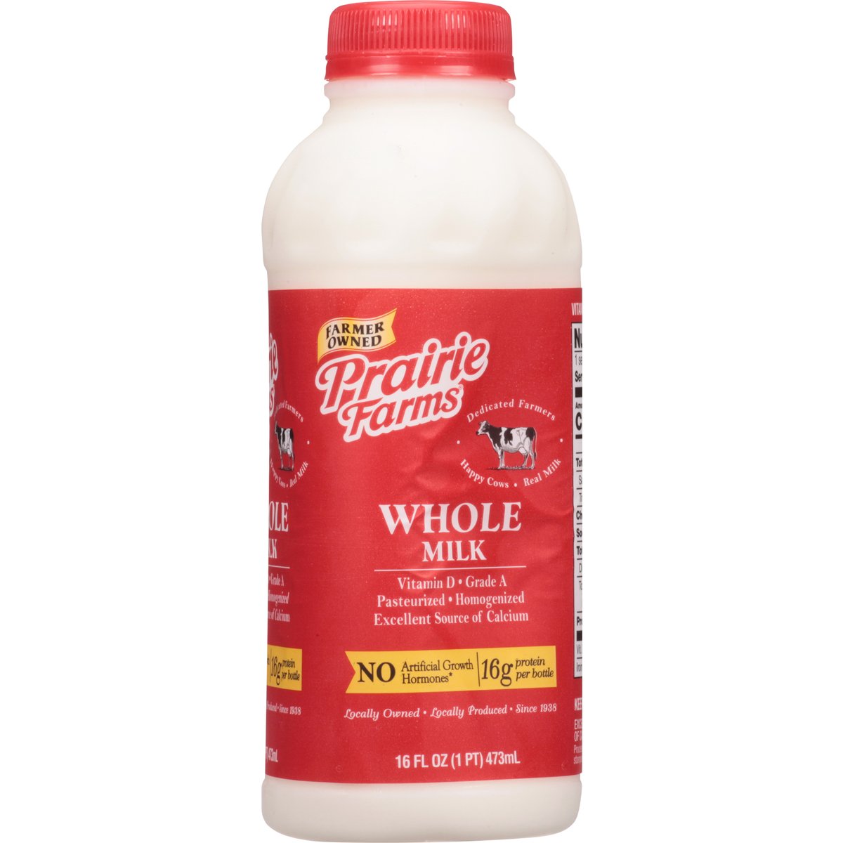 16 g protein per bottle. Excellent source of calcium. Vitamin D. Farmer owned. Dedicated farmers. Happy cows. Real milk. Pasteurized. Homogenized. No artificial growth hormones (The FDA has determined that no significant difference has been shown between milk derived from artificial growth hormone treated and non - artificial growth hormone treated cows). Locally owned. Locally produced. Since 1938. Processed at location stamped on container. Grade A. prairiefarms.com.