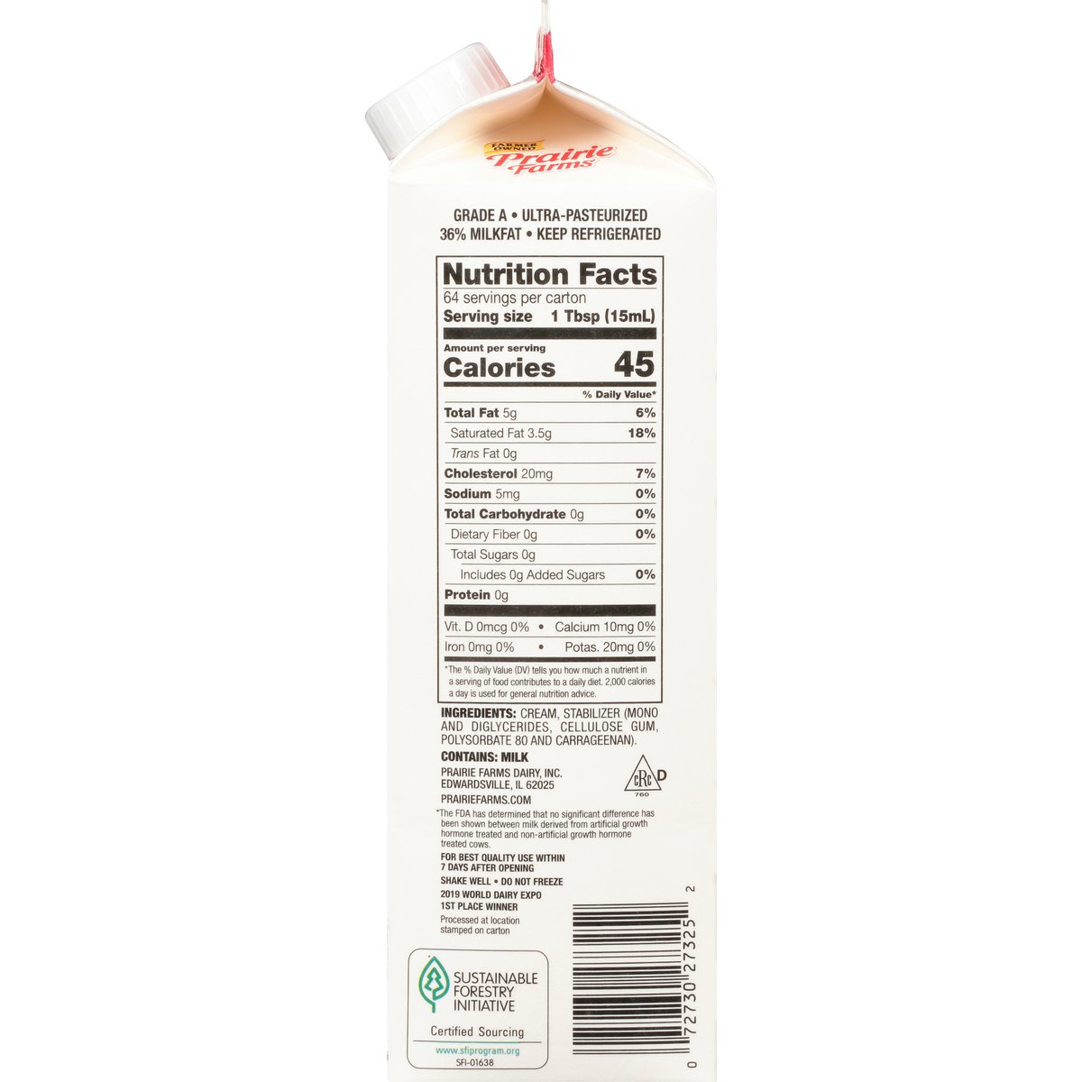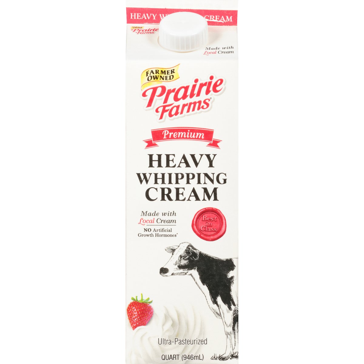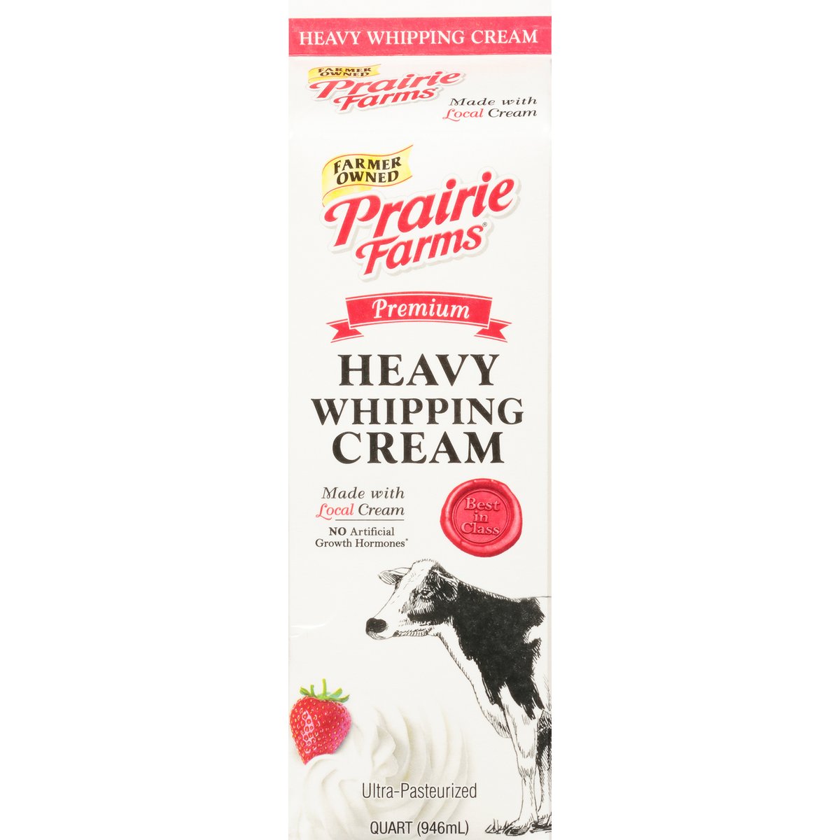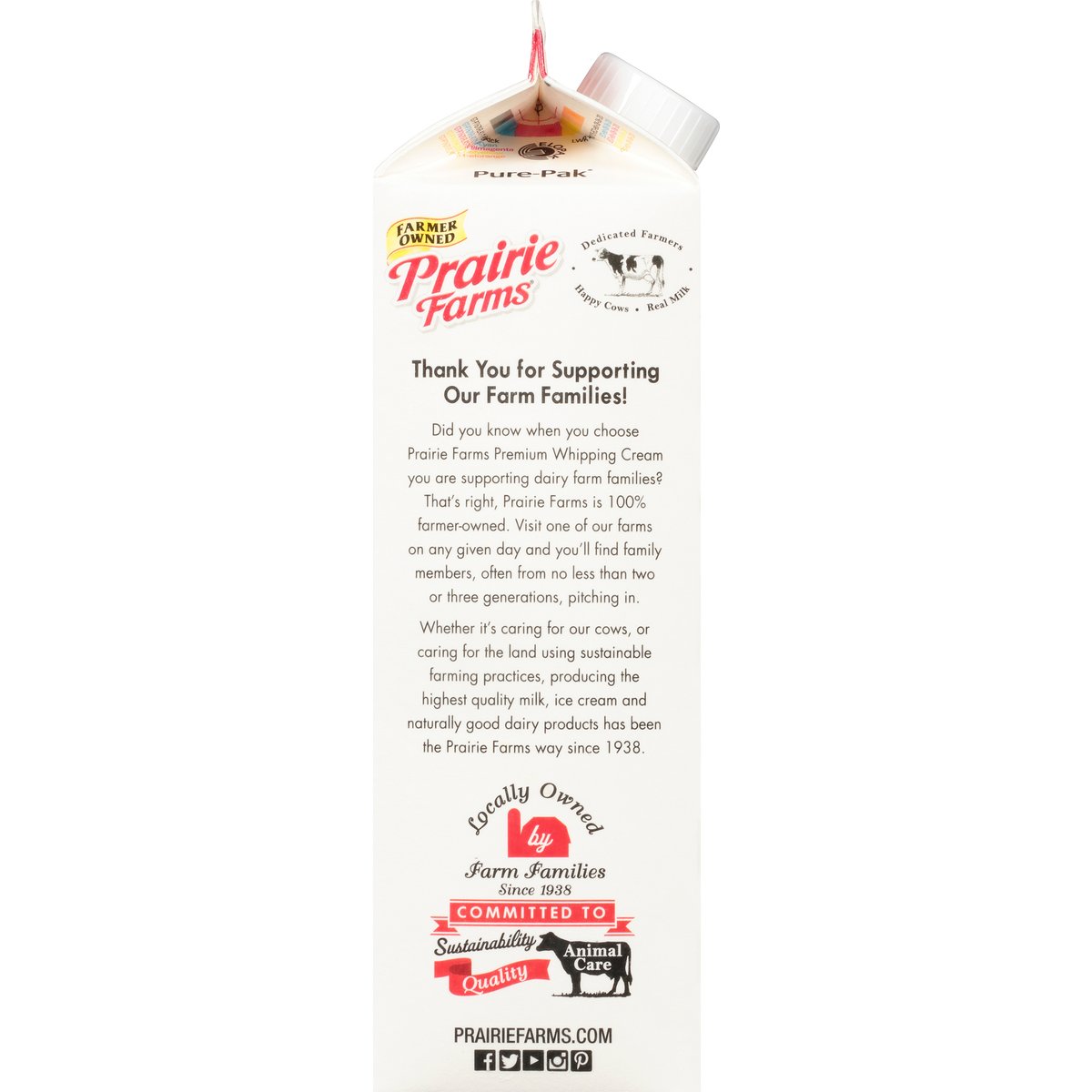 36% Milk fat. Best in class. Ultra-pasteurized. Thank you for supporting our farm families. Did you know when you choose Prairie Farms Premium Whipping Cream you are supporting dairy farm families? That's right, Prairie Farms is 100% farmer-owned. Visit one of our farms on any given day and you'll find family members, often from no less than two or three generations, pitching in. Whether it's caring for our cows, or caring for the land using sustainable farming practices, producing the highest quality milk, ice cream and naturally good dairy products has been the Prairie Farms way since 1938. Locally owned by Farm families since 1938. Dedicated farmers. Happy cows. Real milk. Ultra-Pasteurized. No artificial growth hormones (The FDA has determined that no significant difference has been shown between milk derived from artificial growth hormone treated and non-artificial growth hormone treated cows). Farmer owned. Grade A. Prairiefarms.com. Facebook. Twitter. YouTube. Instagram. Pinterest. 2019 World Dairy Expo 1st Place Winner. Pure-pak. Recyclable. Sustainable Forestry Initiative: Certified fiber sourcing. www.sfiprogram.org.