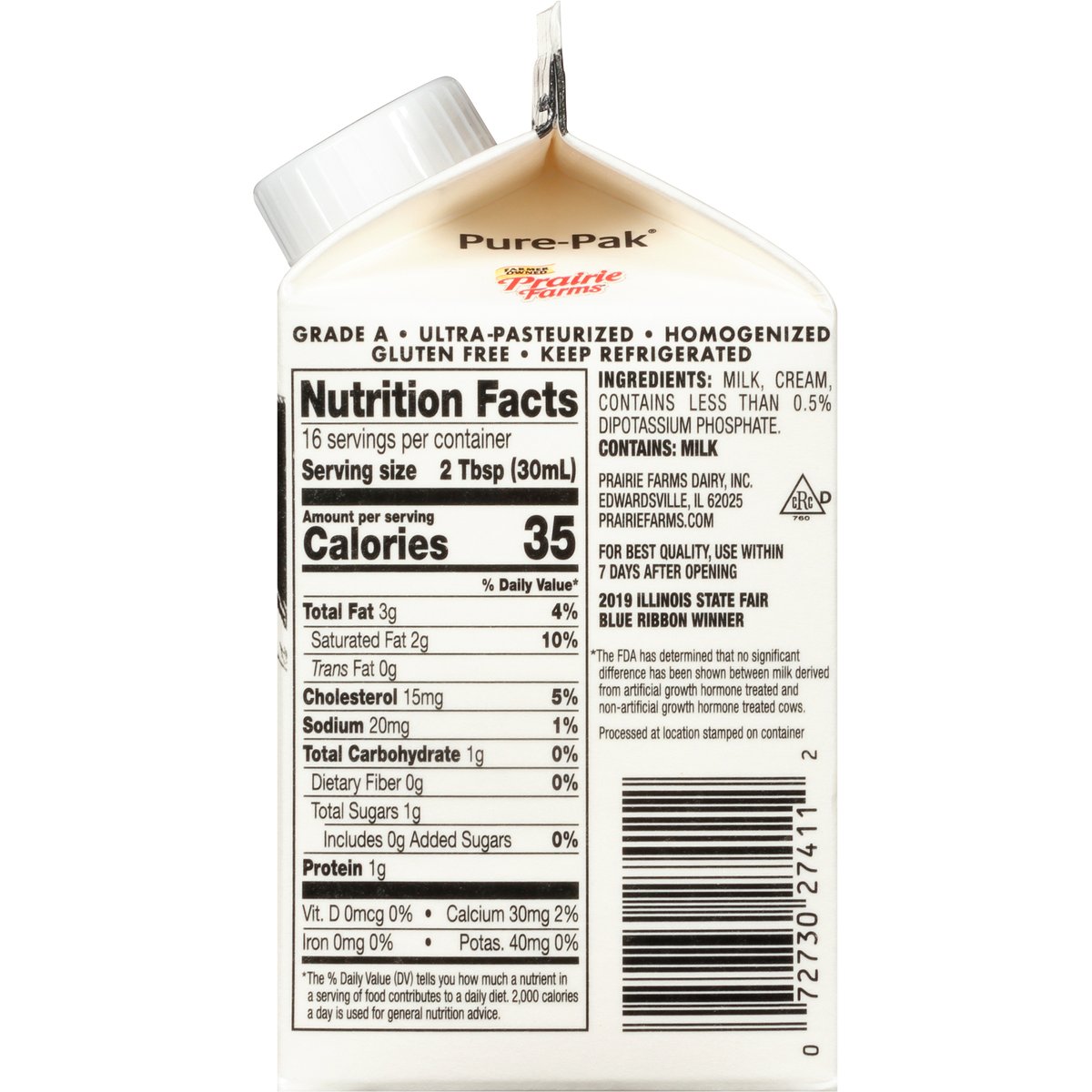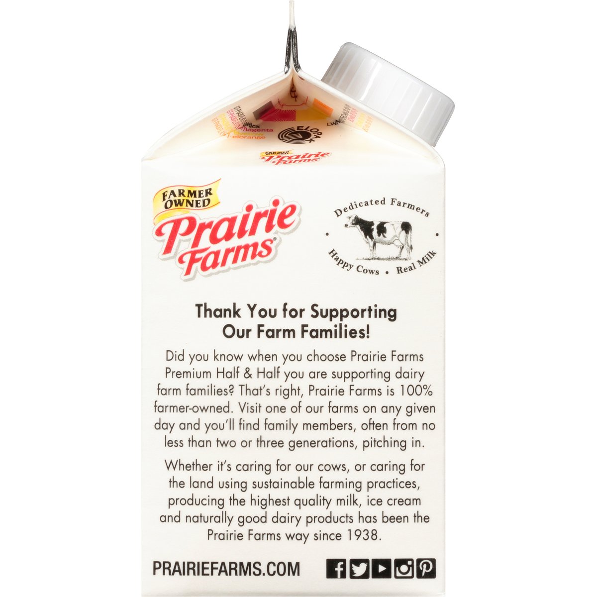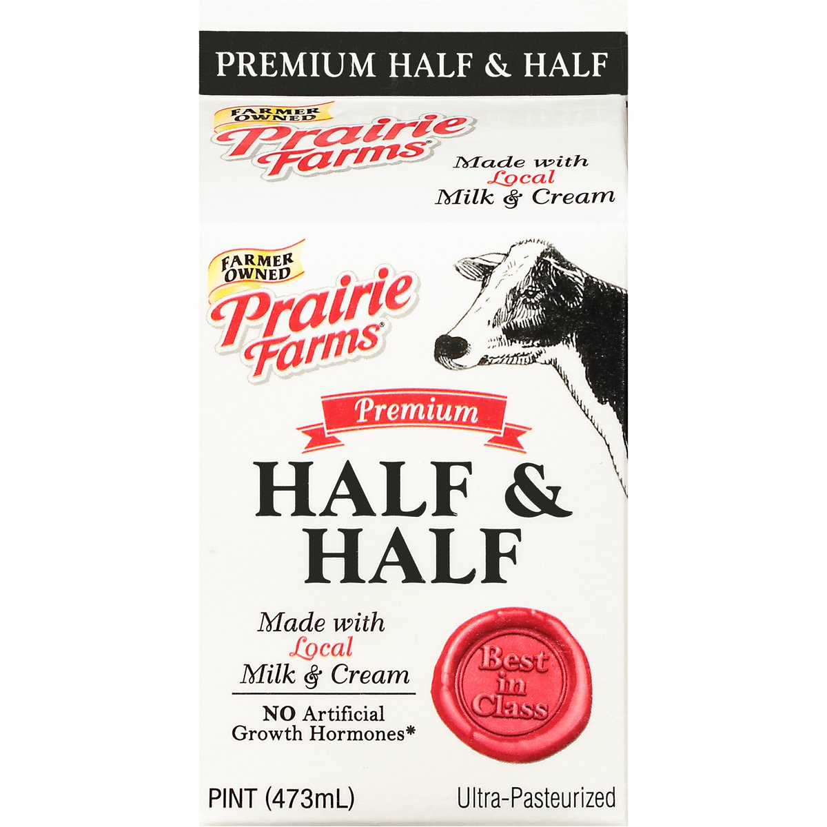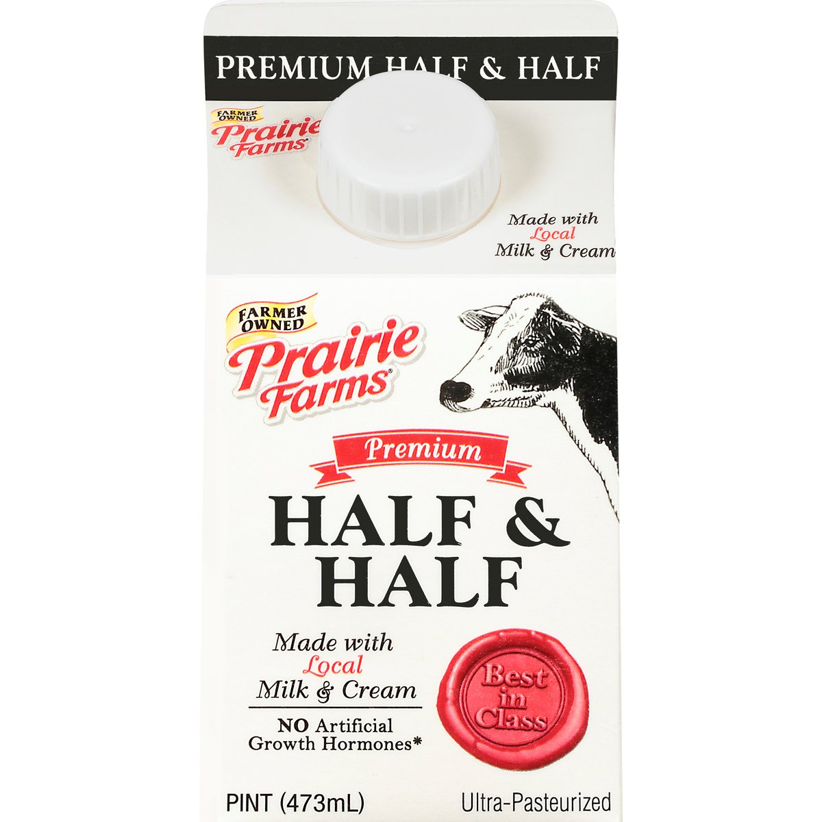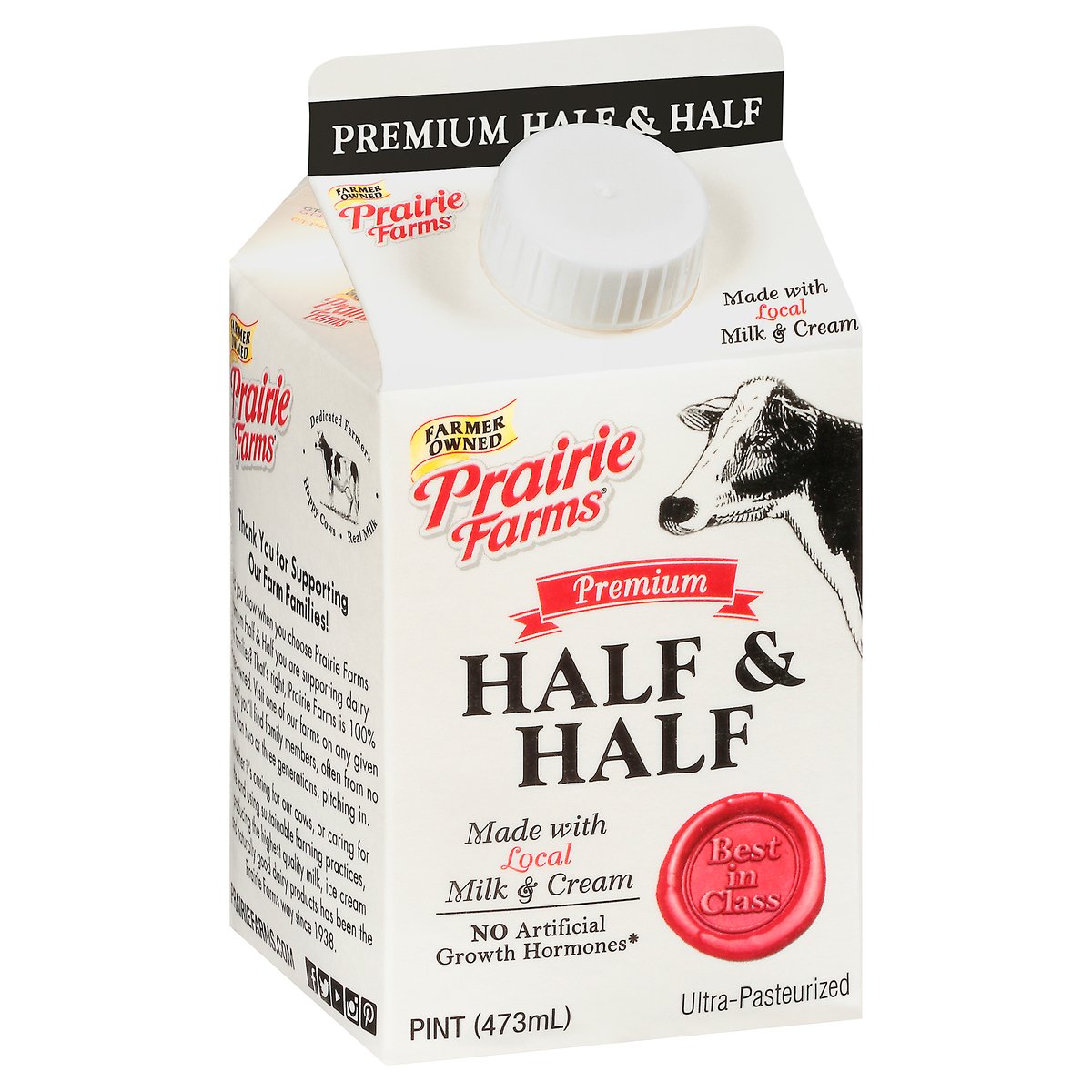 Made with local milk & cream. Gluten free. No artificial growth hormones (The FDA has determined that no significant difference has been shown between milk derived from artificial growth hormone treated and non-artificial growth hormone treated cows). Farmer owned. Best in class. Ultra-pasteurized. Dedicated farmers. Happy cows. Real milk. Thank you for supporting our farm families! Did you know when you choose Prairie Farms Premium Half & Half you are supporting dairy farm families? That's right, Prairie Farms is 100% farmer-owned. Visit one of our farms on any given day and you'll find family members, often from no less than two or three generations, pitching in. Whether it's caring for our cows, or caring for the land using sustainable farming practices, producing the highest quality milk, ice cream and naturally good dairy products has been the Prairie Farms way since 1938. Homogenized. 2019 Illinois State fair blue ribbon winner. Grade A. prairiefarms.com. Facebook. Twitter. YouTube. Instagram. Pinterest. Recyclable.