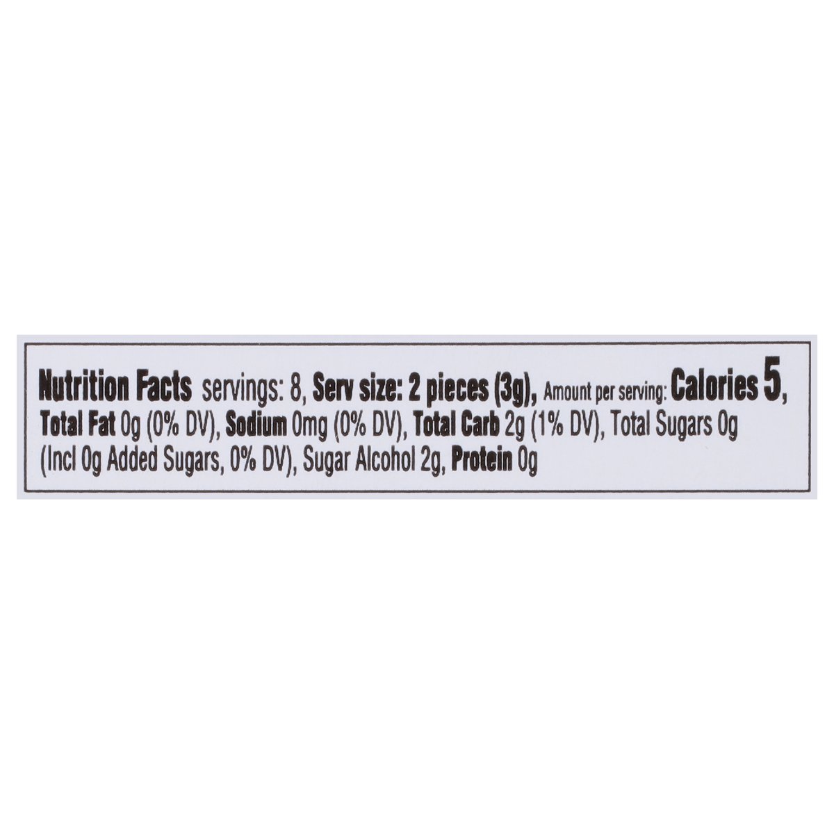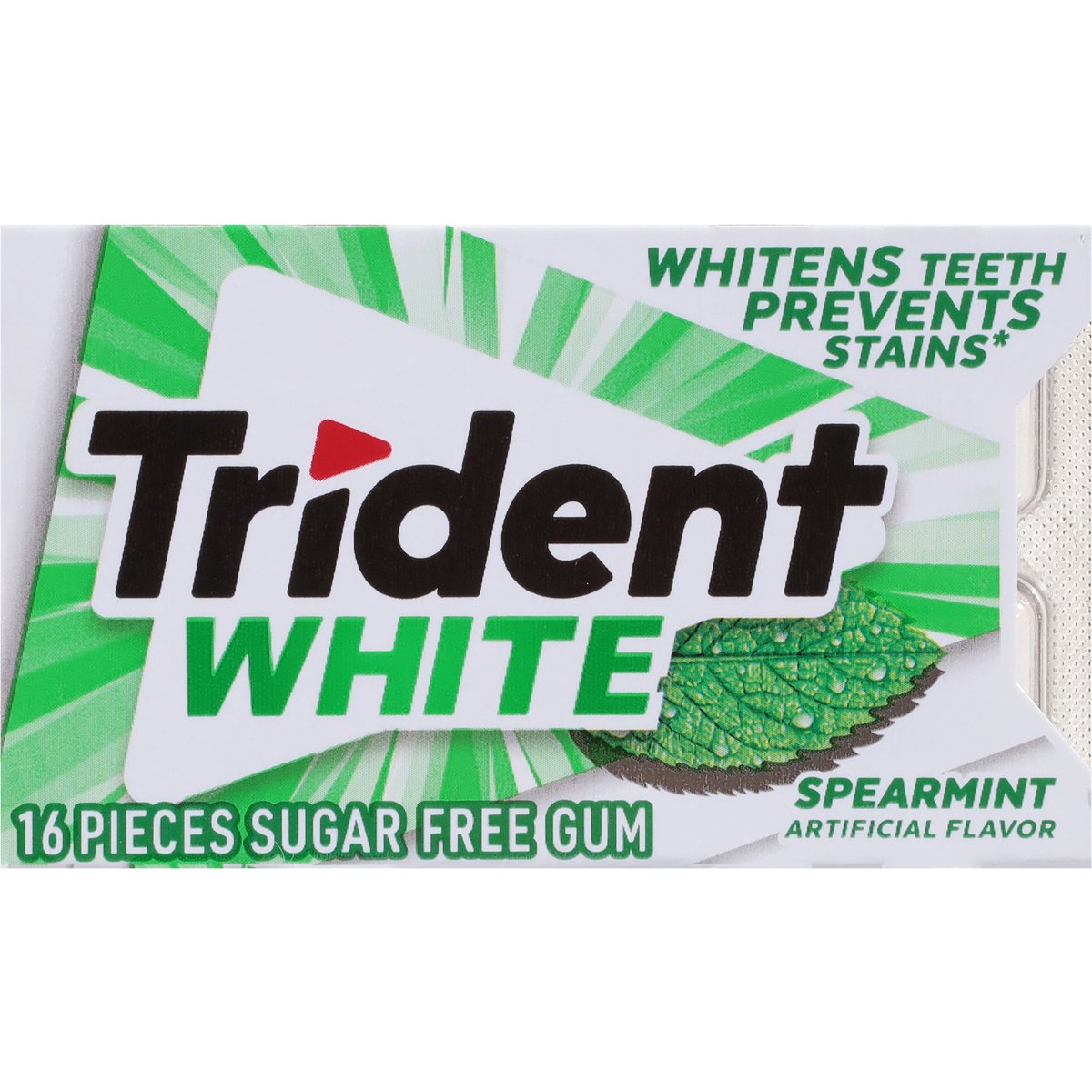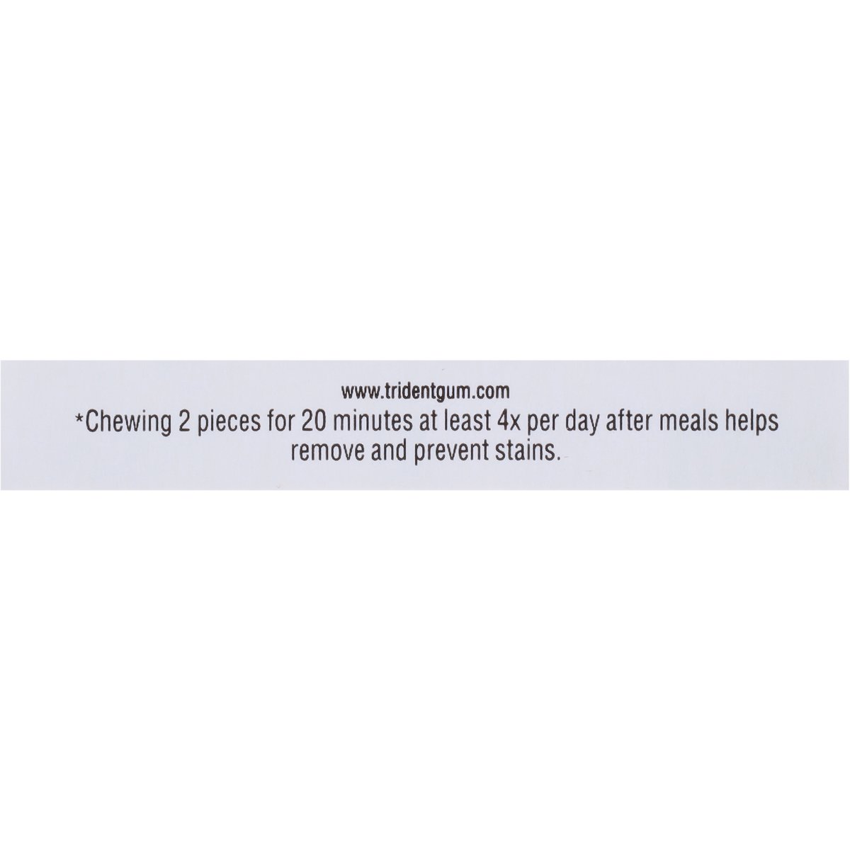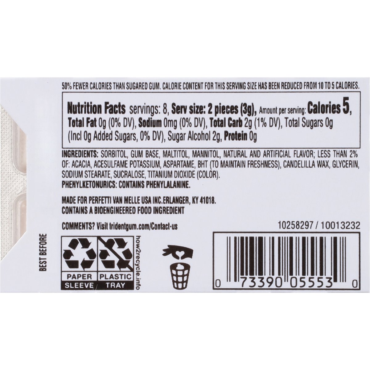 Artificial flavor. Sugar Free. 50% fewer calories than sugared gum. Calorie content for this serving size has been reduced from 10 to 5 calories. Contains a bioengineered food ingredient. Whitens teeth prevents stains*. * Chewing 2 pieces for 20 minutes at least 4x per day after meals helps remove and prevent stains. www.tridentgum.com. how2recycle.info. Comments? Visit tridentgum.com/Contact-us.