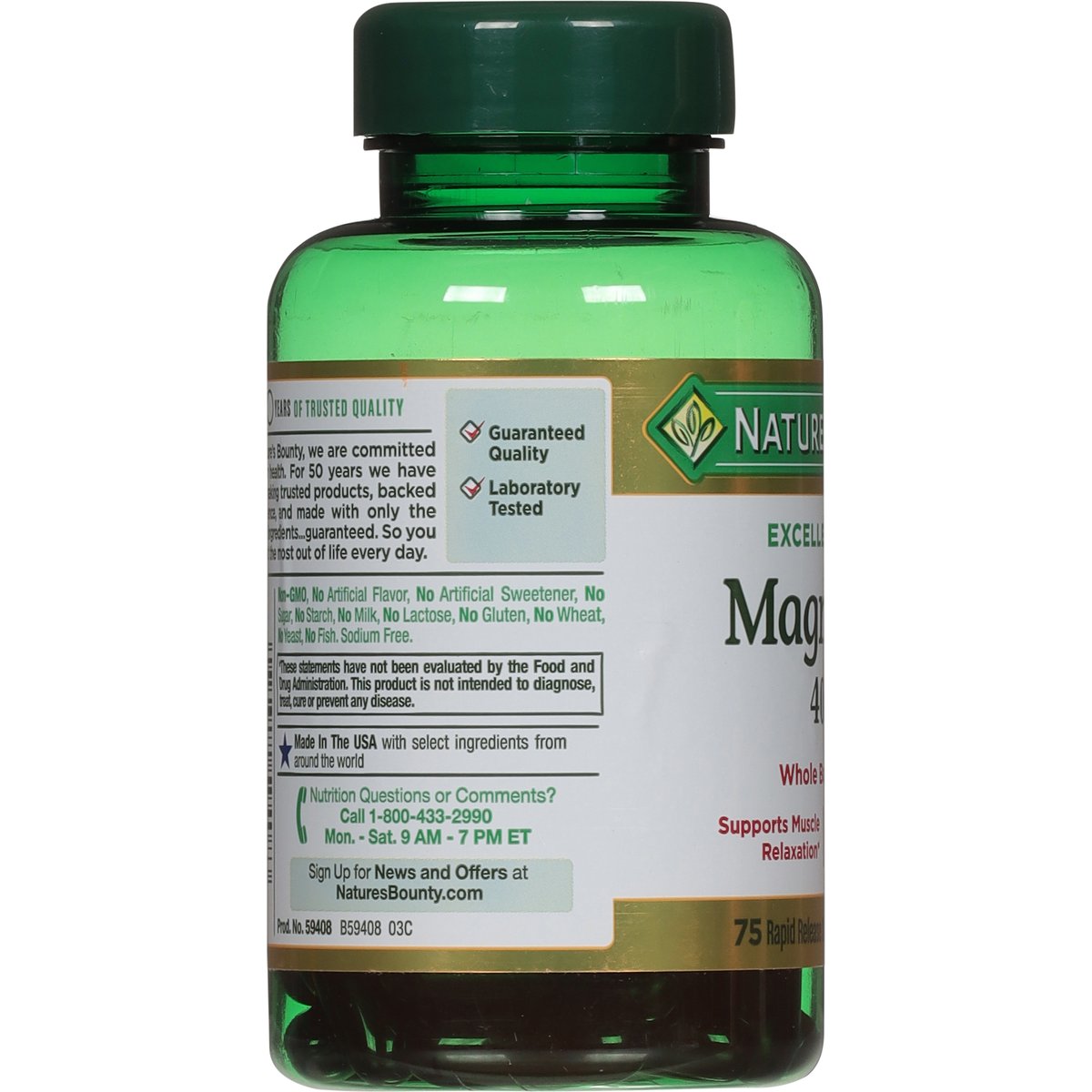 No artificial flavor, no artificial sweetener, no sugar, no starch, no milk, no lactose, no gluten, no wheat, no yeast, no fish. Sodium free. Non-GMO. Excellent source. Whole body support. Supports muscle relaxation. Support heart, nerve & bone health. 50 years of trusted quality. At Nature's Bounty, we are committed to your health. For 50 years we have been making trusted products, backed by science, and made with only the purest ingredients guarantee. So you can get the most out of life every day. Guaranteed quality. Laboratory tested. NaturesBounty.com. Nutrition questions or comments? Call 1 - 800-433-2990 Mon. - Sat. 9 AM - 7 PM ET. Sing up for news and offers at NaturesBounty.com. (These statements have not been evaluated by the Food and Drug Administration. This product is not intended to diagnose, treat, cure or prevent any disease.) Made in the USA with select ingredients from around the world.
