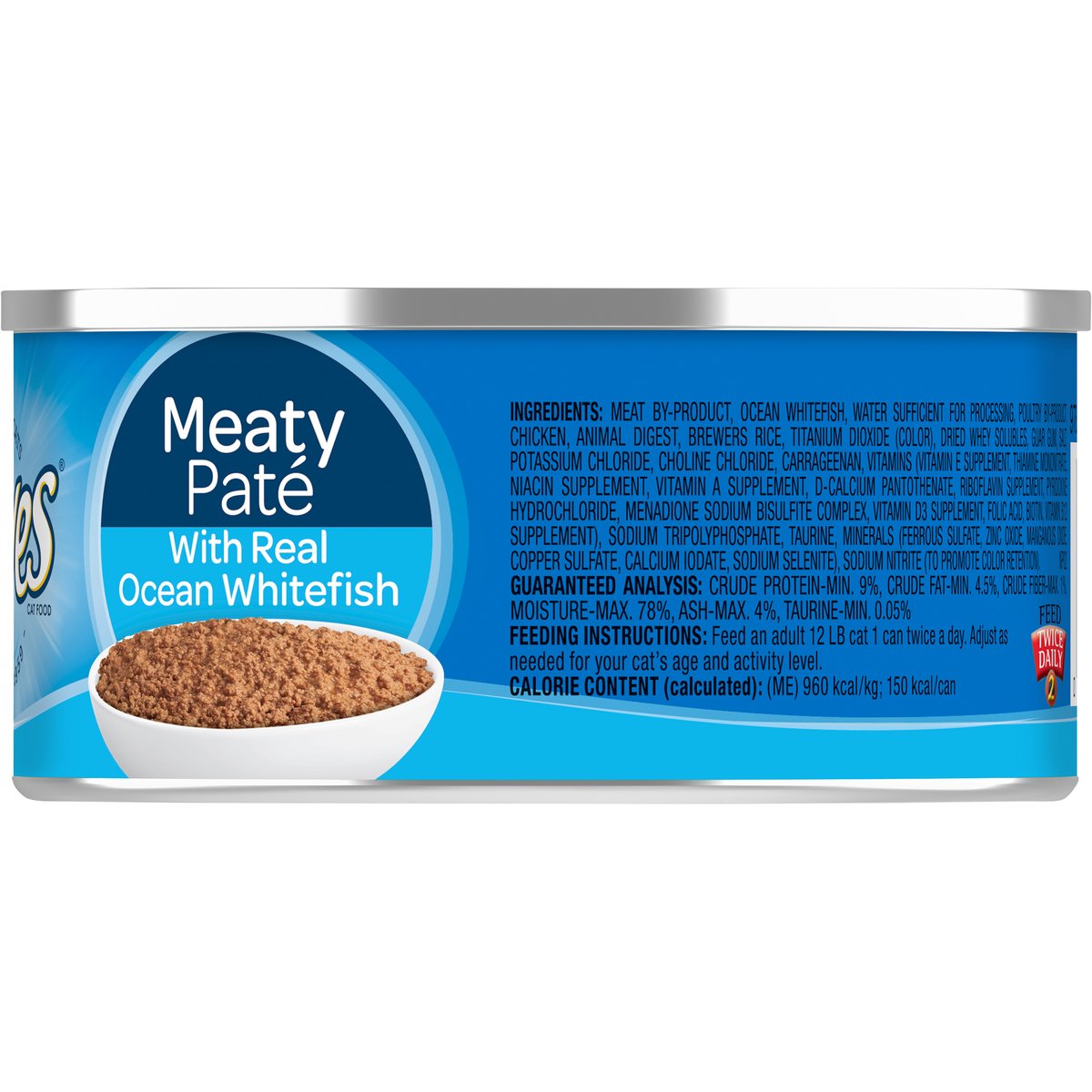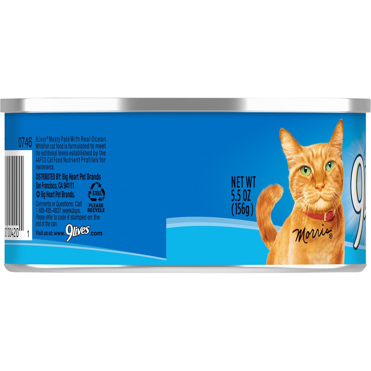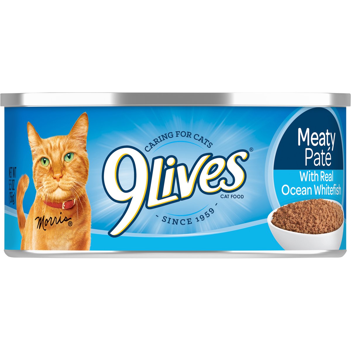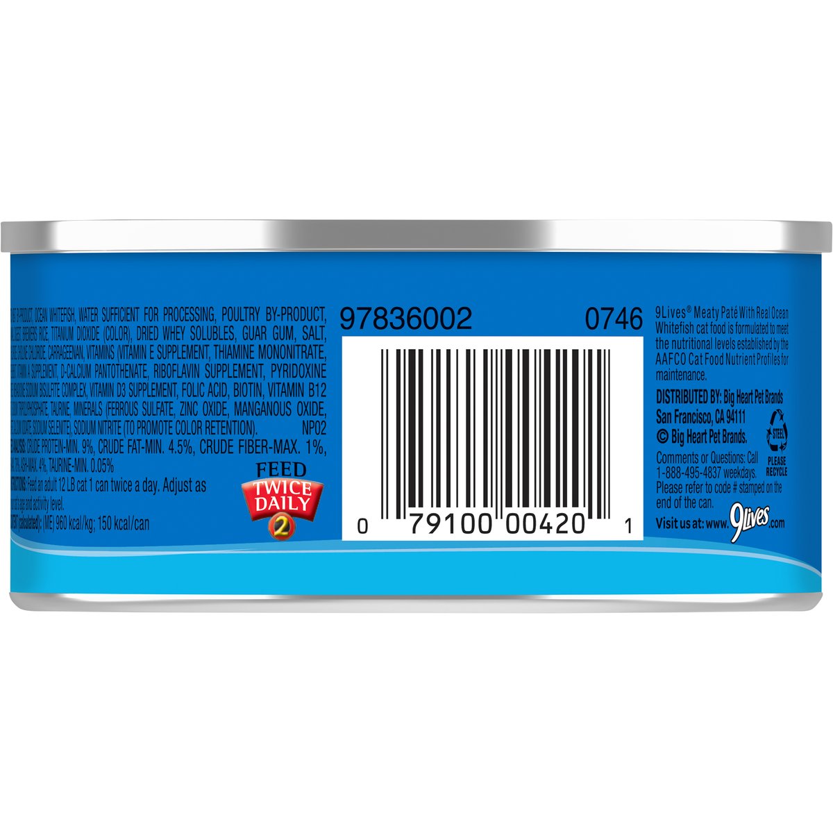 Calorie Content (calculated): (ME) 960 kcal/kg; 150 kcal/can. 9Lives Meaty Pate With Real Ocean Whitefish cat food is formulated to meet the nutritional levels established by the AAFCO Cat Food Nutrient Profiles for maintenance. With real ocean whitefish. Caring for cats. Since 1959. www.9lives.com. Comments or Questions: Call 1-888-495-4837 weekdays. Please refer to code # stamped on the end of the can. Visit us at: www.9lives.com. Please recycle.