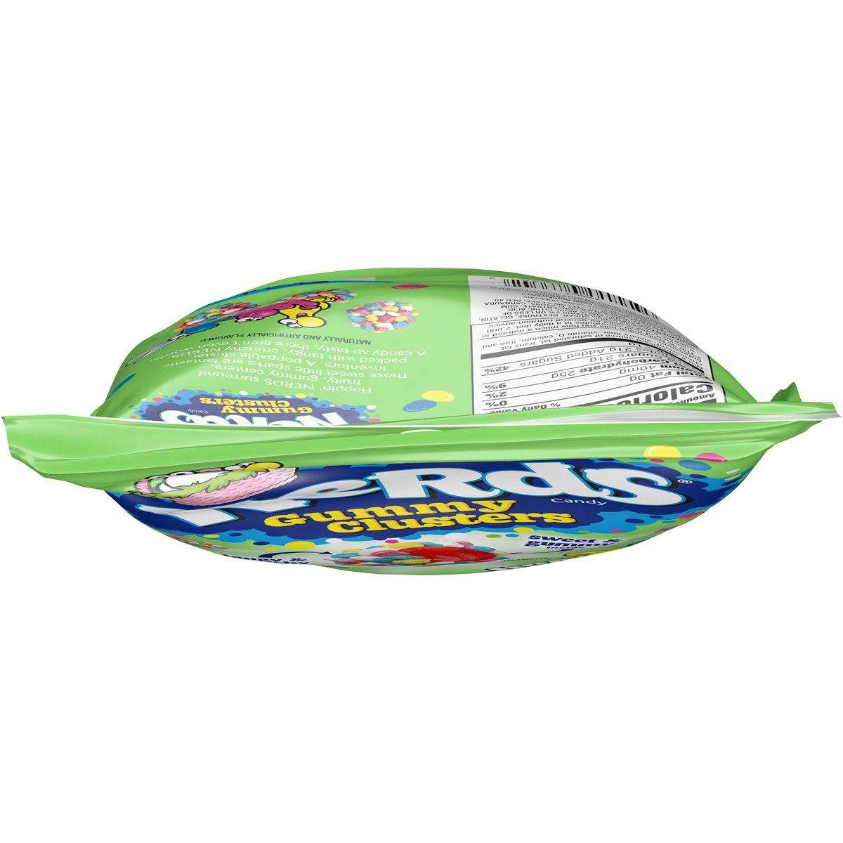 Naturally and artificially flavored. 100 calories per serving. Contains bioengineered food ingredients. Tasty & crunchy outside. sweet & gummy inside. Hoppin' nerds surround fruity, gummy centers. Those sweet little sparks are fantastic inventors. A poppable cluster, packed with tangy, crunchy nerds. A candy so tasty, there aren't even words. www.nerdscandy.com. Facebook. Twitter. TikTok Get in touch. Call/text 1-800-504-4018. www.ferrarausa.com. Please have package available when reaching out. Reclosable