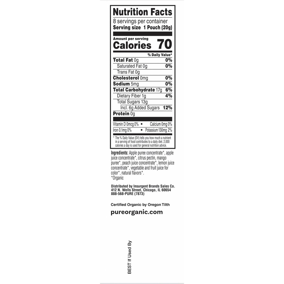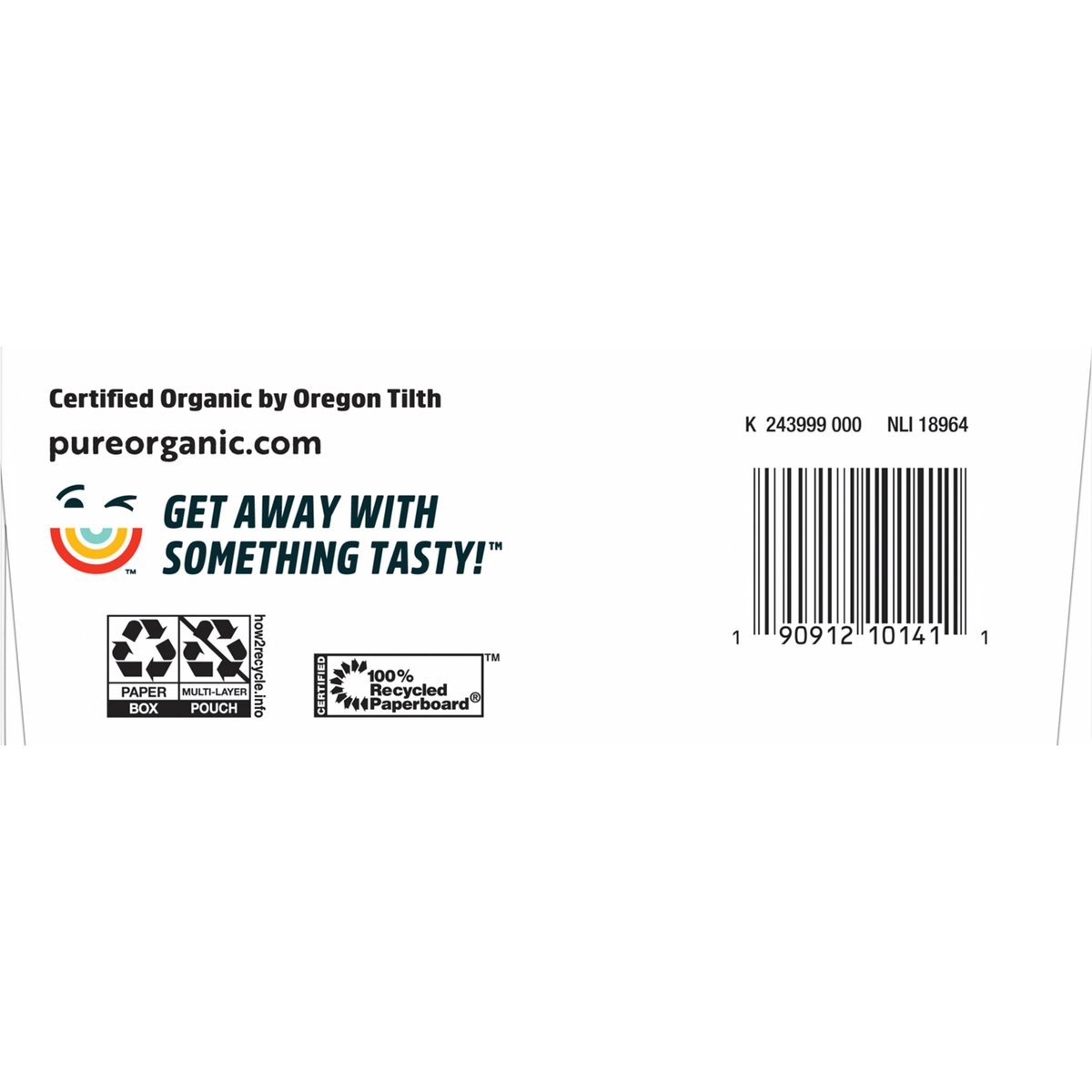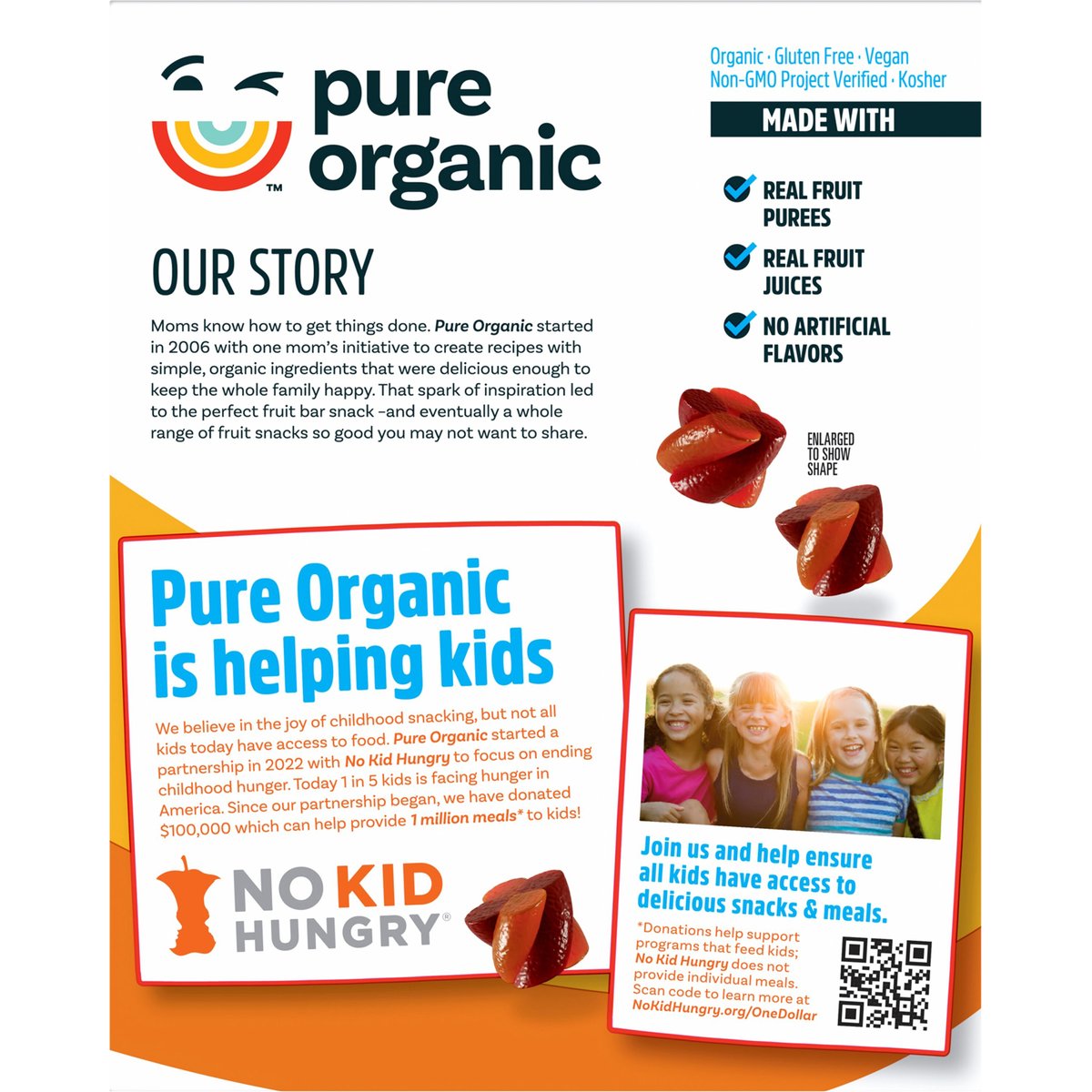 Naturally flavored with other natural flavors. USDA Organic. Certified Organic by Oregon Tilth. Certified gluten free. gfco.org. Vegan. Organic. Gluten-free. Non-GMO Project verified. nongmoproject.org. Our Story: Moms know how to get things done. Pure Organic started in 2006 with one mom’s initiative to create recipes with simple, organic ingredients that were delicious enough to keep the whole family happy. That spark of inspiration led to the perfect fruit bar snack - and eventually a whole range of fruit snacks so good you may not want to share. No artificial flavors. Get away with something tasty! pureorganic.com. how2recycle.info Pure Organic is helping kids. We believe in the joy of childhood snacking, but not all kids today have access to food. Pure Organic started a partnership in 2022 with No Kid Hungry to focus on ending childhood hunger. Today 1 in 5 kids is facing hunger in America. Since our partnership began, we have donated $100,000 which can help provide 1 million meals* to kids! No Kid Hungry. Join us and help ensure all kids have access to delicious snacks & meals. * Donations help support programs that feed kids; No Kid Hungry does not provide individual meals. Scan code to learn more at NoKidHungry.org/OneDollar. Certified 100% recycled paperboard.
