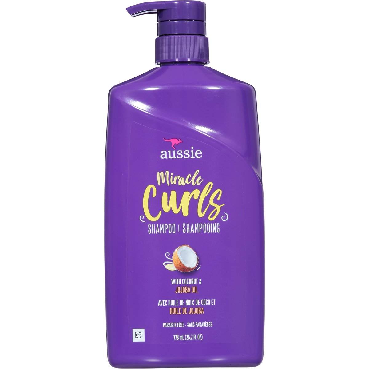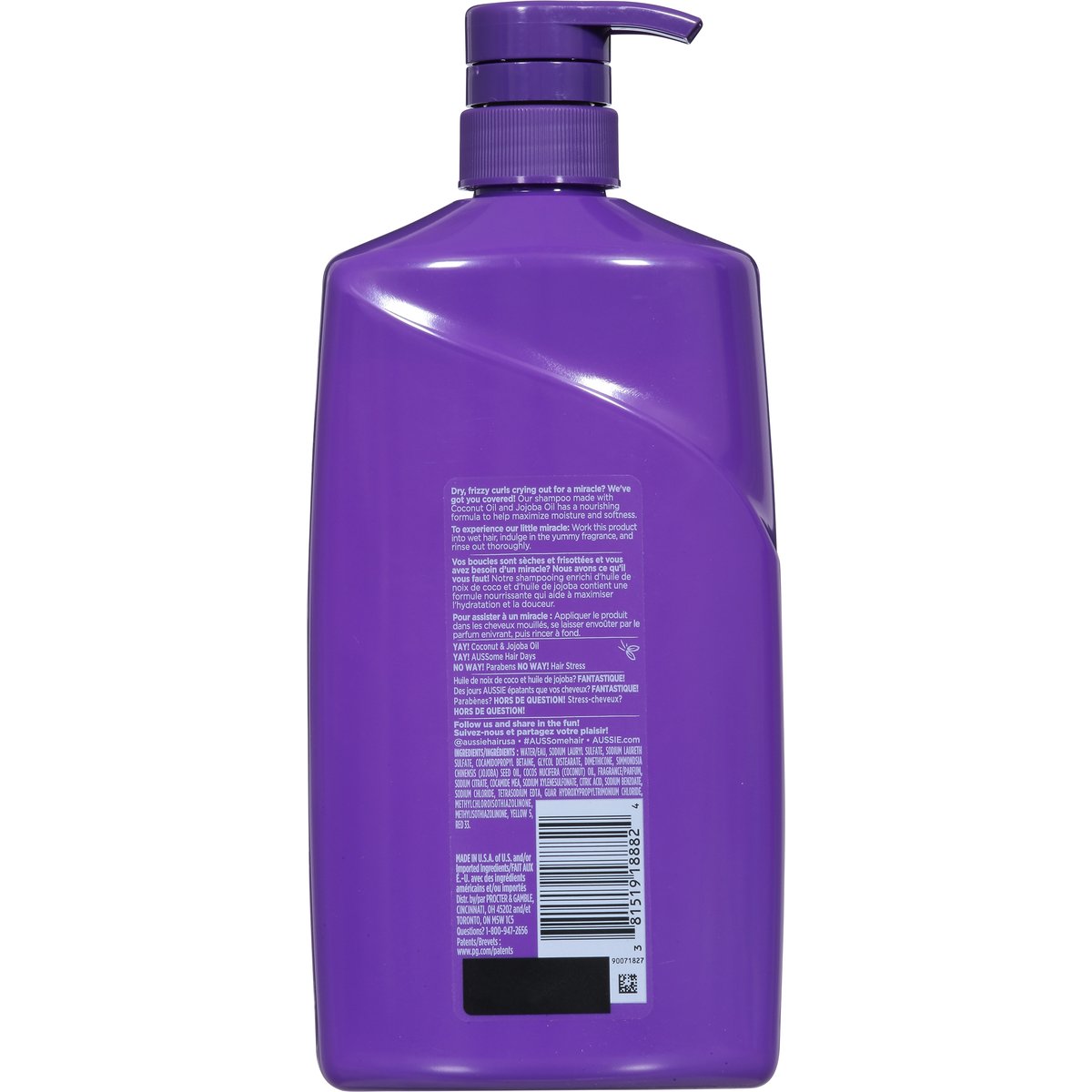 With coconut & jojoba oil. Paraben free. Dry, frizzy curls crying out for a miracle? We've got you covered! Our shampoo made with coconut oil and jojoba oil has a nourishing formula to help maximize moisture and softness. Yay! Coconut & jojoba oil. Yay! Aussome hair days. No way! Parabens no way! Hair stress. aussie.com. Follow us and share in the fun! (at)aussiehairusa. (hashtag)AUSSomehair. Questions? 1-800-947-2656. Made in U.S.A. of U.S. and/or imported ingredients.