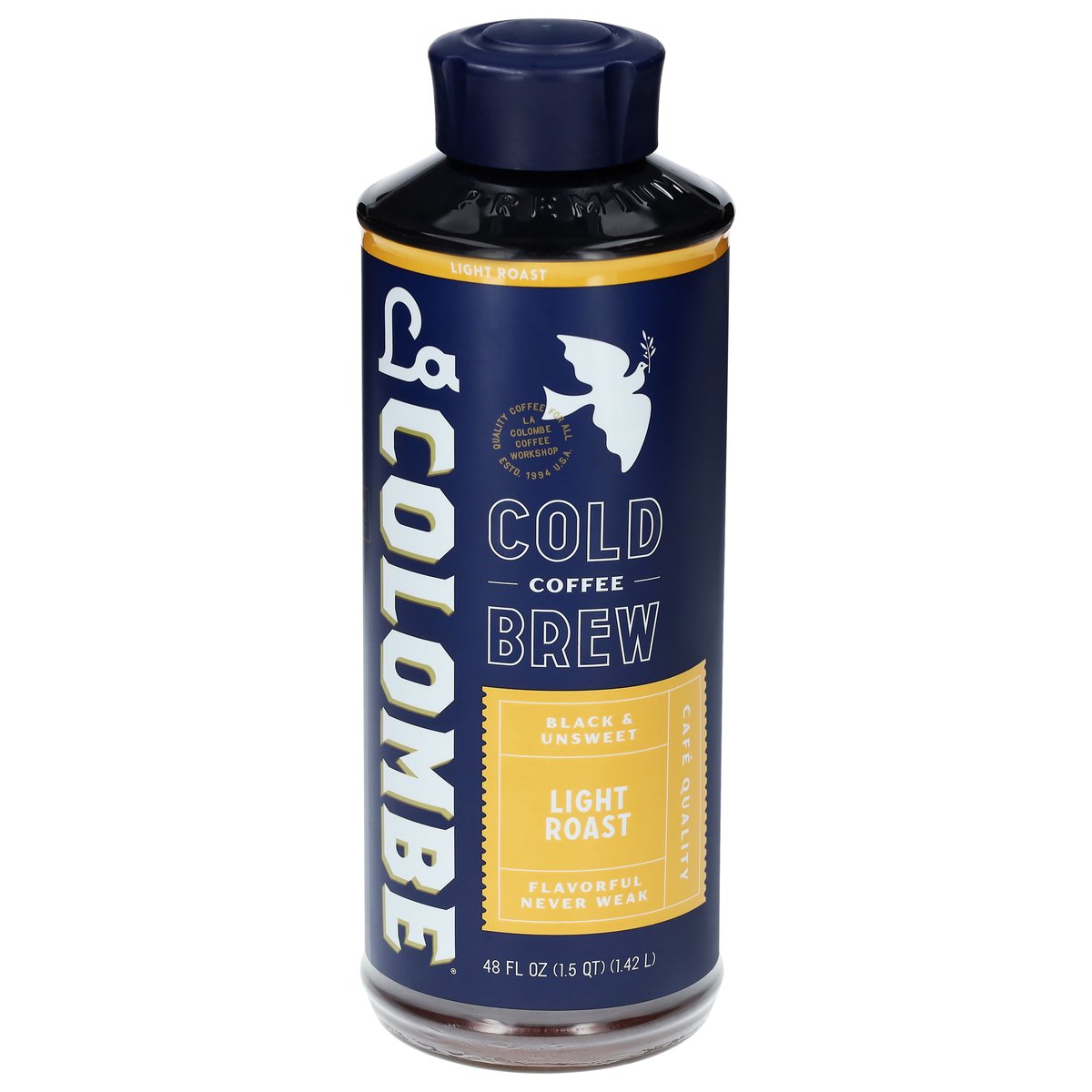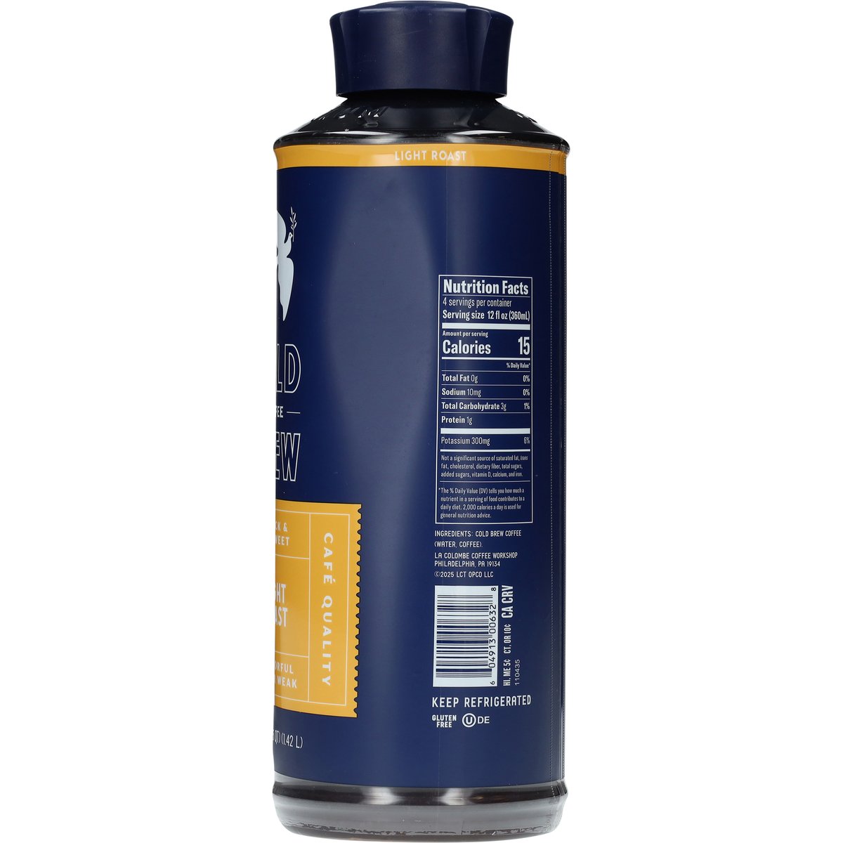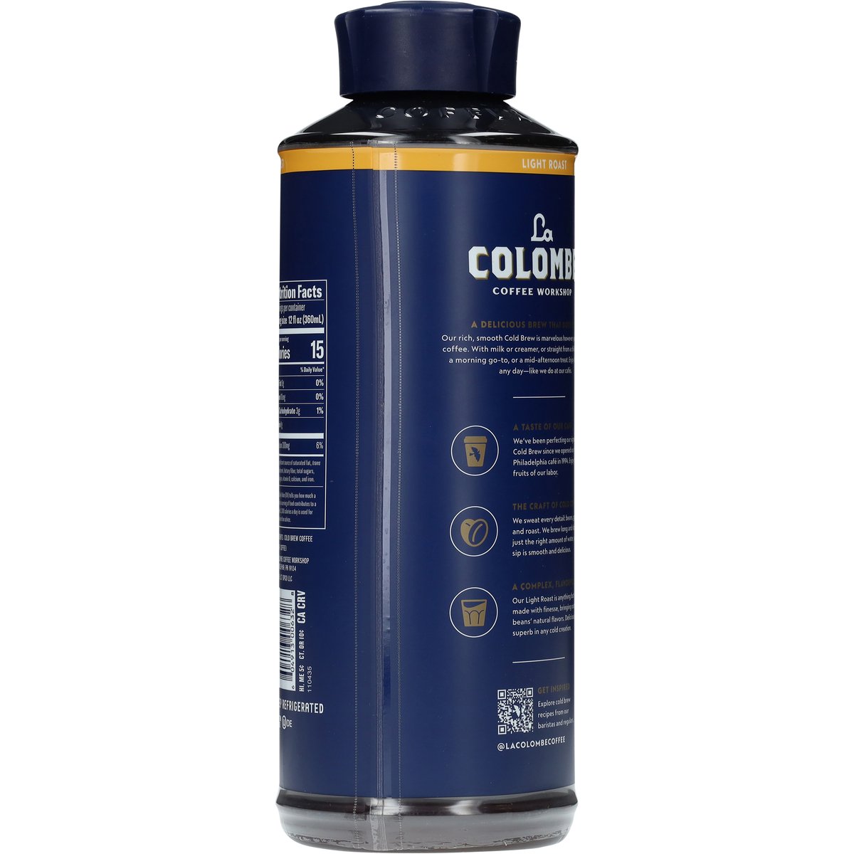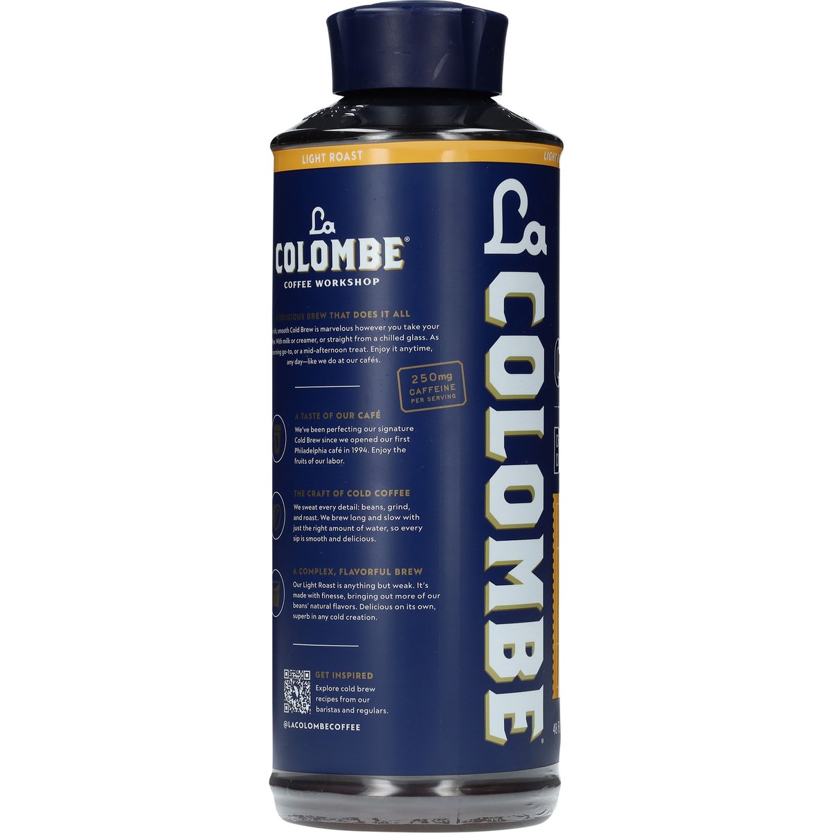 Gluten free. 250 mg caffeine per serving. Quality Coffee for All. LA Colombe Coffee Workshop. Estd. 1994 U.S.A. A Delicious Brew That Does It All: Our rich, smooth Cold Brew is marvelous however you take your coffee. With milk or creamer, or straight from a chilled glass. As a morning go-to, or a mid-afternoon treat. Enjoy it anytime, any day-like we do at our cafes. A Taste of Our Cafe: We've been perfecting our signature Cold Brew since we opened our first Philadelphia cafe in 1994. Enjoy the fruits of our labor. The Craft of Cold Coffee: We sweat every detail: beans, grind, and roast. We brew long and slow with just the right amount of water, so every sip is smooth and delicious. A Complex, Flavorful Brew: Our Light Roast is anything but weak. It's made with finesse, bringing out more of our beans' natural flavors. Delicious on its own, superb in any cold creation. Get Inspired: Explore cold brew recipes from our baristas and regulars. @lacolombecoffee.