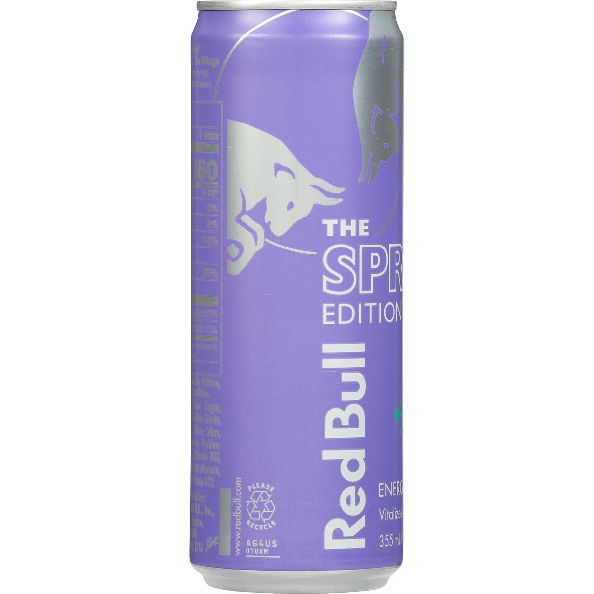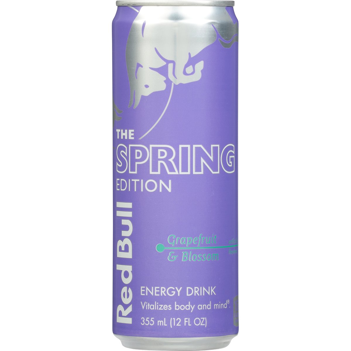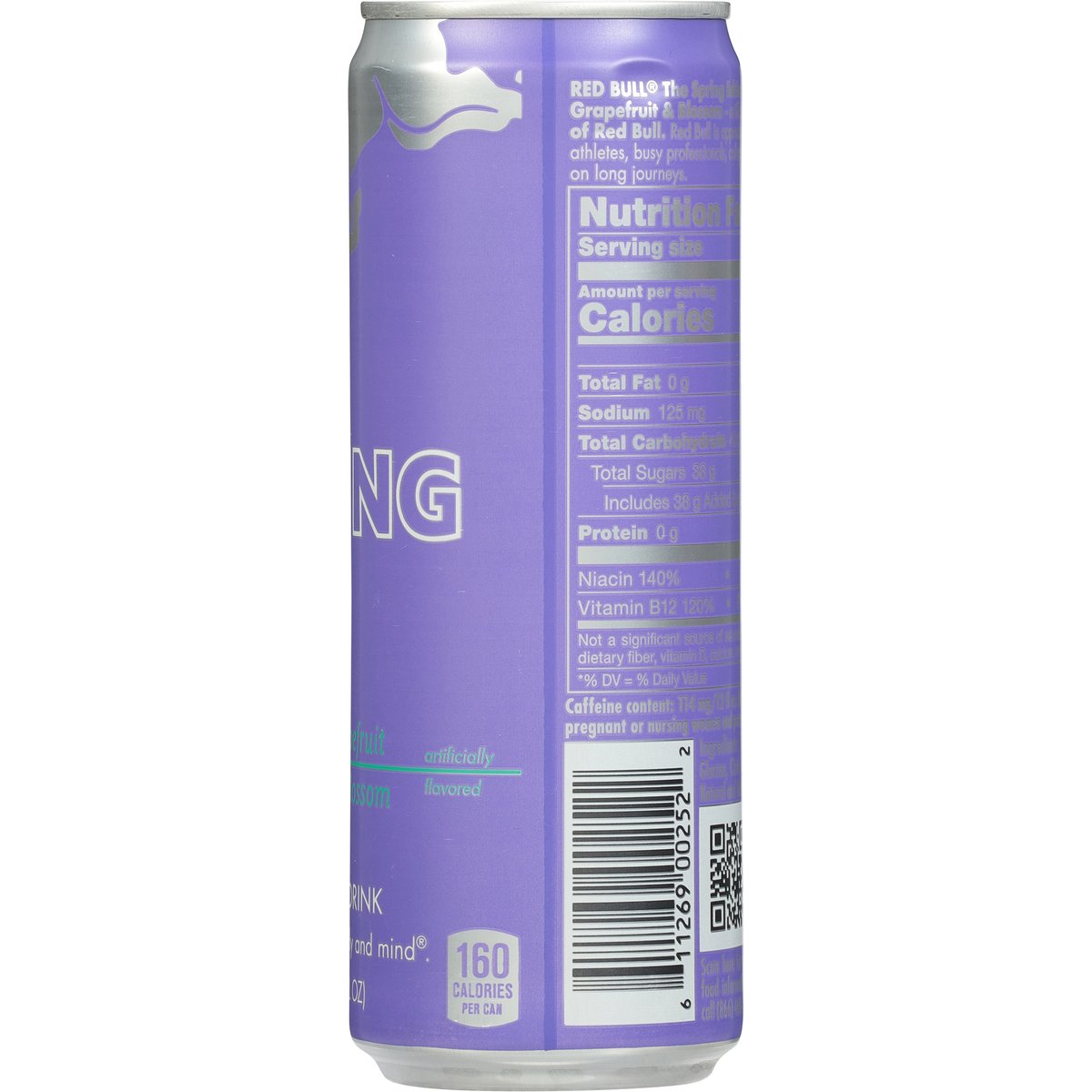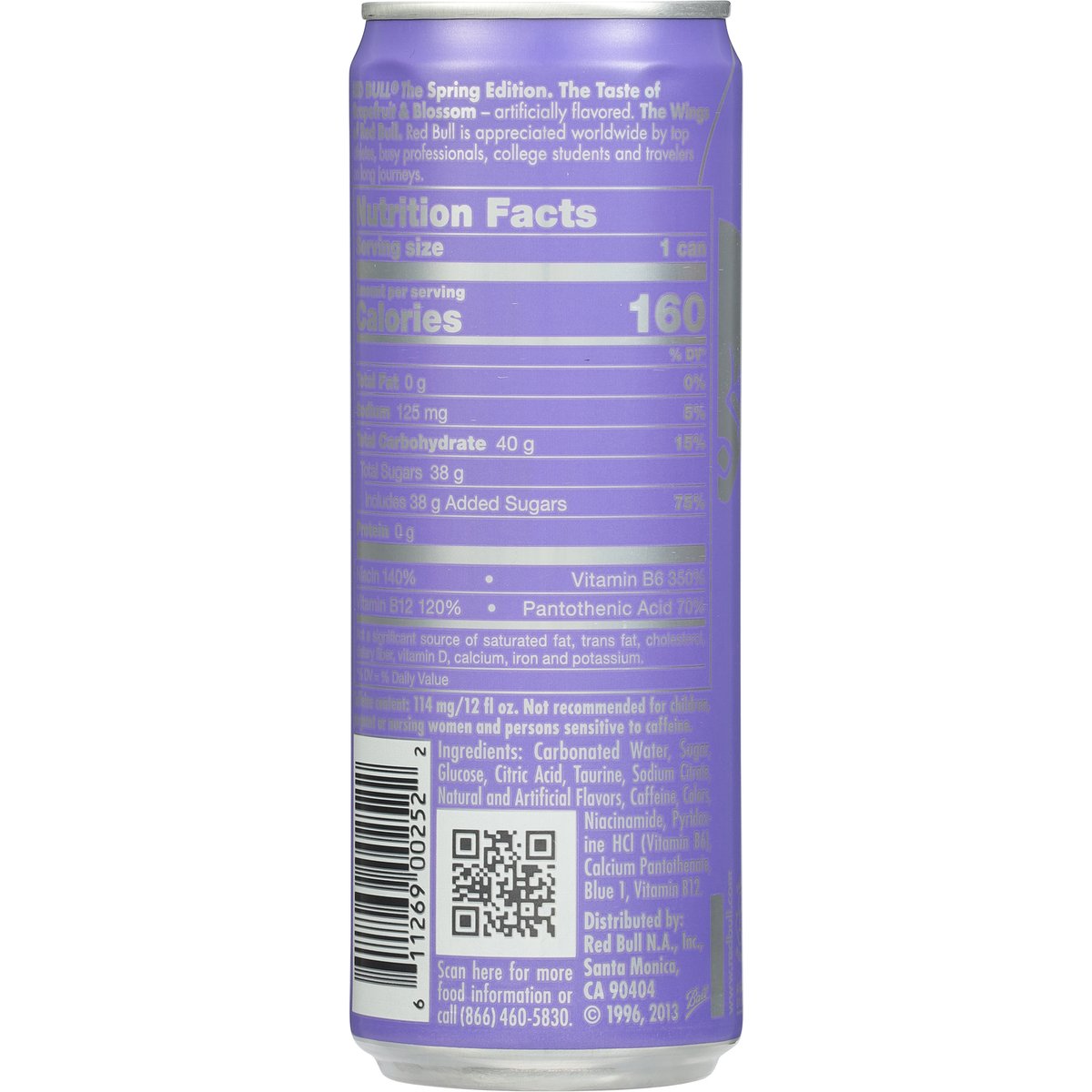 The Spring Edition Artificially flavored. 160 calories per can. Caffeine Content: 114 mg/12 fl oz. Red Bull the Spring Edition. The Taste of Grapefruit & Blossom - artificially flavored. The Wings of Red Bull. Red Bull is appreciated worldwide by top athletes, busy professionals, college students and travellers on long journeys. www.redbull.com. Scan for more food information or call (866) 460-5830. Please recycle.