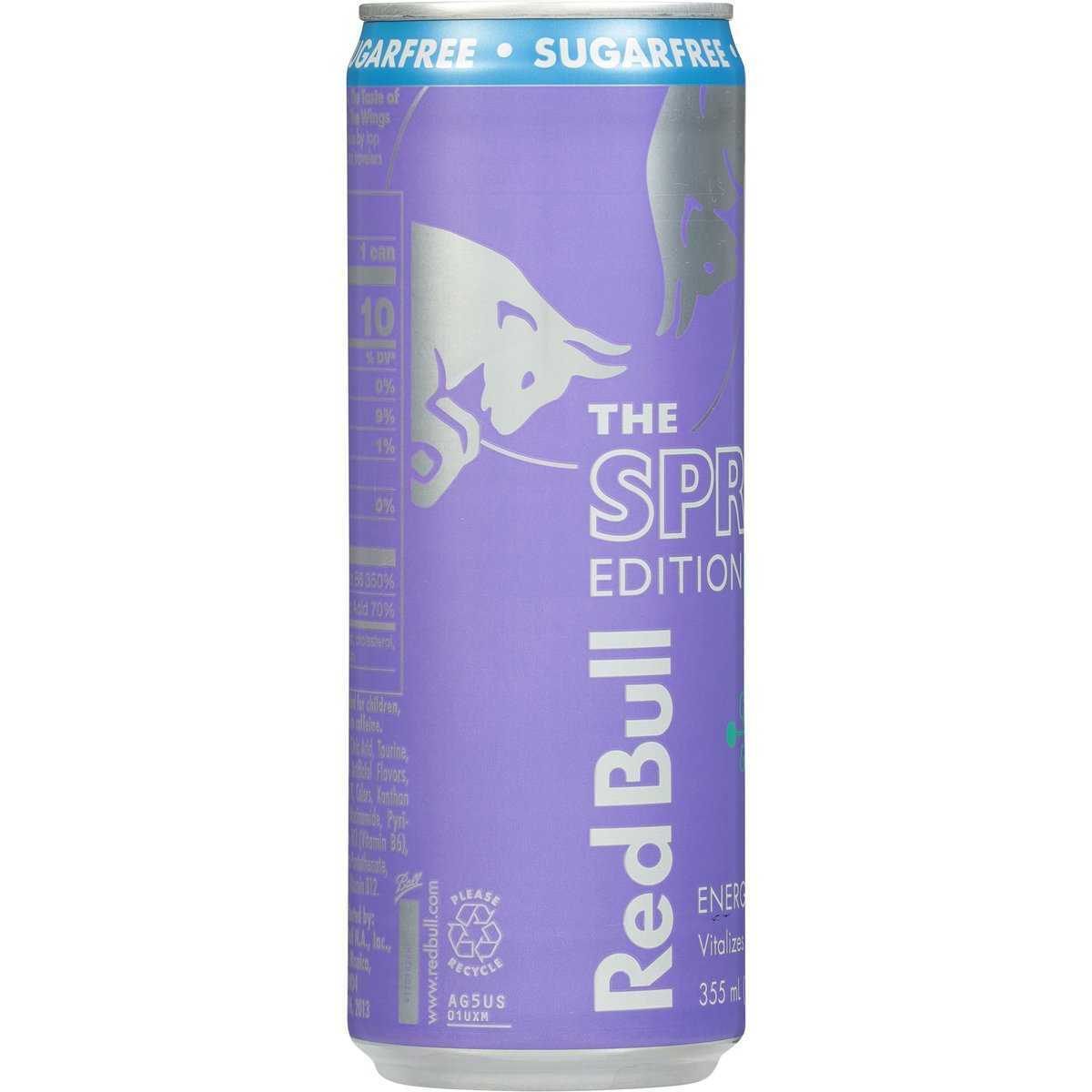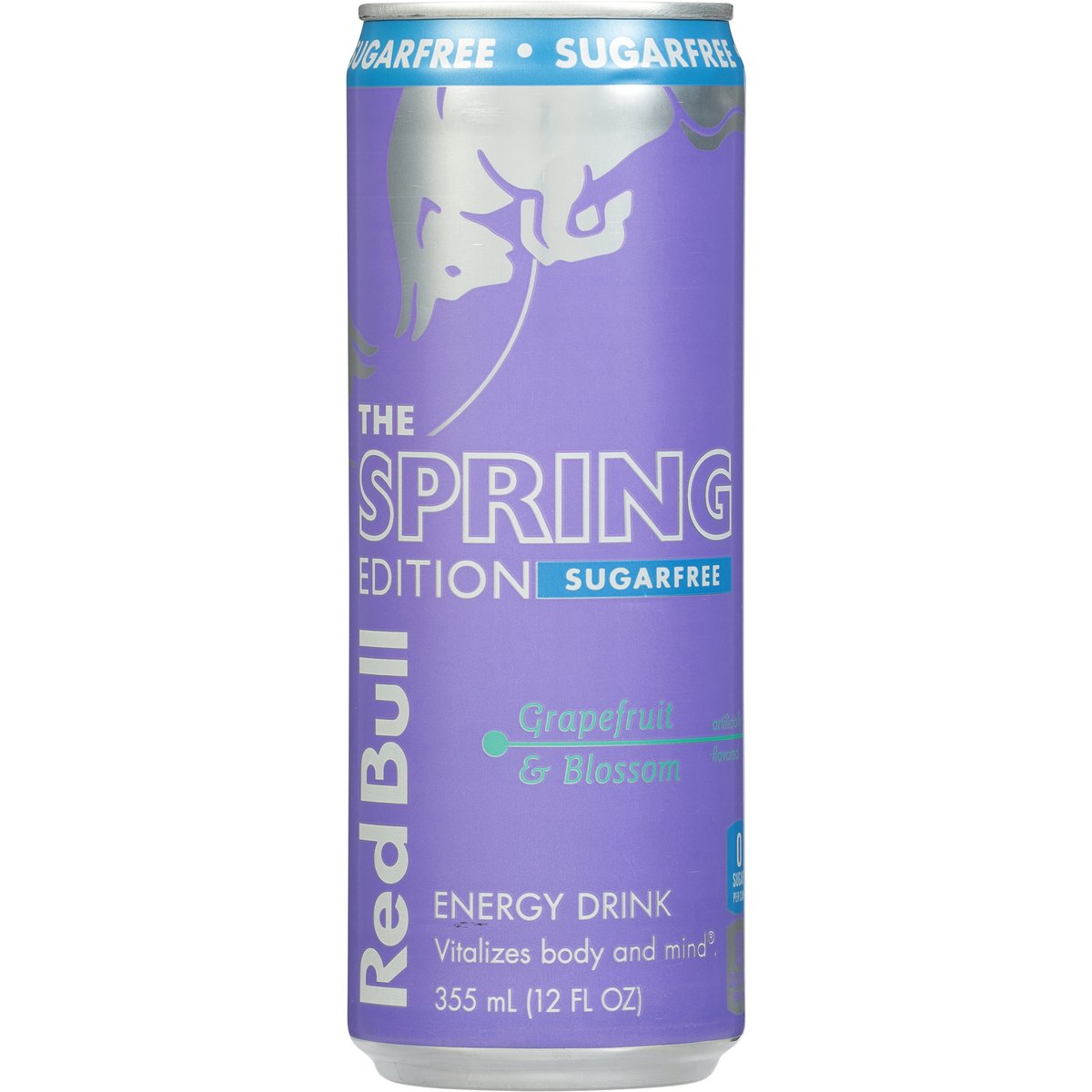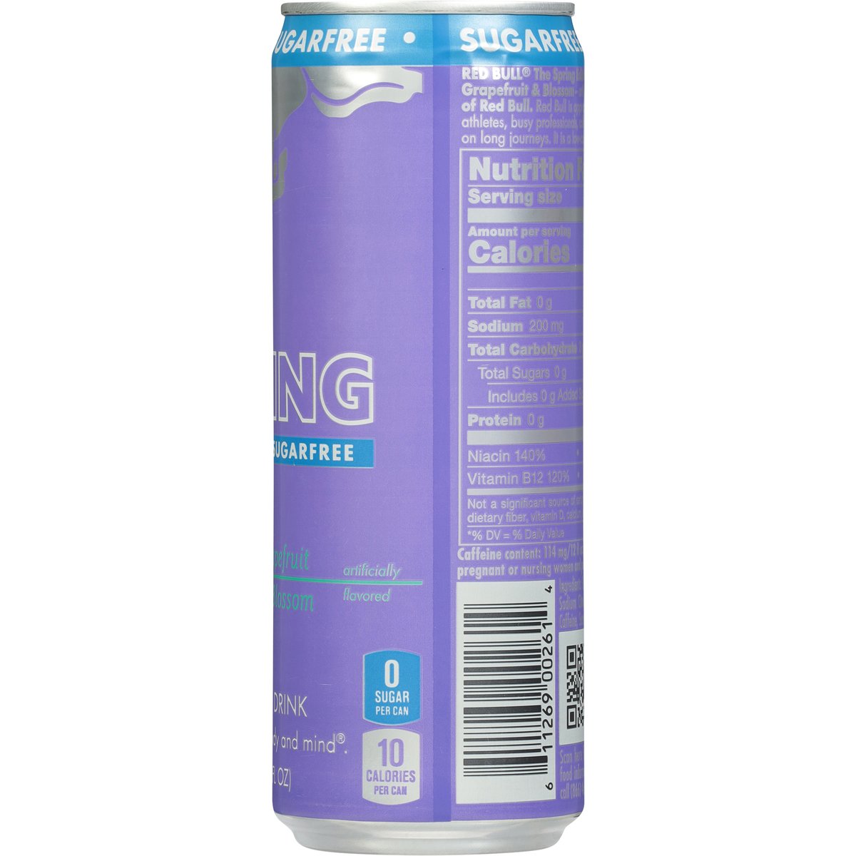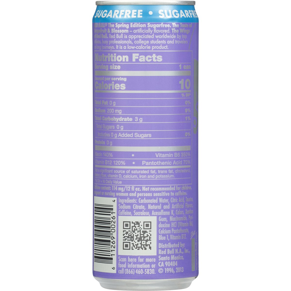 The Spring Edition Artificially flavored. 0 sugar per can. 10 calories per can. Sugar free. It is a low calorie product. Caffeine Content: 114 mg/12 fl oz. Vitalizes body and mind. Red Bull The Spring Edition Sugarfree. The Taste of Grapefruit & Blossom-artificially flavored. The Wings of Red Bull. Red Bull is appreciated worldwide by top athletes, busy professionals, college students and travelers on long journeys. It is a low-calorie product. www.redbull.com. Scan for more food information or call (866) 460-5830. Please recycle.