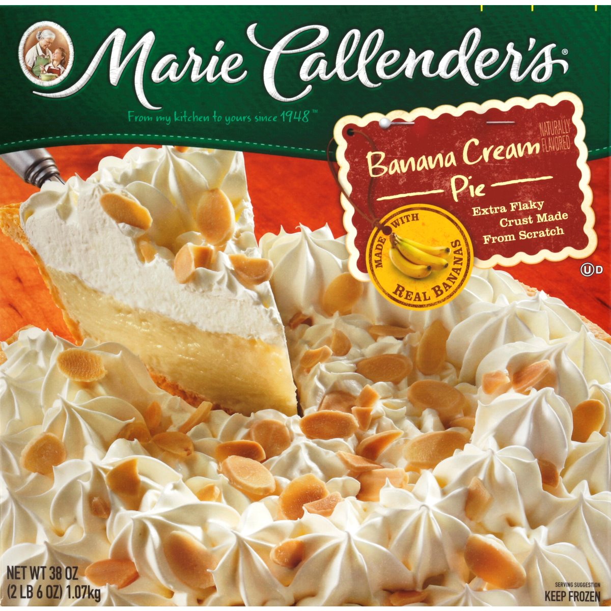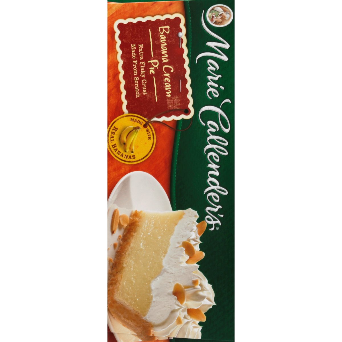 Naturally flavored. Made with real bananas. Extra flaky crust made from scratch. From my kitchen to yours since 1948. Food you love. Questions or comments, visit us at www.mariecallendersmeals.com or call Mon-Fri, 1-800-595-7010 (except national holidays). Please have entire package available when you call so we may gather information off the label. how2recycle.info. Marie's story begins over 60 years ago when Marie Callender first baked pies for local restaurants. Marie used only the finest ingredients and put such love and care into every pie - and soon she began offering her home cooking and legendary pies at a pie shop of her own. Now you can enjoy the goodness of Marie's freshly made pies at home. Made with Real Bananas: Marie's rich and luscious custard filling bursts with the mouthwatering taste of real bananas nestled in our flaky pie crust and finished with an abundance of whipped topping and a generous garnish of toasted sliced almonds. For more information call 1-800-595-7010. Try all of Marie's favorites. Try Marie's thaw & serve pies.