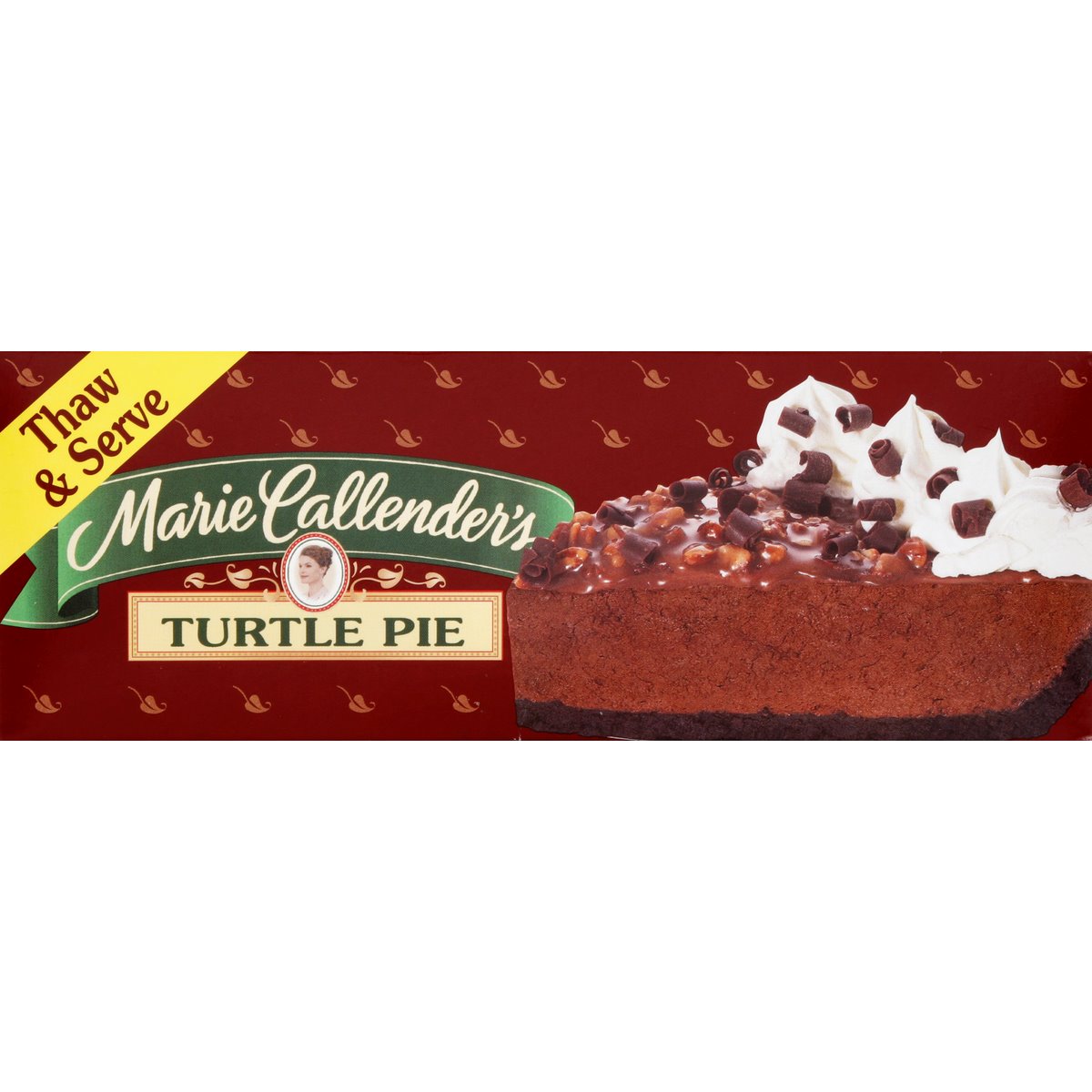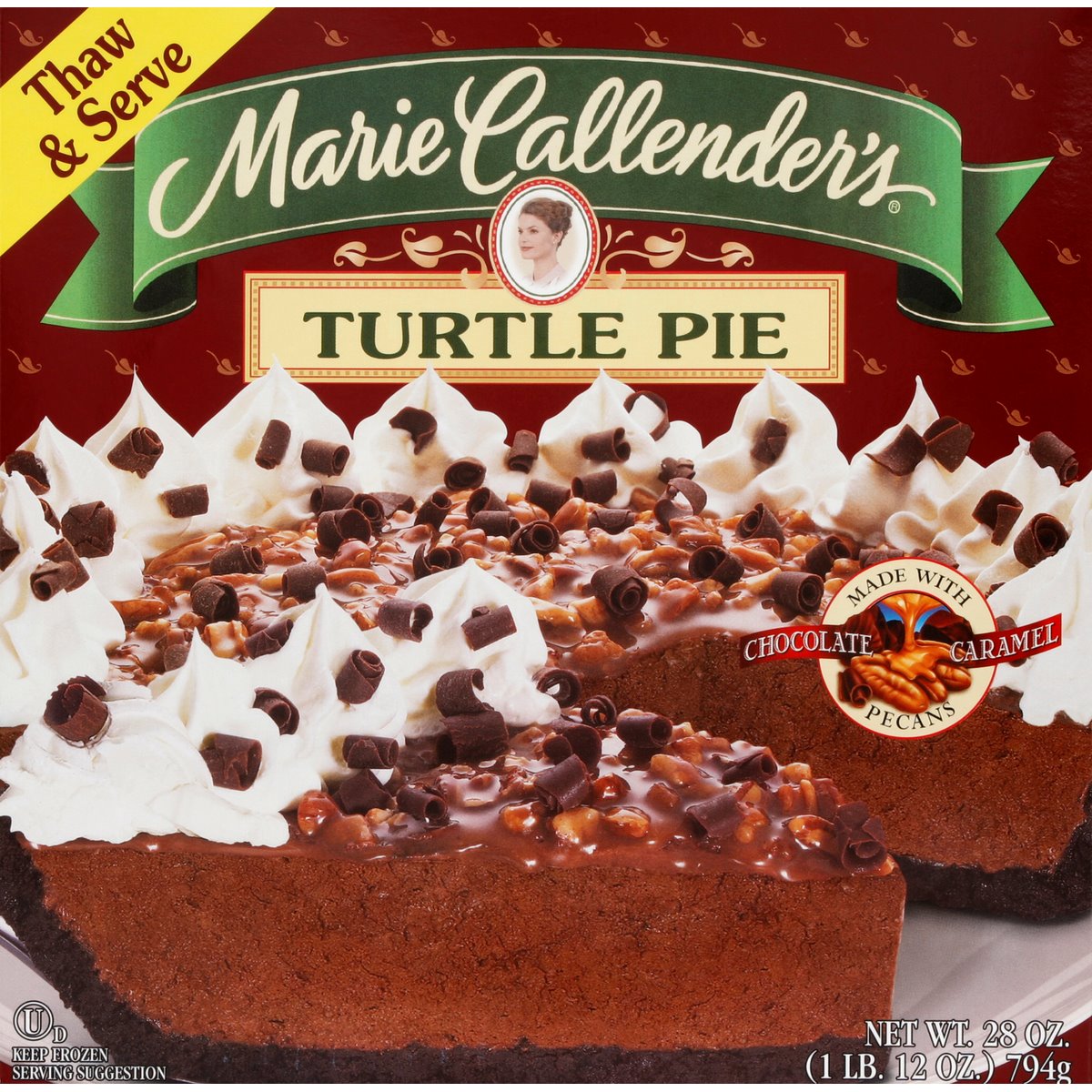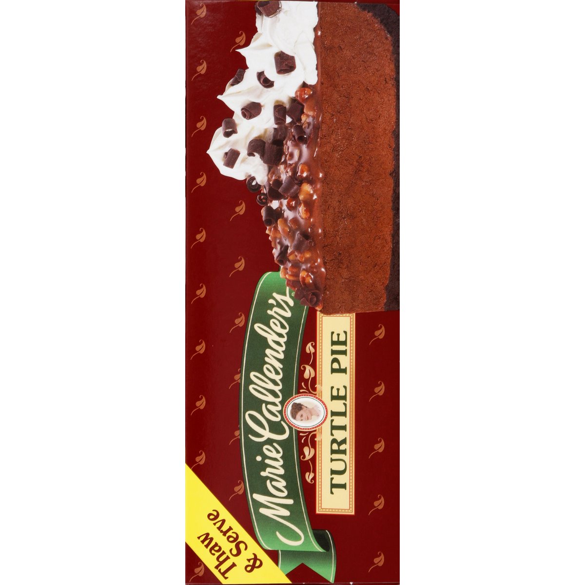 Thaw & serve. Made with chocolate caramel pecans. Turtle pie, oh my! You have never seen a turtle move as fast as Marie's Turtle Pie. Marie's velvety chocolate satin filling nestles in a crisp cookie crumb crust. Topped with chewy caramel pecans, creamy whipped topping, and lots of decadent dark chocolate curls, is it any wonder that Marie's Turtle Pie tends to disappear in a hurry? Our story begins over 50 years ago, in 1948, when Marie Callender first baked pies for local restaurants. Baking from scratch, Marie used only the finest ingredients and put such love and care into each and every pie that people took notice. Before long, Marie began offering her good home cooking and legendary pies at a restaurant of her own. The word spread and soon Marie Callender restaurants were opened all across the West. We've been warming hearts and tummies with our famous recipes ever since. Now you can enjoy the goodness of Marie's freshly made pies at home with our frozen thaw and serve pies based on Marie's original recipes.