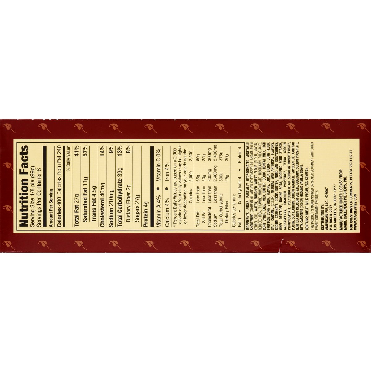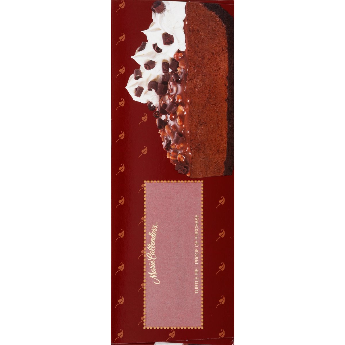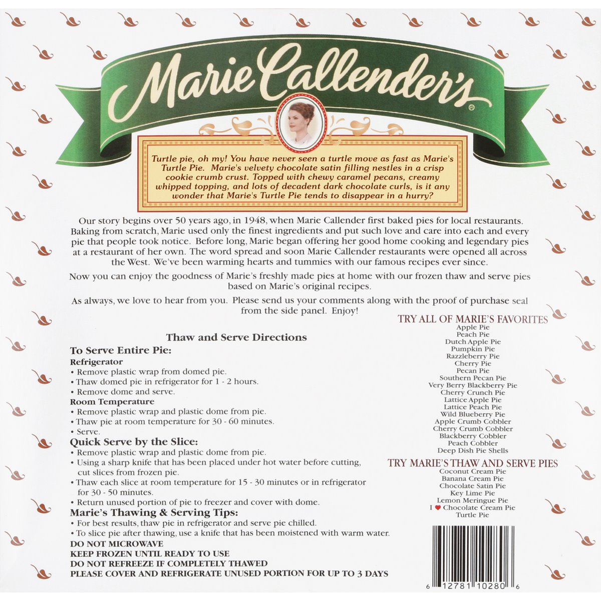 Thaw & serve. Made with chocolate caramel pecans. Turtle pie, oh my! You have never seen a turtle move as fast as Marie's Turtle Pie. Marie's velvety chocolate satin filling nestles in a crisp cookie crumb crust. Topped with chewy caramel pecans, creamy whipped topping, and lots of decadent dark chocolate curls, is it any wonder that Marie's Turtle Pie tends to disappear in a hurry? Our story begins over 50 years ago, in 1948, when Marie Callender first baked pies for local restaurants. Baking from scratch, Marie used only the finest ingredients and put such love and care into each and every pie that people took notice. Before long, Marie began offering her good home cooking and legendary pies at a restaurant of her own. The word spread and soon Marie Callender restaurants were opened all across the West. We've been warming hearts and tummies with our famous recipes ever since. Now you can enjoy the goodness of Marie's freshly made pies at home with our frozen thaw and serve pies based on Marie's original recipes.
