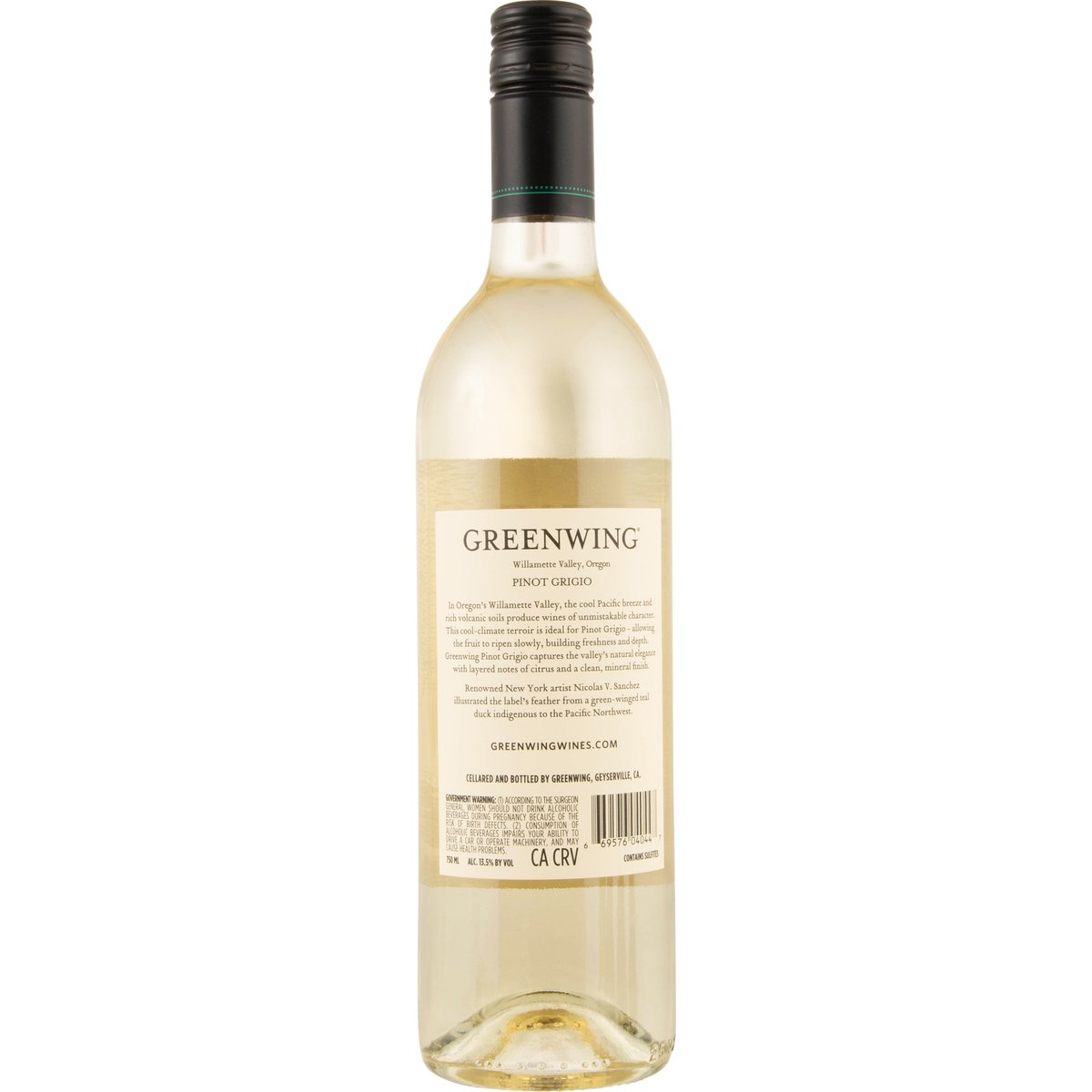 In Oregon's Willamette Valley, the cool Pacific breeze and rich volcanic soils produce wines of unmistakable character. This cool-climate terroir is ideal for Pinot Grigio - allowing the fruit to ripen slowly, building freshness and depth. Greenwing Pinot Grigio captures the valley's natural elegance with layered notes of citrus and a clean, mineral finish. Renowned New York artist Nicolas V. Sanchez illustrated the label's feather from a green-winged teal duck indigenous to the Pacific Northwest. greenwingwines.com. Alc. 13.5% by vol. 27 Cellared and bottled by Greenwing, Geyserville, CA.