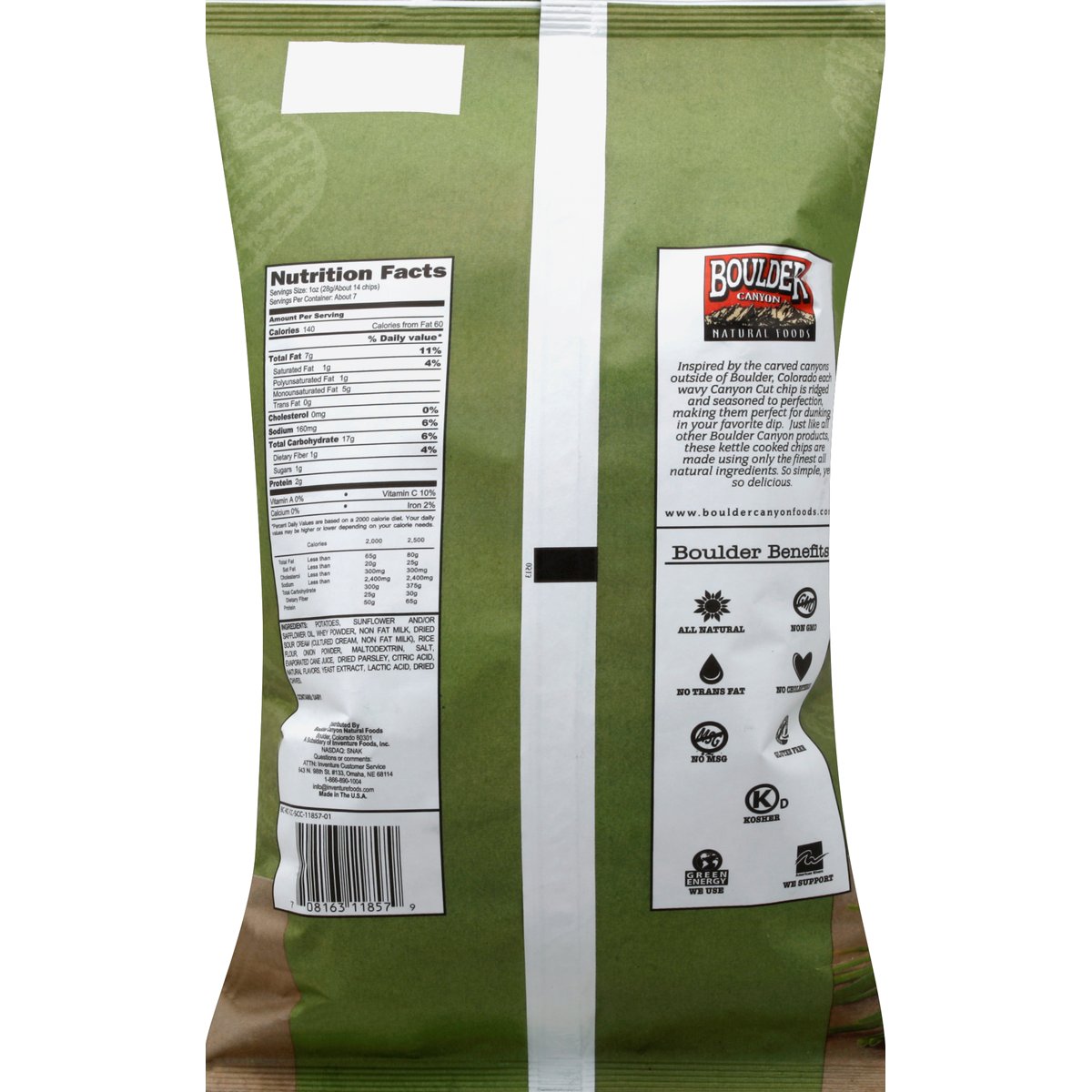 All natural. Gluten free. 140 calories, 1 g saturated fat (4% DV), 160 mg sodium (6% DV), 1 g sugars. 30% more compared to our 5 oz bag! Inspired by the carved canyons outside of Boulder, Colorado each wavy Canyon Cut chip is ridged and seasoned to perfection, making them perfect for dunking in your favorite dip. Just like all other Boulder Canyon products, these kettle cooked chips are made using only the finest all natural ingredients. So simple, yet so delicious. Boulder Benefits: All natural; Non GMO; No trans fat; No cholesterol; No MSG; Gluten free; Kosher; We use green energy; We support American Rivers. www.bouldercanyonfoods.com. Made in the USA.