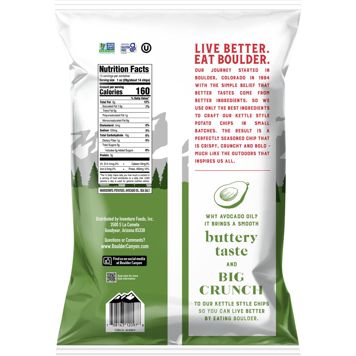 Kettle style potato chips Certified gluten free. Non-GMO Project verified. nongmoproject.org. Live better. Eat boulder. Our journey started in boulder, Colorado in 1994 with the simple belief that better tastes come from better ingredients. So we use only the best ingredients to craft our kettle style ??tat? chips in small batches. The result is a perfectly seasoned chip that is crispy, crunchy and bold - much like the outdoors that inspires us all. Why avocado oil? It brings a smooth buttery taste and big crunch to our kettle style chips so you can live better by eating boulder. www.BoulderCanyon.com. Find us on social media at Boulder Canyon. Scan here for more food information. Questions or comments? www.bouldercanyon.com.