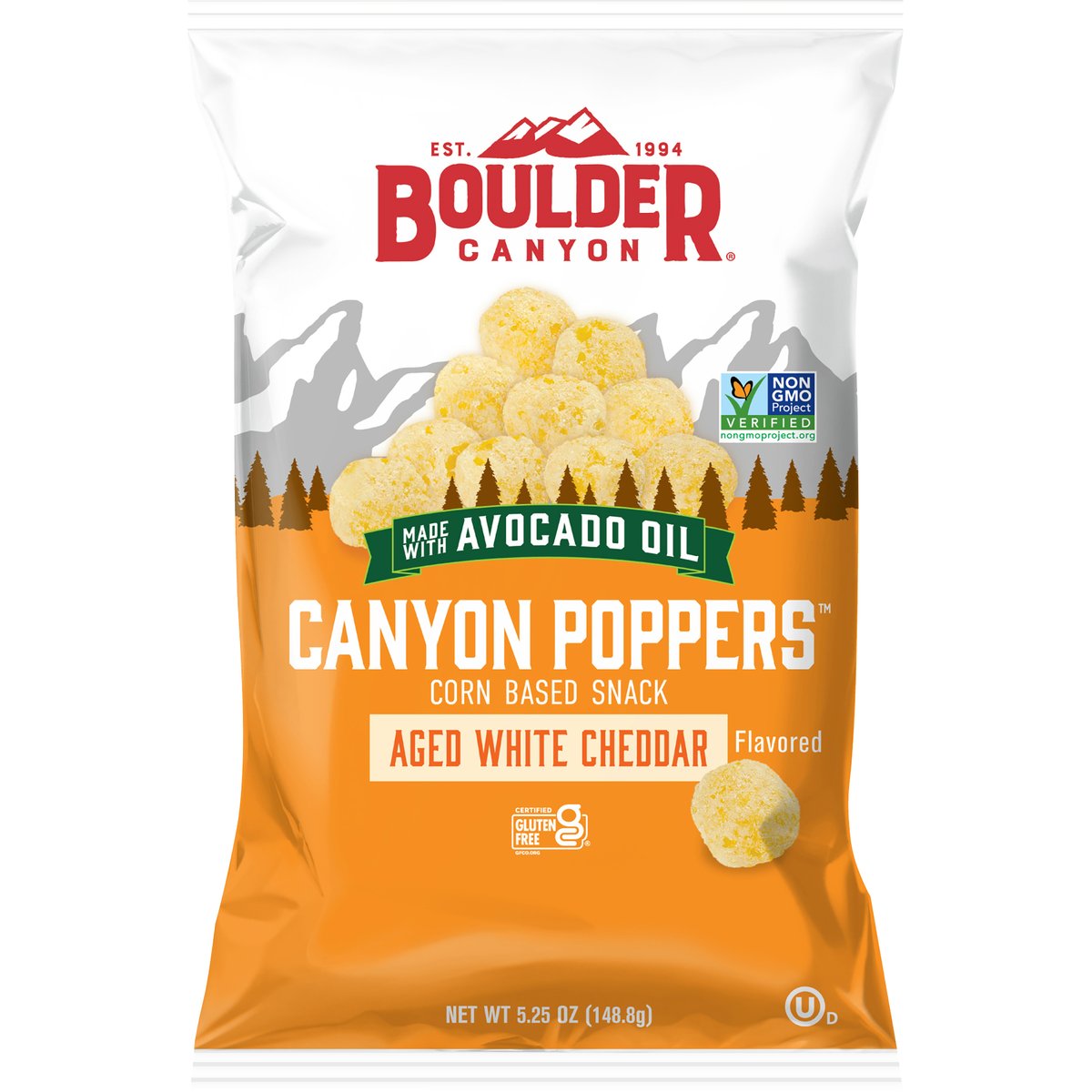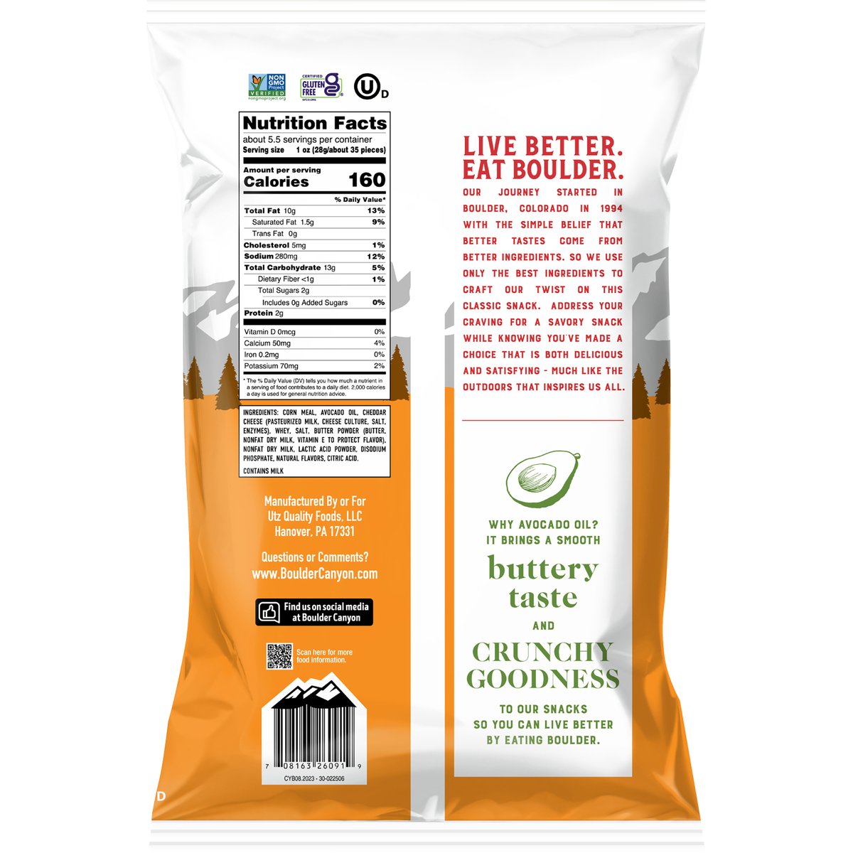 Aged white cheddar flavored. Certified gluten free. Non-GMO Project verified. nongmoproject.org. Est. 1994. Live better. Eat boulder. Our journey started in Boulder. Colorado in 1994 with the simple belief that better tastes come from better ingredients. So we use only the best ingredients to craft our twist on this classic snack. Address your craving for a savory snack while knowing you've made a choice that is both delicious and satisfying much like the outdoors that inspires us all. Why avocado oil? It brings a smooth buttery taste and crunchy goodness to our snacks so you can live better by eating boulder. www.BoulderCanyon.com. Find us on social media at Boulder Canyon. Scan for more food information. Questions or Comments? www.BoulderCanyon.com.
