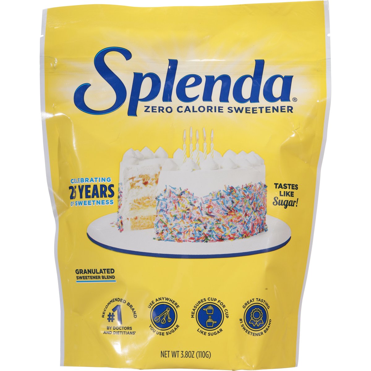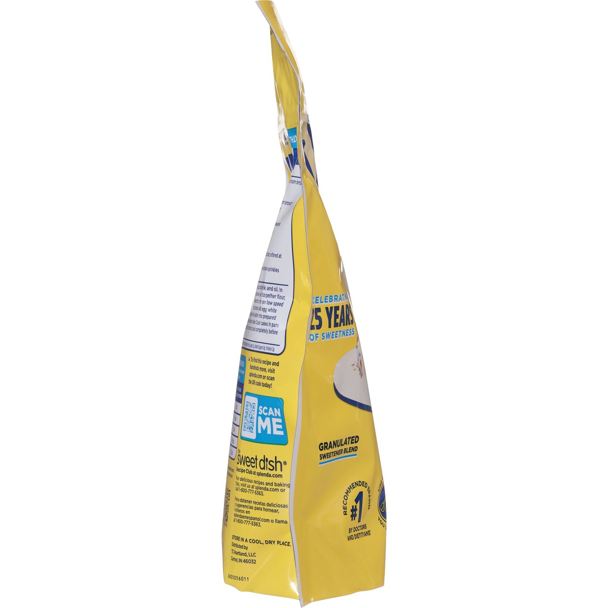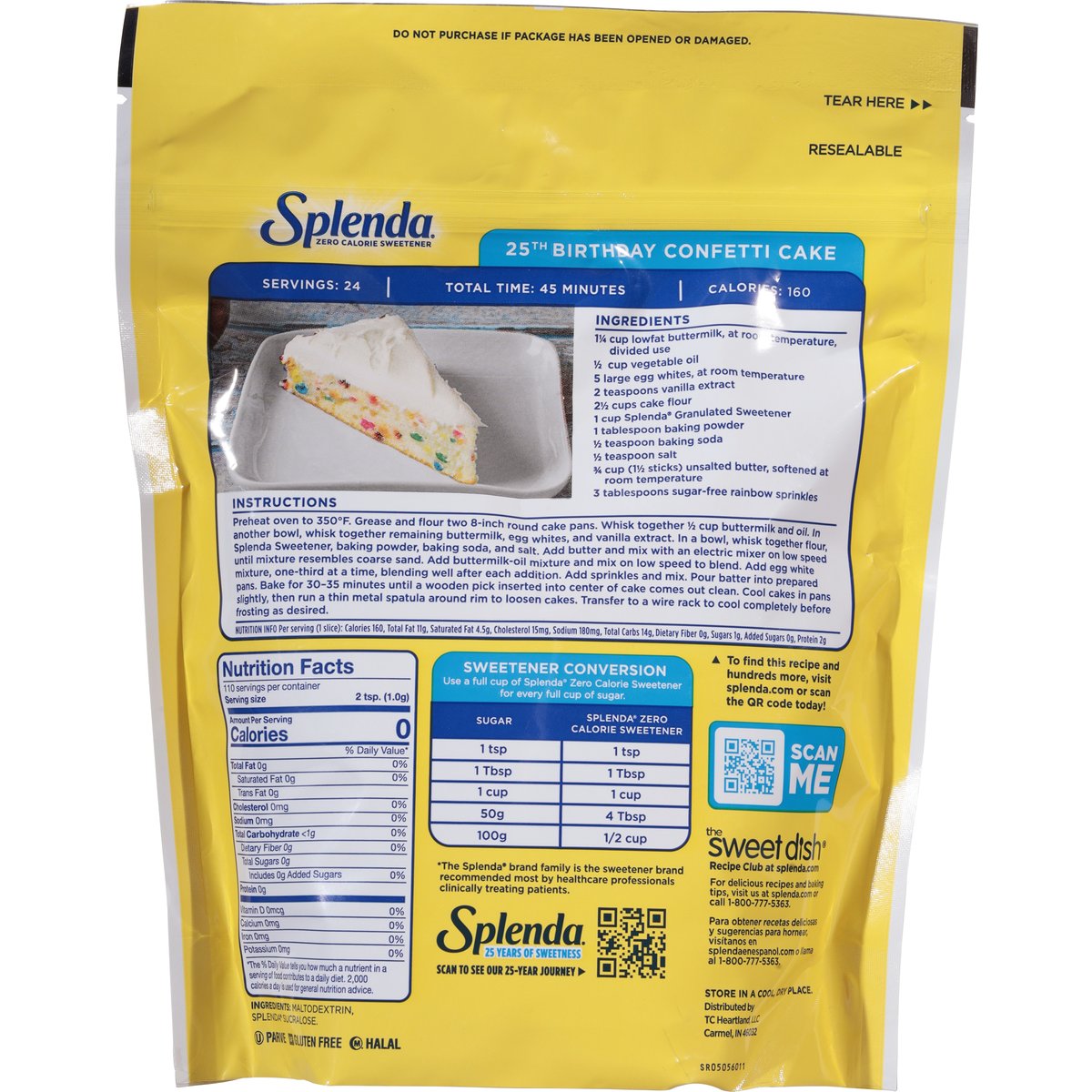Gluten free. Halal Zero calories sweeteners. Celebrating 25 years of sweetness. Tastes like sugar! #1 recommended brand by doctors and dietitians*. Use anywhere you use sugar. Measure cup for cup like sugar. Great tasting #1 sweetener brand. * The Splenda brand family is the sweetener brand recommended most by healthcare professionals clinically treating patients. splenda.com. SmartLabel: Scan to see our 25-year journey. SmartLabel: Scan me. To find this recipe and hundreds more, visit splenda.com or scan the QR code today! Follow us on social media. Facebook.com/spienda. Instagram. @spienda. Twitter @spienda. For delicious recipes and baking tips, visit us at splenda.com or call 1-800-777-5363. Resealable. Made in the USA.