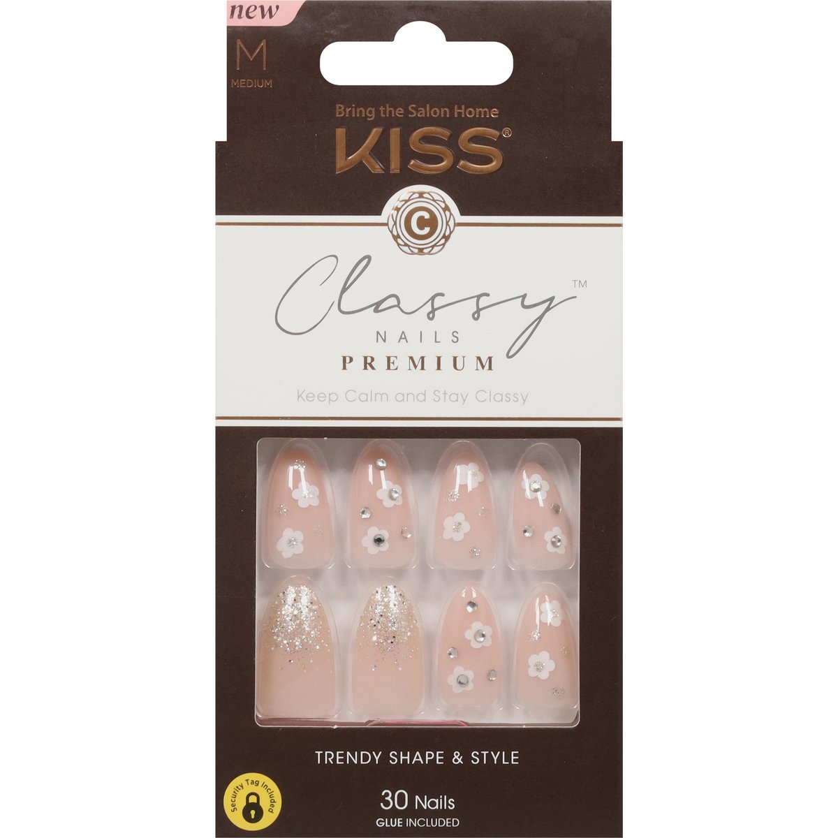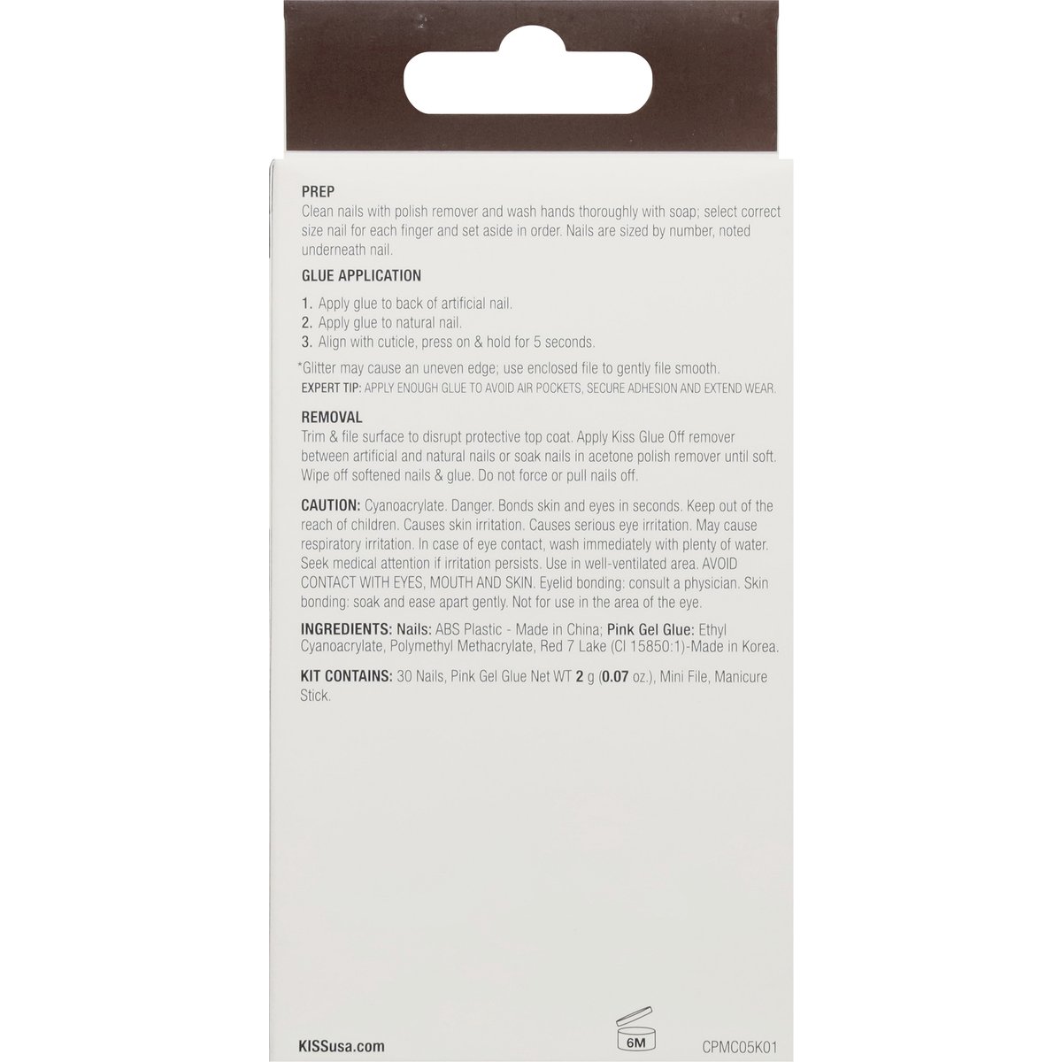 Kit Contains: 30 nails, pink gel glue net wt 2g (0.07 oz.), mini file, manicure stick. New. Bring the salon home. Keep calm and stay classy. Trendy shape & style. Glue included. Security tag included. Quality products that deliver salon results. Kit Contains: 30 nails, pink gel glue. Net wt 2 g (0.07 oz), mini glue, manicure stick. Glue on 7 day wear. KISSusa.com. how2recycle.info. Printed with soy ink. Nails: Made in China. Pink Gel Glue: Made in Korea.