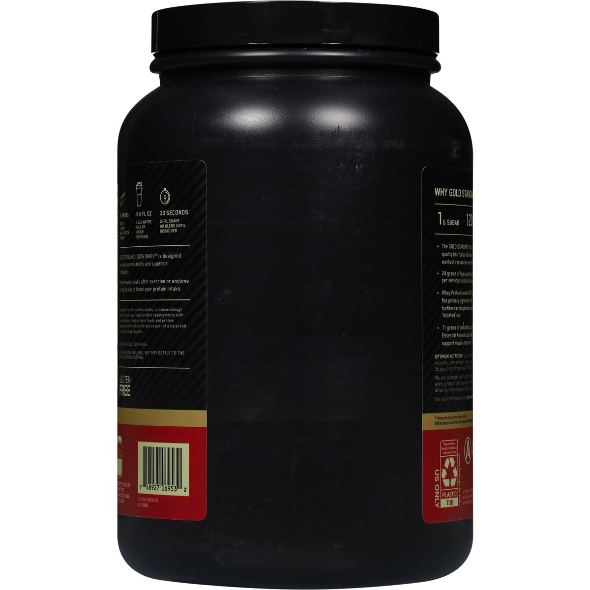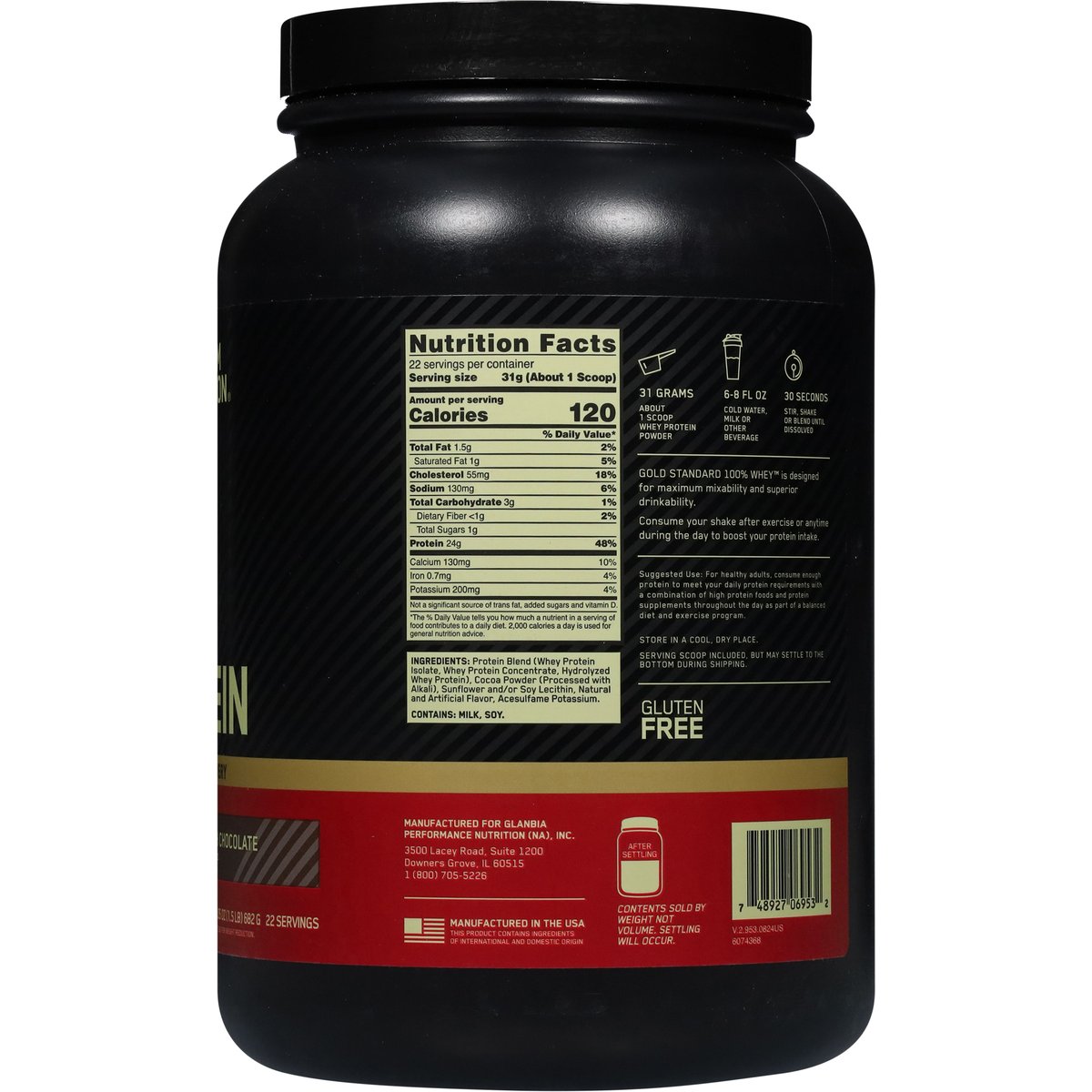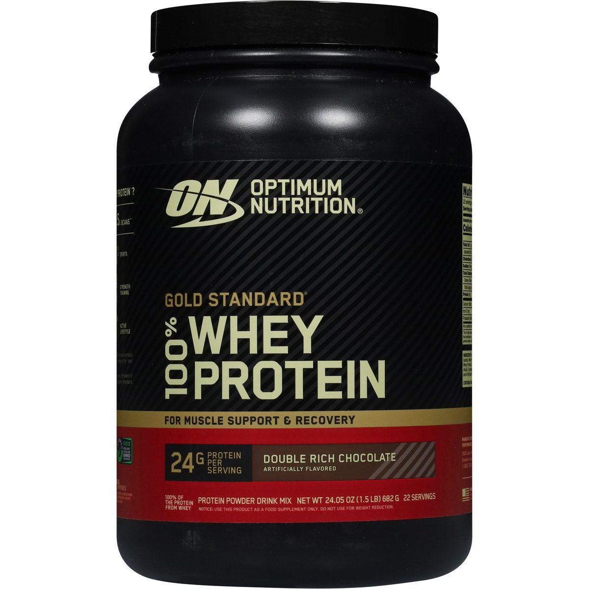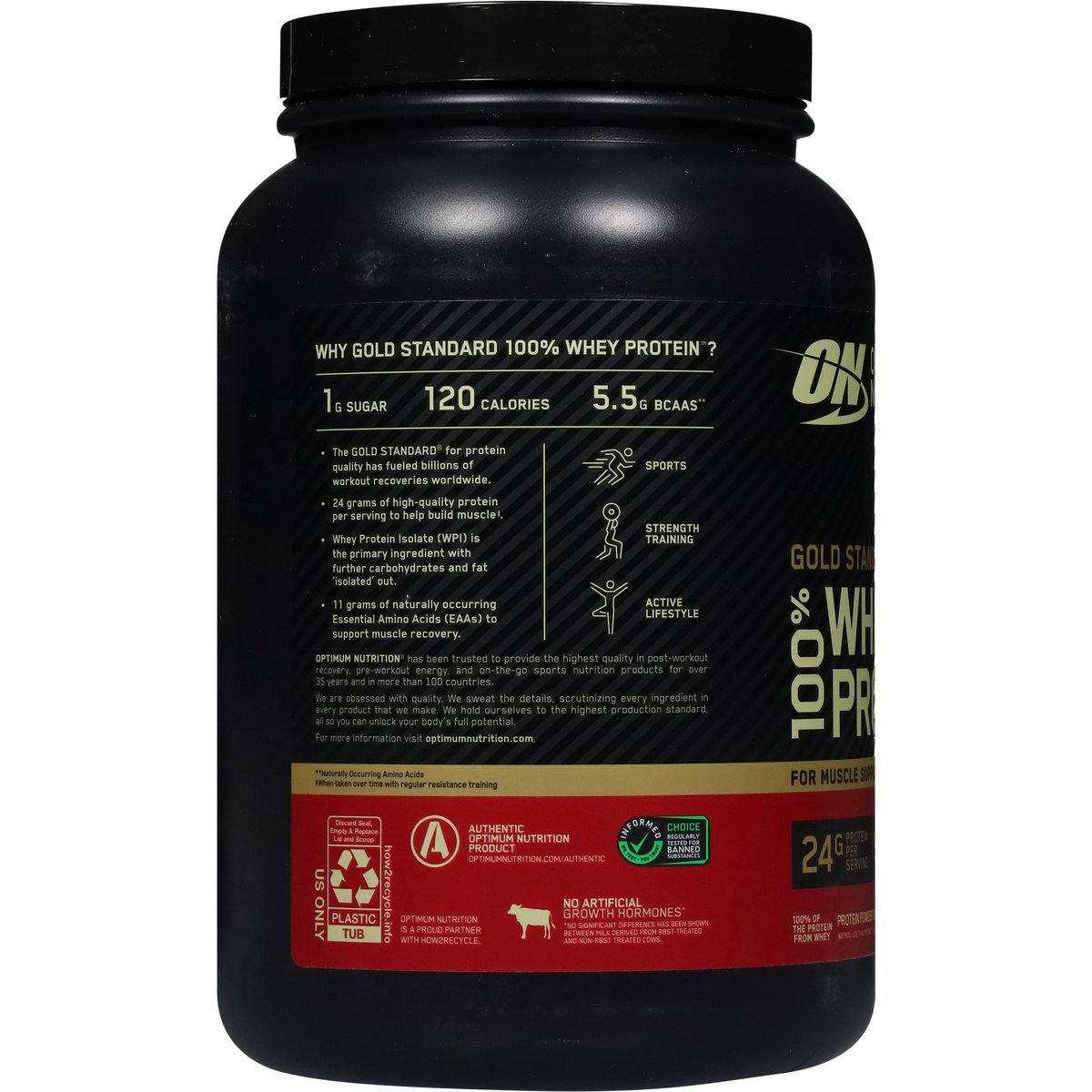 100% of the protein from whey. Artificially flavored. 24 g protein per serving. Gluten free. For muscle support & recovery. 22 servings. Why Gold Standard 100% whey? The Gold Standard for protein quality has fueled billions of workout recoveries worldwide. 24 grams of high-quality protein per serving to help build muscle (a). Whey Protein Isolate (WPI) is the primary ingredient with further carbohydrates and fat 'isolated' out. 11 grams of naturally occurring Essential Amino Acids (EAAs) to support muscle recovery. Sports. Strength training. Active lifestyle. Optimum Nutrition has been trusted to provide the highest quality in post-workout recovery, pre-workout energy, and on-the-go sports nutrition for over 35 years and in 90+ countries. After careful supplier selection, ingredients are tested to assure purity. potency and composition. We hold ourselves to the highest production standards, all so you can unlock your body's full potential. Gold Standard 100% Whey is designed for maximum mixability and superior drinkability. Serving scoop included, but may settle to the bottom during shipping. No artificial growth hormones (b). Contents sold by weight not volume. Settling will occur. (a) When taken over time with regular resistance training. (b) No significant difference has been shown between milk derived from rBST-treated and non-rBST treated cows. Informed we test - you trust. Choice regularly tested for banned substances. optimumnutrition.com/authentic. how2recycle.info. Authentic optimum nutrition product. optimumnutrition.com/authentic. 1 (800) 705-5226. Optimum nutrition is a proud partner with how2recycle. Manufactured in the USA this product contains ingredients of international and domestic origin.