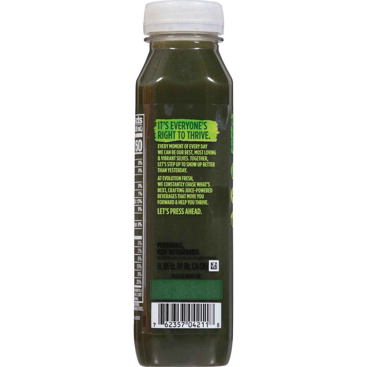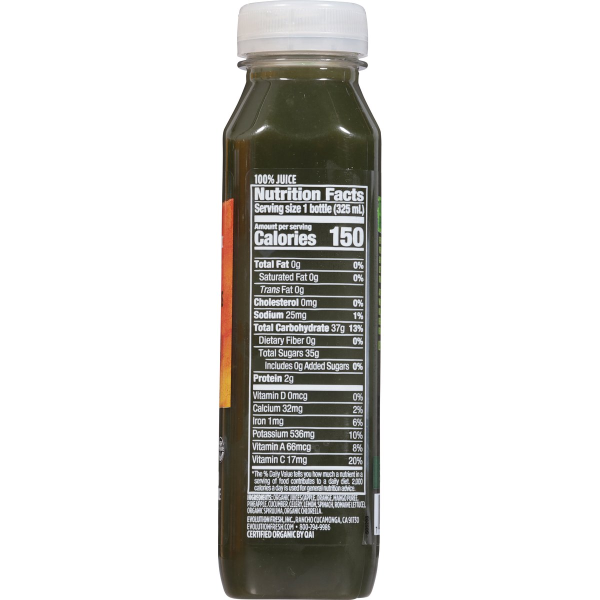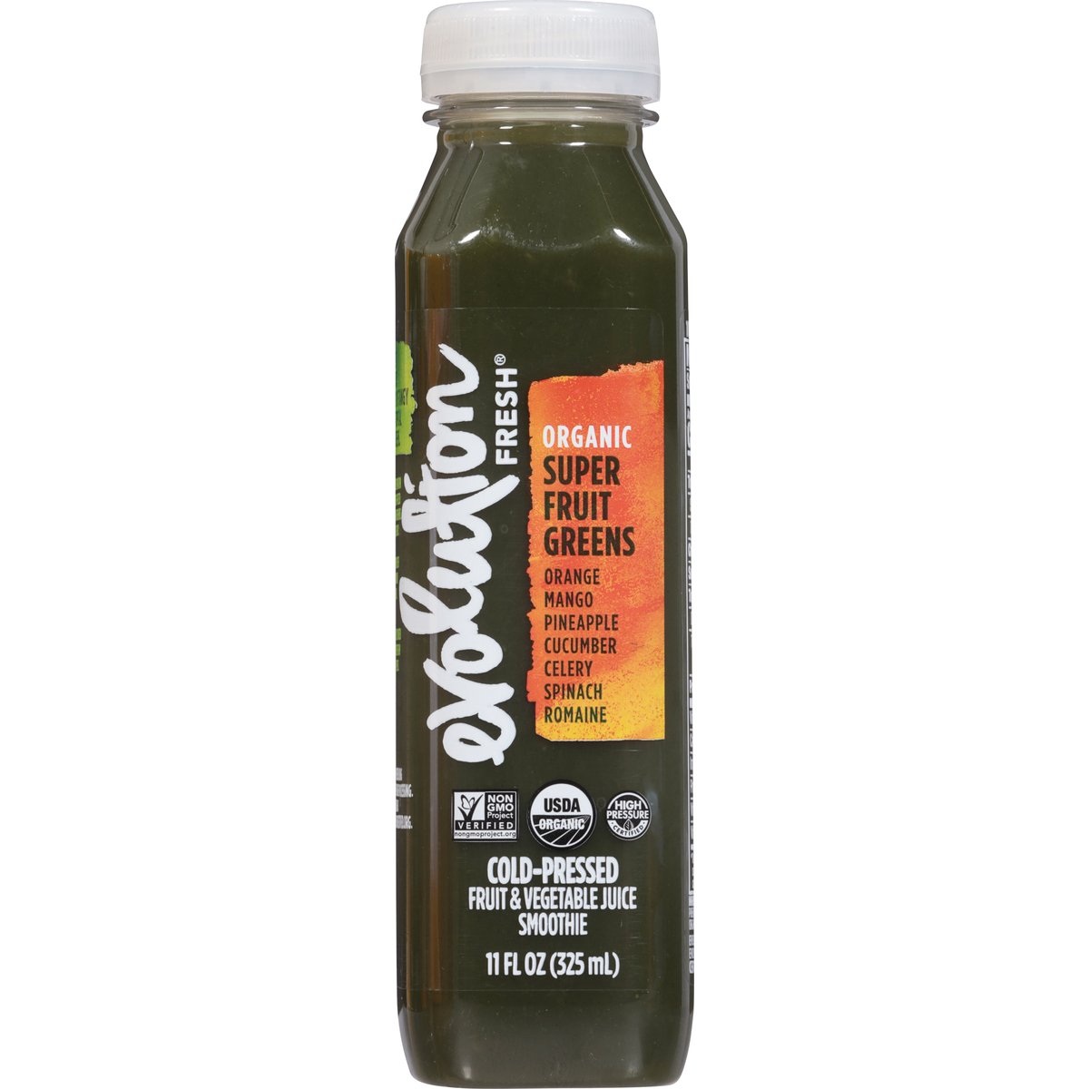 Orange, mango, pineapple, cucumber, celery, spinach, romaine USDA Organic. Certified gluten free. Certified organic by QAI. Good source of antioxidant vitamin c. Non-GMO Project verified. nongmoproject.org. It's everyone's right to thrive. Every moment of every day we can be our best, most loving & vibrant selves. Together, let's step up to show up better than yesterday. At Evolution Fresh, we constantly chase what's next, crafting juice-powered beverages that move you forward & help you thrive. Let's press ahead. Nutrition meets hydration in this satisfying blend of tangy citrus, sweet tropical fruit & leafy greens. Natural separation from cold-pressed organic ingredients. Shake to enjoy. Carefully sourced ingredients from farm to press. Cold-pressed using high pressure processing. High pressure certified. Cold-pressed using high pressure processing. evolutionfresh.com. highpressurcertified.org. Learn more at highpressurecertified.org. 800-794-9986.