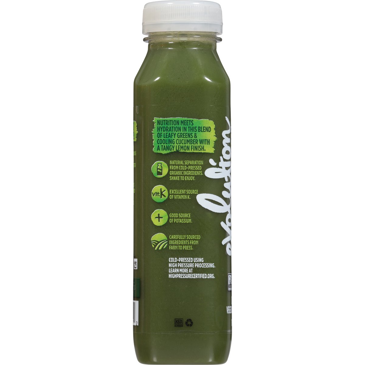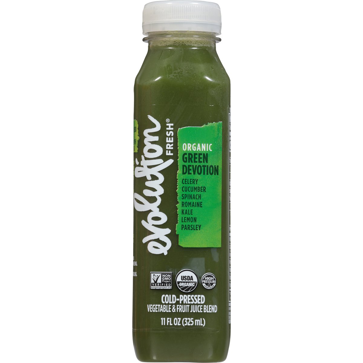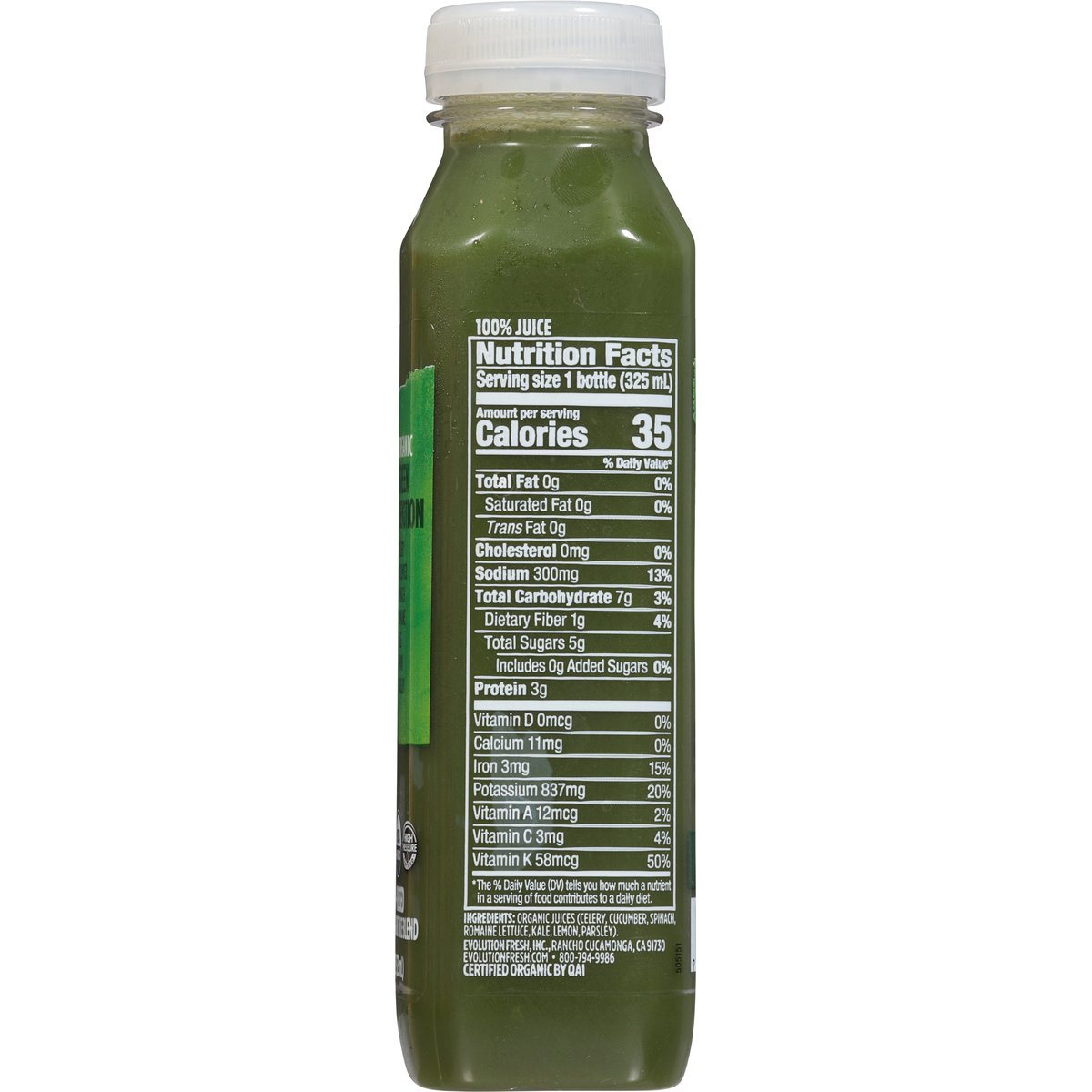 Celery, cucumber, spinach, romaine, kale, lemon, parsley. USDA Organic. Certified Organic by QAI. Excellent source of vitamin K. Good source of potassium. Non-GMO Project verified. nongmoproject.org. It's everyone's right to thrive. Every moment of every day we can be our best, most loving & vibrant selves. Together, let's step up to show up better than yesterday. At Evolution Fresh, we constantly chase what's next, crafting juice-powered beverages that move you forward & help you thrive. Let's press ahead. Nutrition meets hydration in this blend of leafy greens & cooling cucumber with a tangy lemon finish. Natural separation from cold-pressed organic ingredients. Carefully sourced ingredients from farm to press. Cold-pressed using high pressure processing. High Pressure Certified. Cold-pressed using high pressure processing. Learn more at highpressurecertified.org. evolutionfresh.com. 800-794-9986. Learn more at highpressurecertified.org.