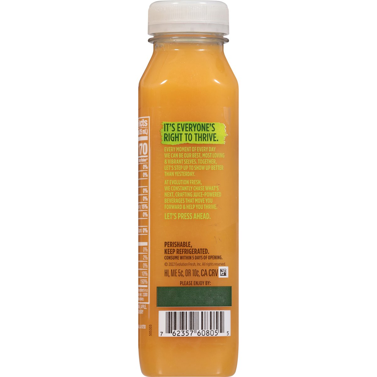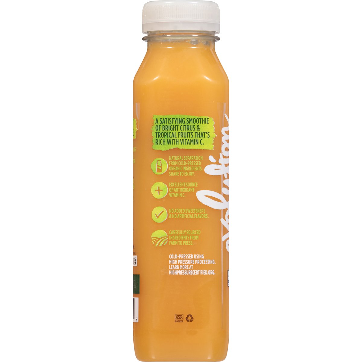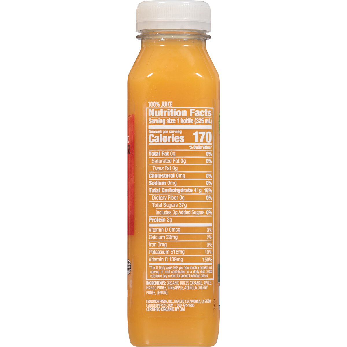 Orange; pineapple; mango; apple; acerola. No added sweeteners & no artificial flavors. USDA Organic. Excellent source of antioxidant Vitamin C. Non-GMO Project verified. nongmoproject.org. It's everyone's right to thrive. Every moment of every day we can be our best, most loving & vibrant selves. Together, let's step up to show up better than yesterday. At evolution fresh, we constantly chase what's next, crafting juice-powered beverages that move you forward & help you thrive. Let's press ahead. A satisfying smoothie of bright citrus & tropical fruits that's rich with vitamin c. Natural separation from cold-pressed organic ingredients. Shake to enjoy. Carefully sourced ingredients from farm to press. Cold-pressed using high pressure processing. High Pressure Certified. evolutionfresh.com. highpressurcertified.org. Learn more at highpressurcertified.org. 800-794-9986.