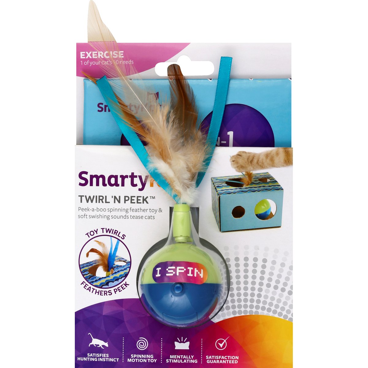 Feathers peek twirls toy. Spinning toy. Peek-a-boo box. Peek-a-boo spinning feather toy & soft swishing sounds tease cats. Satisfies hunting instinct. Spinning motion toy. Mentally stimulating. Exercise: 1 of your cat's 10 needs. Complete Needs System: care; interaction; comfort; independence; exercise; scratch; stimulation; privacy; explore; hunt. Exercise is necessary to keeps cats mentally alert, physically fit, and at a healthy weight. Toys that inspire running, chasing, and swatting help turn playtime into a fun workout. This toy helps meets cats' need for exercise. Use the Complete Needs System to find products that satisfy your cat's other needs. Learn more at smartykat.com. Safer for Pets: SmartyKat products are designed to meet child safety standards - eliminating small parts, long cords & other hazards - to ensure they're safer. Satisfaction guaranteed. Satisfaction Guarantee: If you're not completely satisfied with your purchase, call (303) 623-3327. CE listed. cats(at)smartykat.com. Facebook SmartyKat Products. Instagram (at)smartykatbrand. Eco Advantages: Outer ball casing made with recycled plastic. Cardboard box made from recycled paper pulp. Electrical waste, do not dispose of in trash. Designed in USA. Made in China.