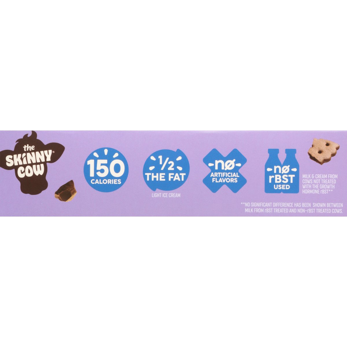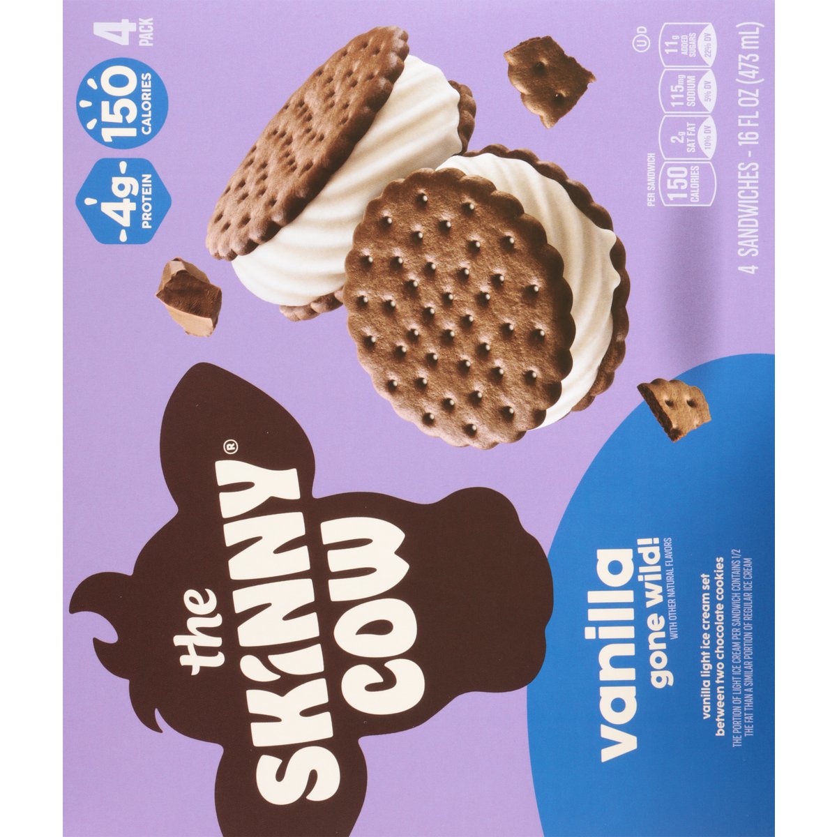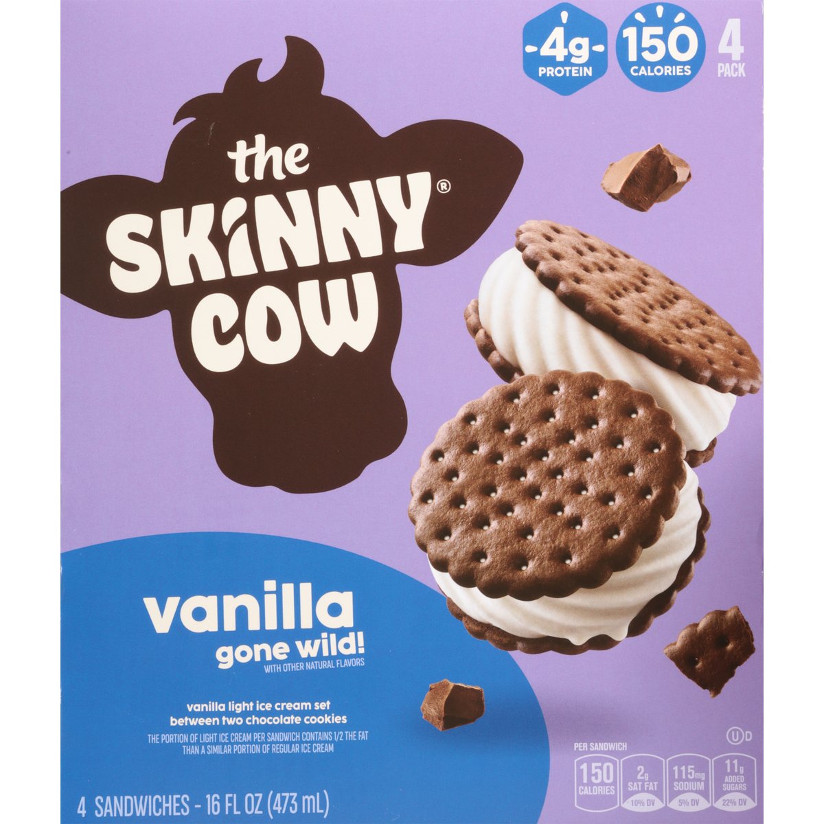 Vanilla light ice cream set between two chocolate cookies. With other natural flavors. No artificial flavors. 4 g protein. 150 calories. Per Sandwich: 150 calories; 2 g sat fat (10% DV); 115 mg sodium (5% DV); 11 g added sugars (22% DV). The portion of light ice cream per sandwich contains 1/2 the fat than a similar portion of regular ice cream. The portion of light ice cream per sandwich contains 2 g of fat compared to 6 g of fat in a similar portion of regular ice cream. 1/2 the fat. The skinny cow. No rBST used. Milk & cream from cows not treated with the growth hormone rBST**. Good food, Good life. Life is meant to be lived and dessert is meant to be eaten. We're here to provide it in all of its rich and creamy glory. We make indulgent desserts in perfectly reasonable portions, because who says you can't have your cake or rather, ice cream and eat it too? ** No significant difference has been shown between milk from rBST treated and non-rBST treated cows. skinnycow.com. Facebook. Instagram. SmartLabel. Scan for more food information or call 1-866-311-6350. Get the skinnycow.com. Please recycle this carton.