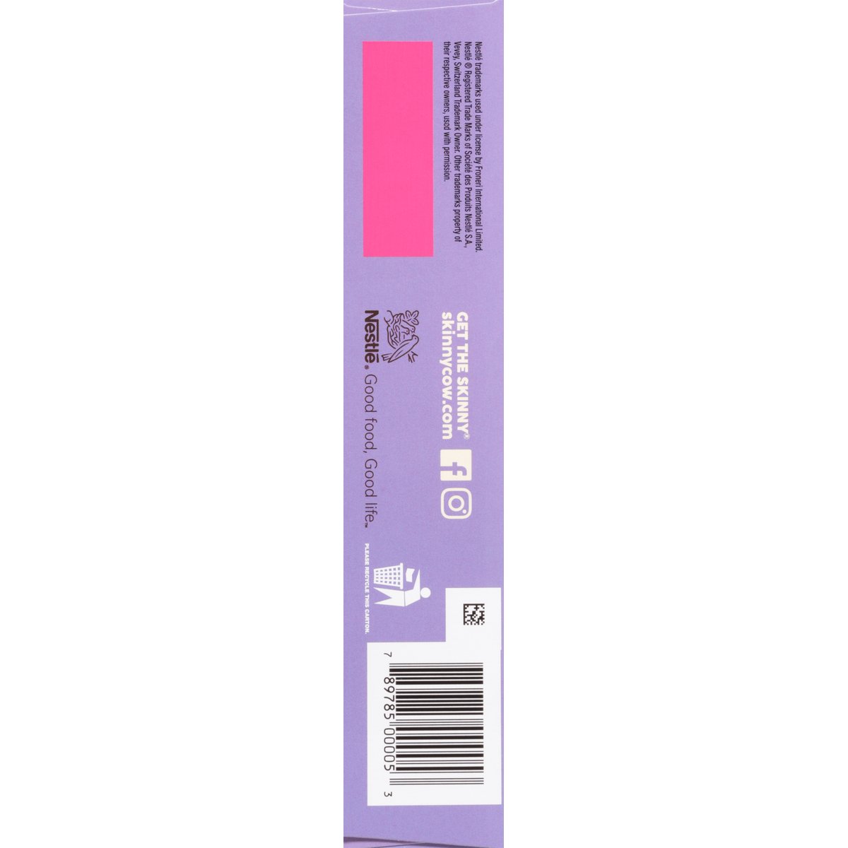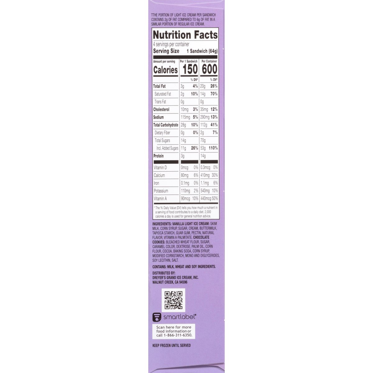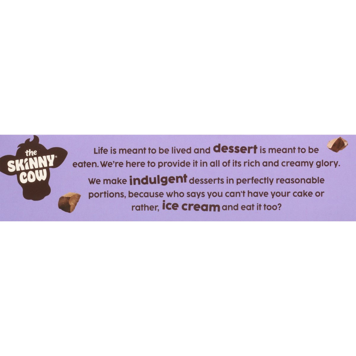 Vanilla light ice cream set between two chocolate cookies. With other natural flavors. No artificial flavors. 4 g protein. 150 calories. Per Sandwich: 150 calories; 2 g sat fat (10% DV); 115 mg sodium (5% DV); 11 g added sugars (22% DV). The portion of light ice cream per sandwich contains 1/2 the fat than a similar portion of regular ice cream. The portion of light ice cream per sandwich contains 2 g of fat compared to 6 g of fat in a similar portion of regular ice cream. 1/2 the fat. The skinny cow. No rBST used. Milk & cream from cows not treated with the growth hormone rBST**. Good food, Good life. Life is meant to be lived and dessert is meant to be eaten. We're here to provide it in all of its rich and creamy glory. We make indulgent desserts in perfectly reasonable portions, because who says you can't have your cake or rather, ice cream and eat it too? ** No significant difference has been shown between milk from rBST treated and non-rBST treated cows. skinnycow.com. Facebook. Instagram. SmartLabel. Scan for more food information or call 1-866-311-6350. Get the skinnycow.com. Please recycle this carton.