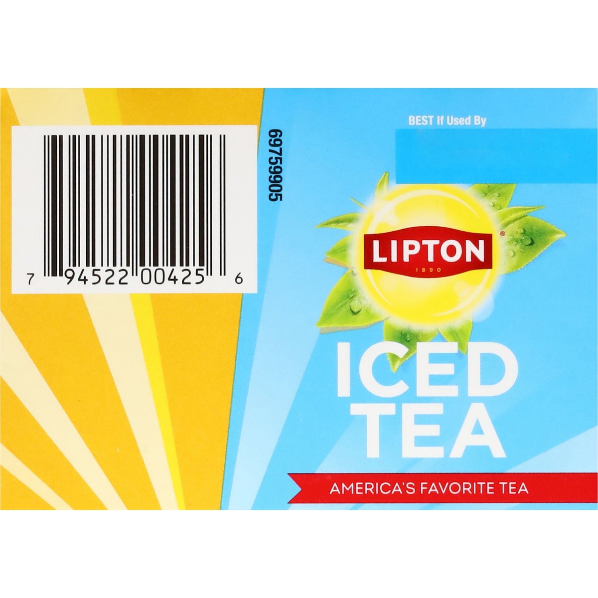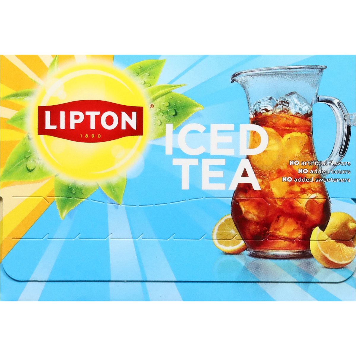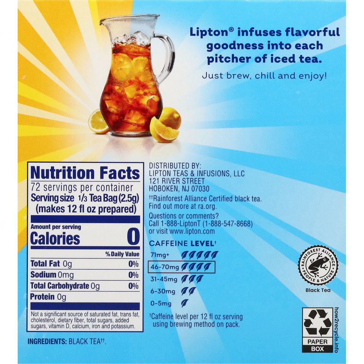 Caffeine Level(a): 46-70 mg. (a) Caffeine level per 12 fl oz serving using brewing method on pack. 1890. 1 bag makes 1 quart. America's favorite tea. Lipton infuses flavorful goodness into each pitcher of iced tea. Just brew, chill and enjoy! Crafted with tea leaves picked at the peak of freshness, Lipton infuses flavorful goodness into each pitcher of iced tea. The smooth, crisp taste, with no artificial flavors and no added sweeteners or colors, creates a moment of pure refreshment, perfect for sharing or enjoying alone. No added colors. No added sweeteners. www.lipton.com. how2recycle.info. Questions or comments? Call 1-888-LiptonT (1-888-547-8668) or visit www.lipton.com. Rainforest Alliance: People & nature. Black tea.