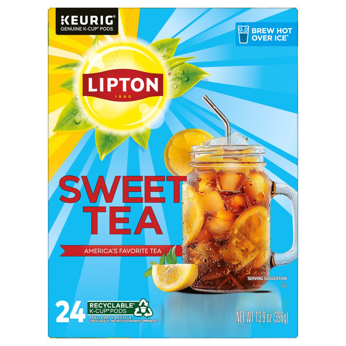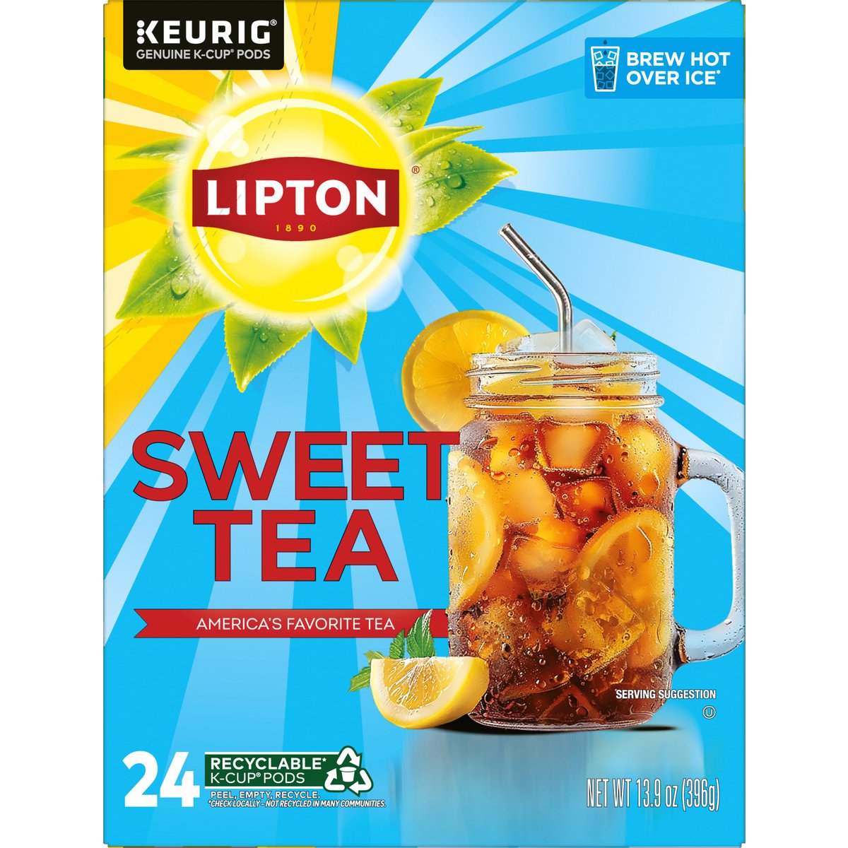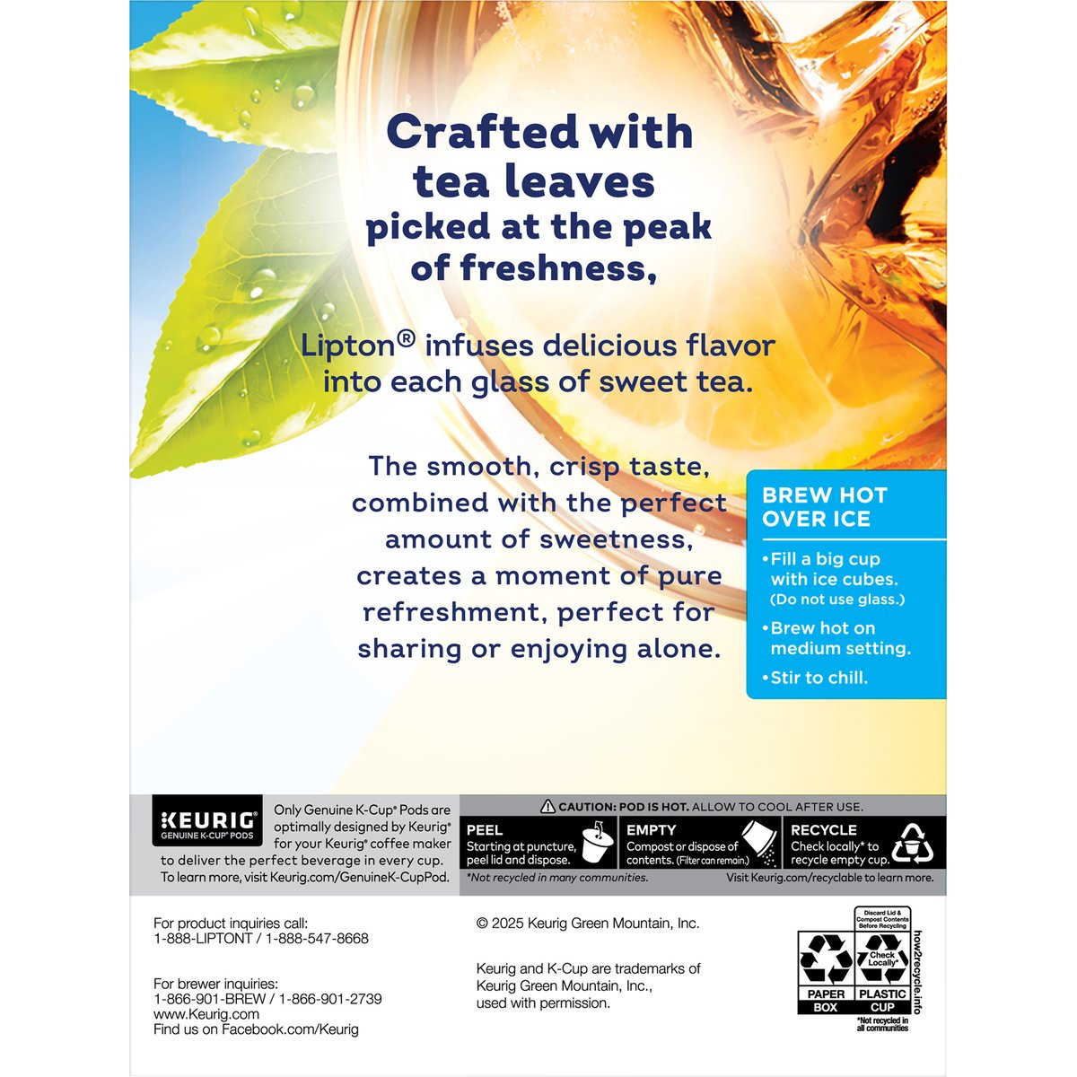 Keurig Genuine K-Cup pods. 1890. America's favorite tea. Crafted with tea leaves picked at the peak of freshness, Lipton infuses delicious flavor into each glass of sweet tea. The smooth, crisp taste, combined with the perfect amount of sweetness, creates a moment of pure refreshment, perfect for sharing or enjoying alone. www.Keurig.com. how2recycle.info. www.lipton.com. Find us on Facebook.com/Keurig. For product inquires call: 1-888-Lipton/ 1-888-547-8668. For brewer inquiries: 1-866-901-Brew/ 1-866-901-2739. Questions or comment? Call 1-888-LiptonT (1-888-547-8668), email hello.us@lipton.com, or visit www.lipton.com. Rainforest Alliance: People & nature. Recyclable* K-Cup pods. Peel. Empty. Recycle. *Check locally - not recycled in communities. Peel. Starting at puncture, peel lid and dispose. Empty. Compost or dispose of contents. (Filter can remain). Recycle check locally* to recycle empty cup. *Not recycled in all communities. Visit keurig.com/recyclable to learn more.