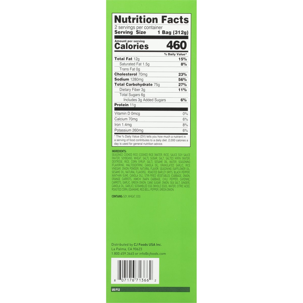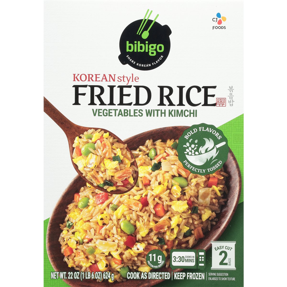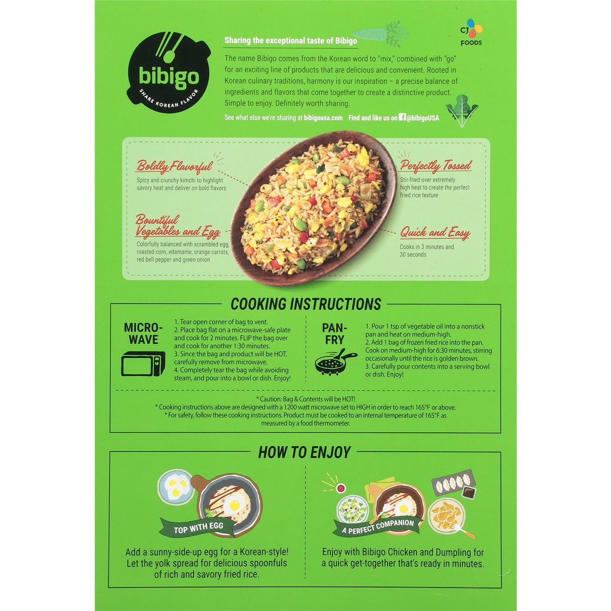 11 g protein per serving. Share Korean flavor. Bold flavors. Perfectly tossed. Cooks in 3:30 mins. Easy-cut. Sharing the exceptional taste of Bibigo. The name Bibigo comes from the Korean word to mix, combined with go for an exciting line of products that are delicious and convenient. Rooted in Korean culinary traditions, harmony is our inspiration - a precise balance of ingredients and flavors that come together to create a distinctive product. Simple to enjoy. Definitely worth sharing. Boldly Flavorful: Spicy and crunchy kimchi to highlight savory heat and deliver on bold flavors. Bountiful Vegetables and Egg: Colorfully balanced with scrambled egg, roasted corn, edamame, orange carrots, red bell pepper and green onion. Perfectly Tossed: Stir-fried over extremely high heat to create the perfect fried rice texture. Quick and Easy: Cooks in 3 minutes and 30 seconds. bibigousa.com. Find and like us on Facebook(at)bibigoUSA. See what else we're sharing at bibigousa.com.