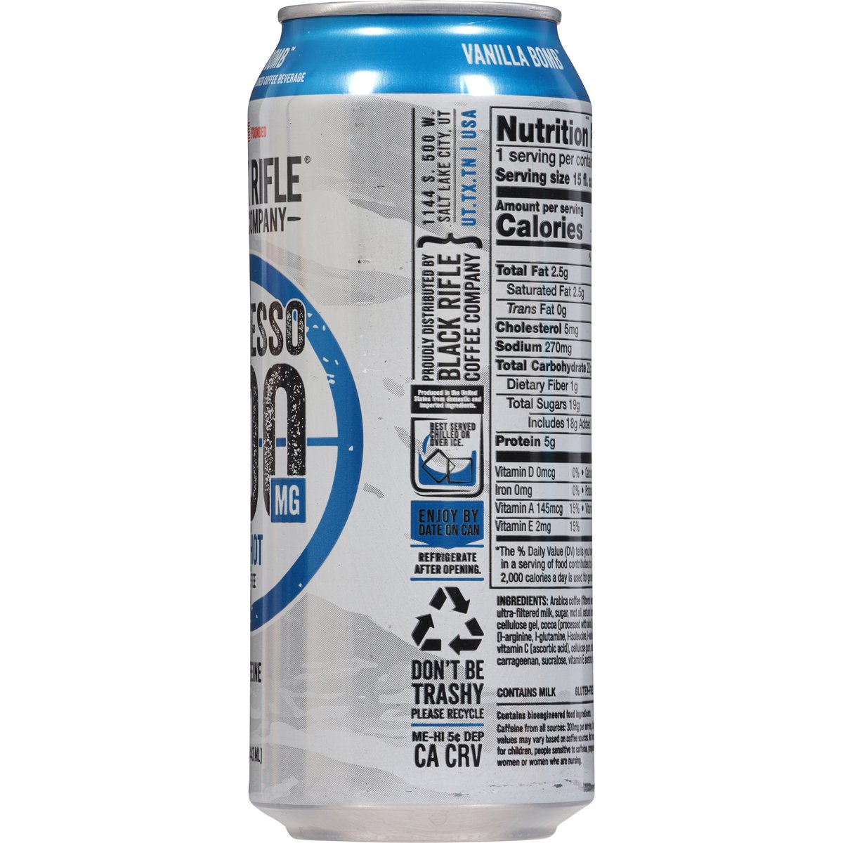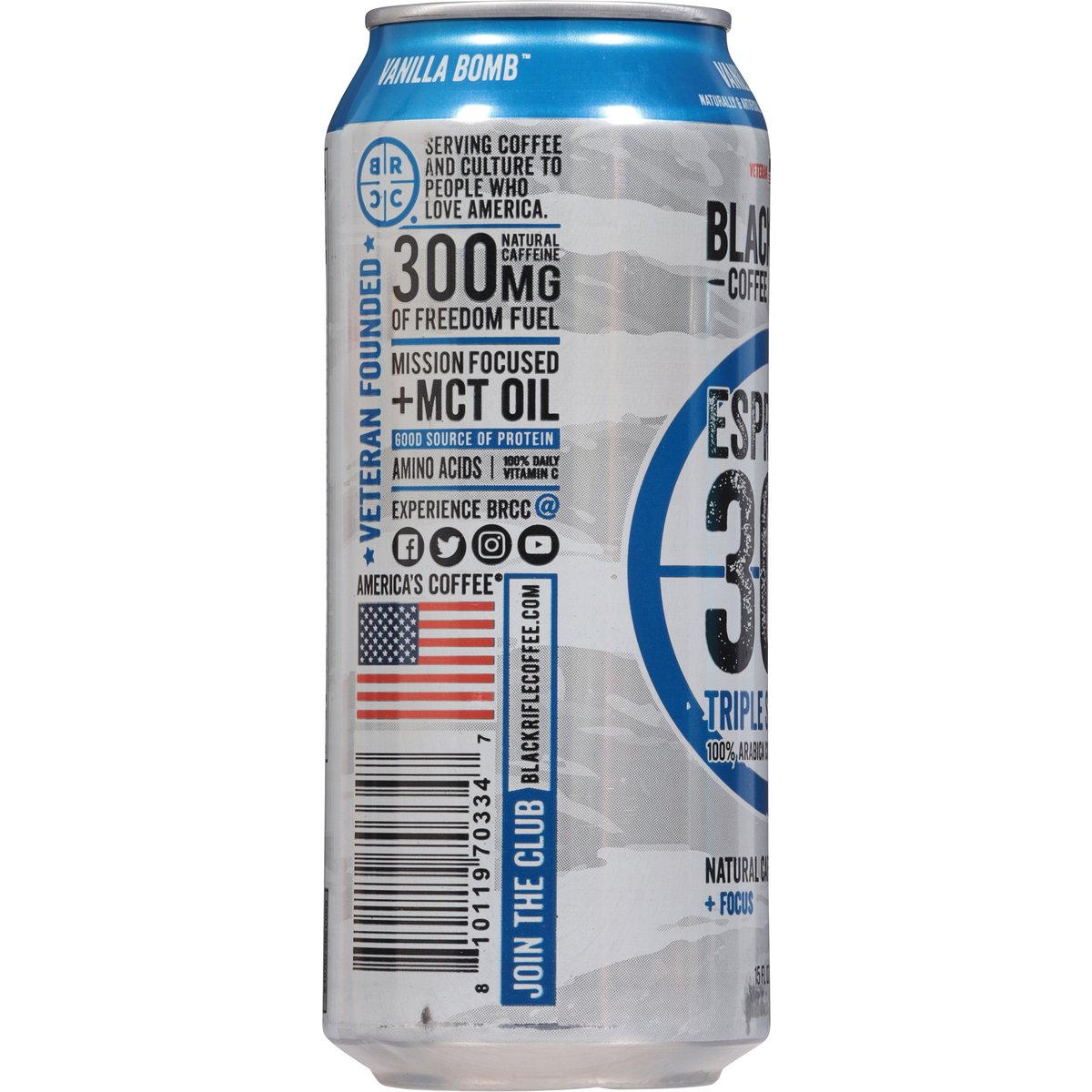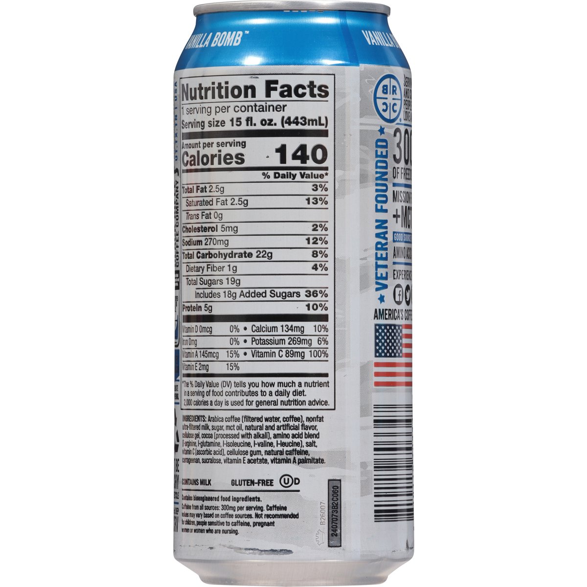 Artificially flavored coffee beverage. Gluten-free. Good source of protein. Amino acids. 100% daily vitamin C. Caffeine from all sources: 300mg per serving. Contains a bioengineered food ingredient. Veteran founded. Serving coffee and culture to people who love America. blackriflecoffee.com. Experience BRCC @Facebook. Twitter. Instagram. YouTube Join the club: blackriflecoffee.com. Don't be trashy please recycle. Produced in the United States from domestic and imported ingredients.