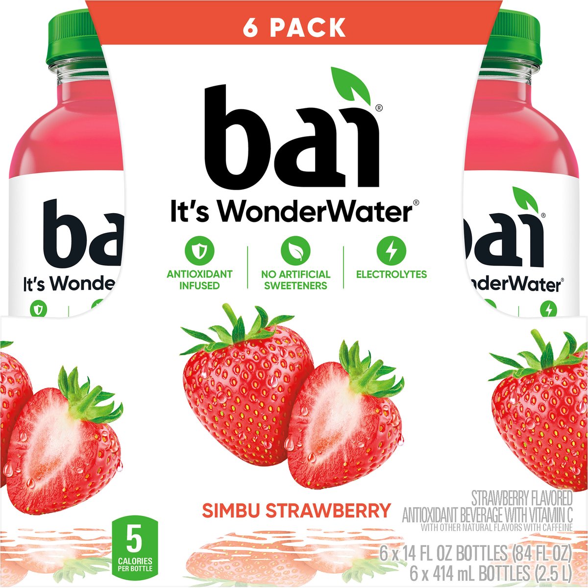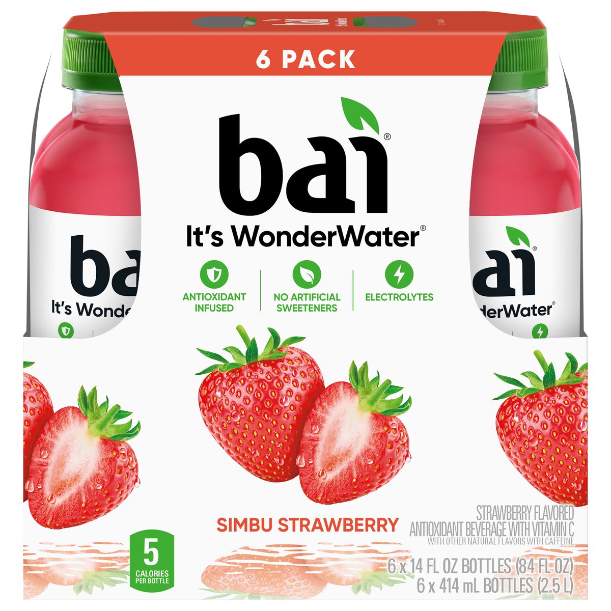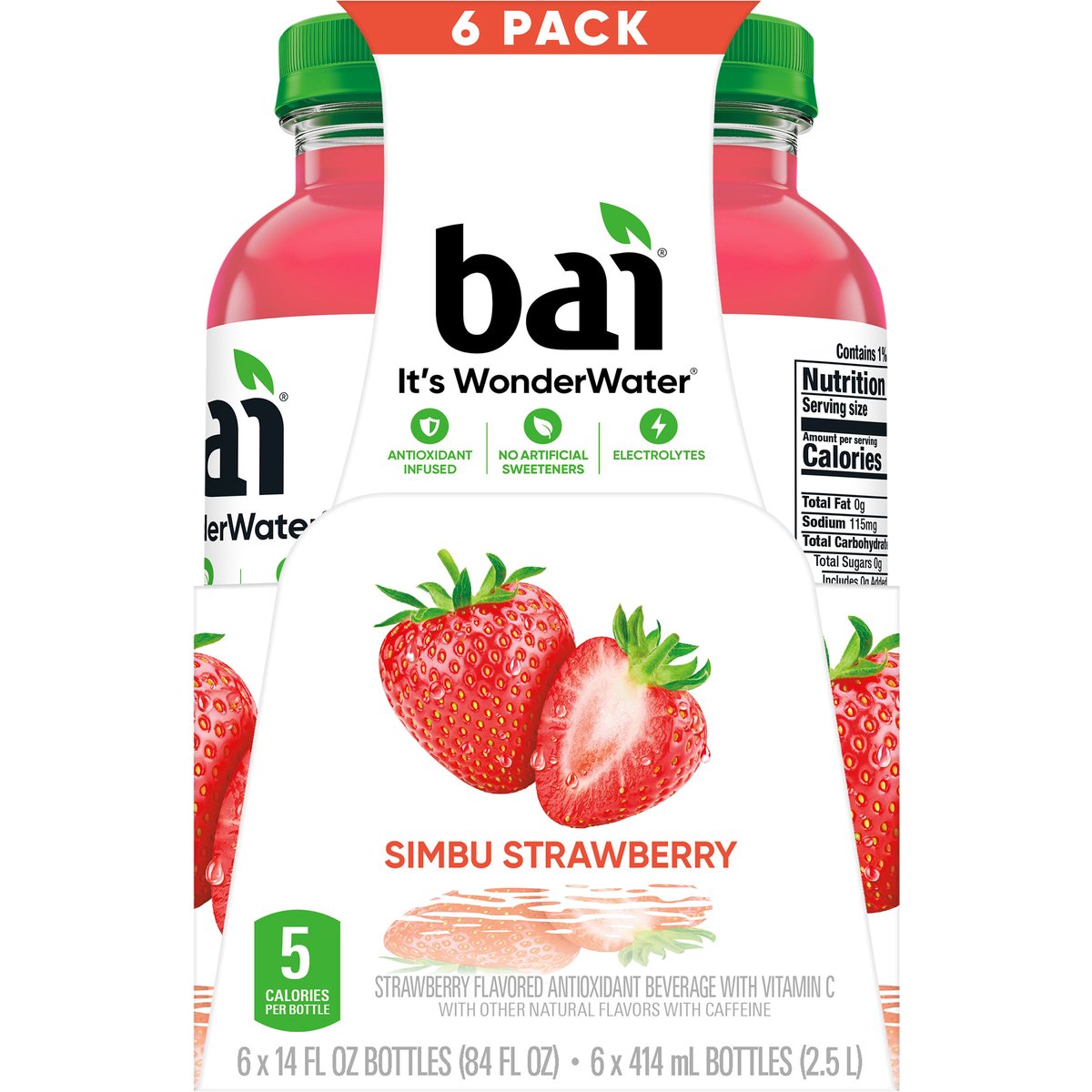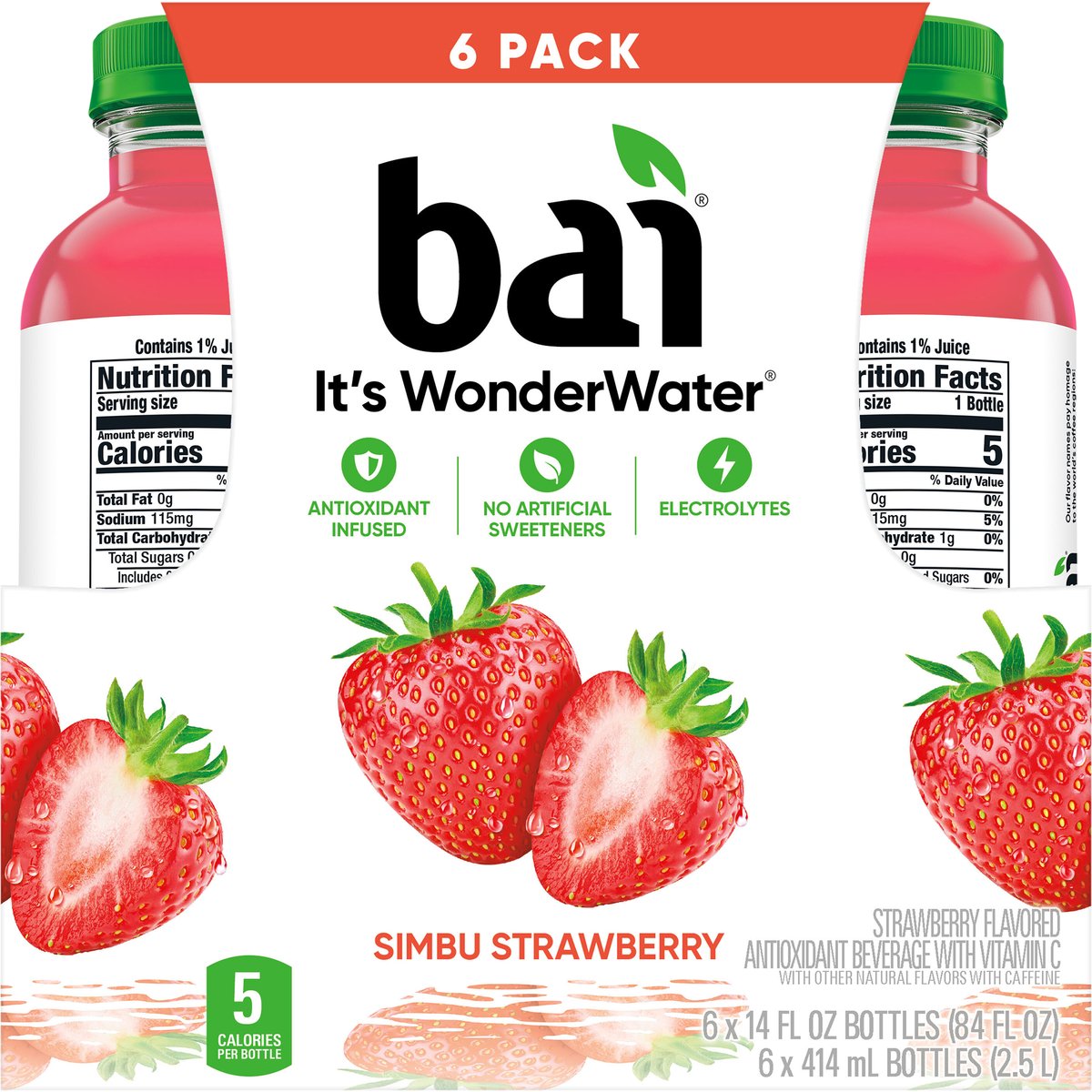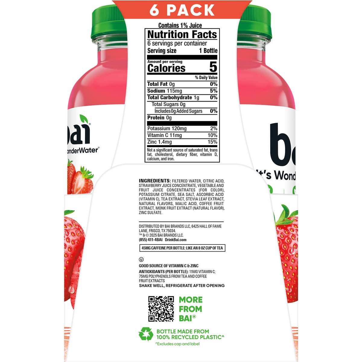 Strawberry flavored antioxidant beverage with vitamin C. With other natural flavors with caffine. 5 calories per bottle. Antioxidants (Per Bottle): 11 mg vitamin C; 75 mg polyphenols from tea and coffee fruit extracts. 45 mg caffeine per bottle: like an 8 oz cup of tea. Good source of vitamin C & zinc. It's WonderWater. Antioxidant infused. No artificial sweeteners. Electrolytes. drinkbai.com. More from BAI. (855) 411-4Bai. Bottle made from 100% recycled plastic^. ^ Excludes cap and label.