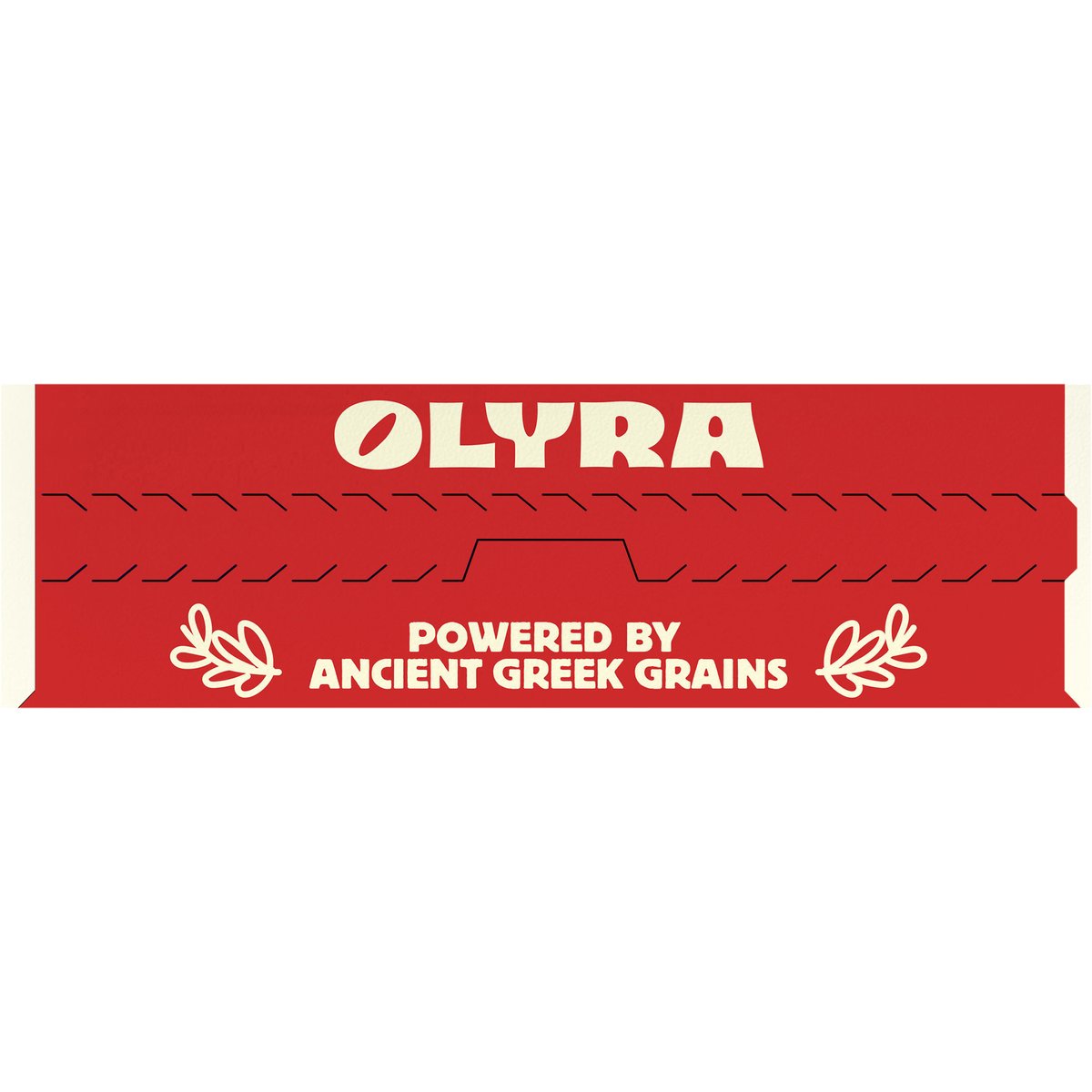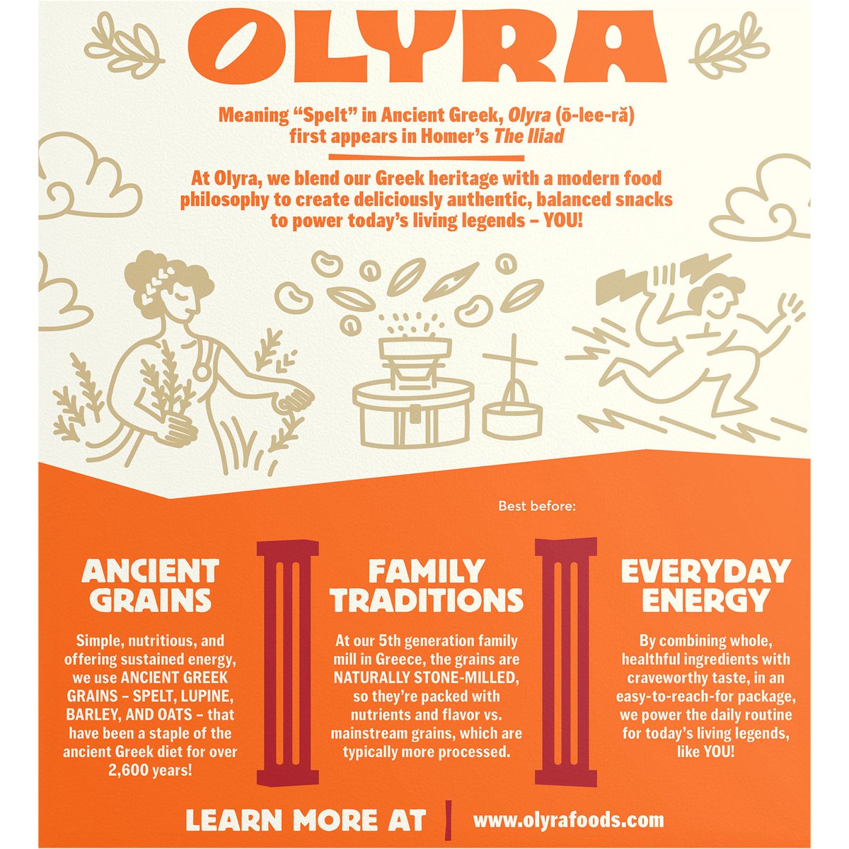 5 g protein per serving | 4 g fiber per serving. USDA Organic. Certified Organic by DIO GR-BIO-01. 14 g whole grains. Vegan. Dairy free. Less Sugar: 33% less than leading brand*. * 33% less sugar than the leading brand on equal weight basis. Non-GMO Project verified. nongmoproject.org. Meaning "Spelt" in Ancient Greek, Olyra (o-lee-ra) first appear in Homer's The lliad. At Olyra, we blend our Greek heritage with a modern food philosophy to create deliciously authentic, balanced snacks to power today's living legends - you! Ancient Grains: Simple, nutritious, and offering sustained energy, we use ancient Greek grains spelt, lupine, barley, and oats - that have been a staple of the ancient Greek diet for over 2,600 years! Family Traditions: At our 5th generation family mill in Greece, the grains are naturally stone-milled, so they're packed with nutrients and flavor vs. mainstream grains, which are typically more processed. Everyday Energy: By combining whole, healthful ingredients with craveworthy taste, in an easy-to-reach-for package, we power the daily routine for today's living legends, like you! www.olyrafoods.com. Scan to learn more! Learn more at www.Olyrafoods.Com. This product funds plastic recovery. We’ve partnered with rePurpose Global to remove plastic from nature, waterways, and marine habitats to be recycled or repurposed. www.repurpose.global. Product of Greece.