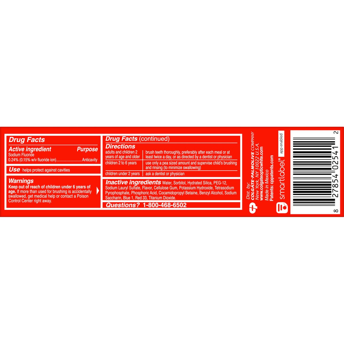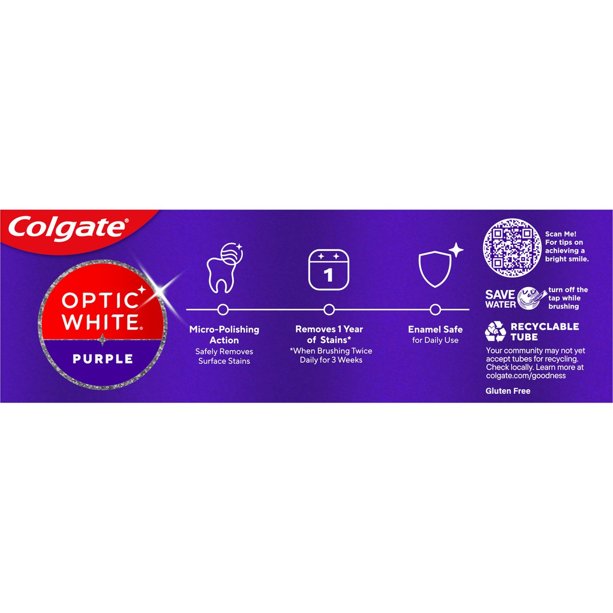 Anticavity fluoride toothpaste. Gluten free. Anticavity fluoride toothpaste. Removes 1 year of stains*. With micro-polishing action. Enamel safe. Optic White. Micro-Polishing Action. Safely removes surface stains. Removes 1 Year of Stains*. Enamel safe for daily use. *When brushing twice daily for 3 weeks. www.colgateopticwhite.com. Scan me! For tips on achieving a bright smile. SmartLabel: App enabled. Questions? 1-800-468-6502. Save water. Turn off the tap while brushing. Recycle tube. Your community may not yet accept tubes for recycling. Check locally. Learn more at www.colgate.com/goodness. Made in Mexico.
