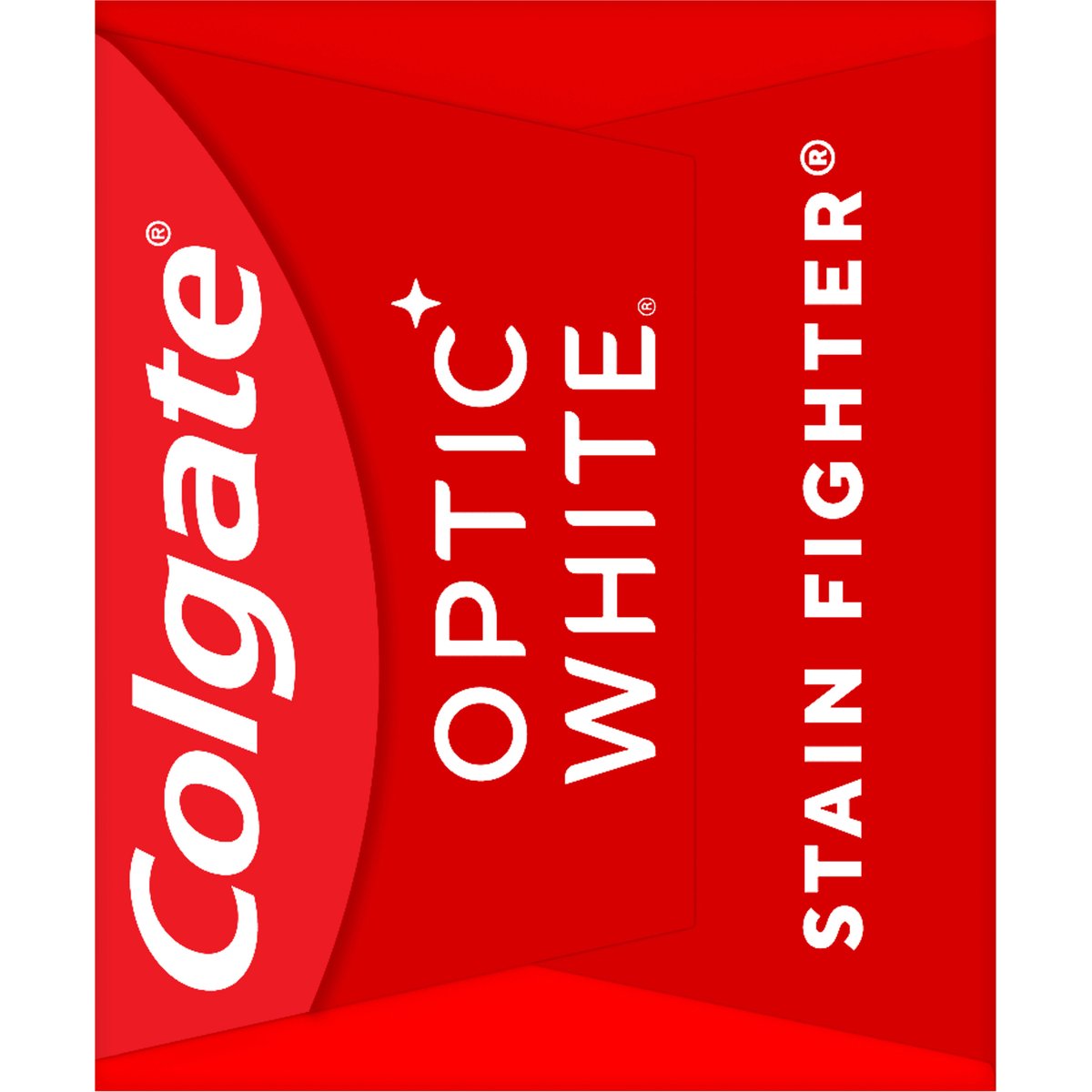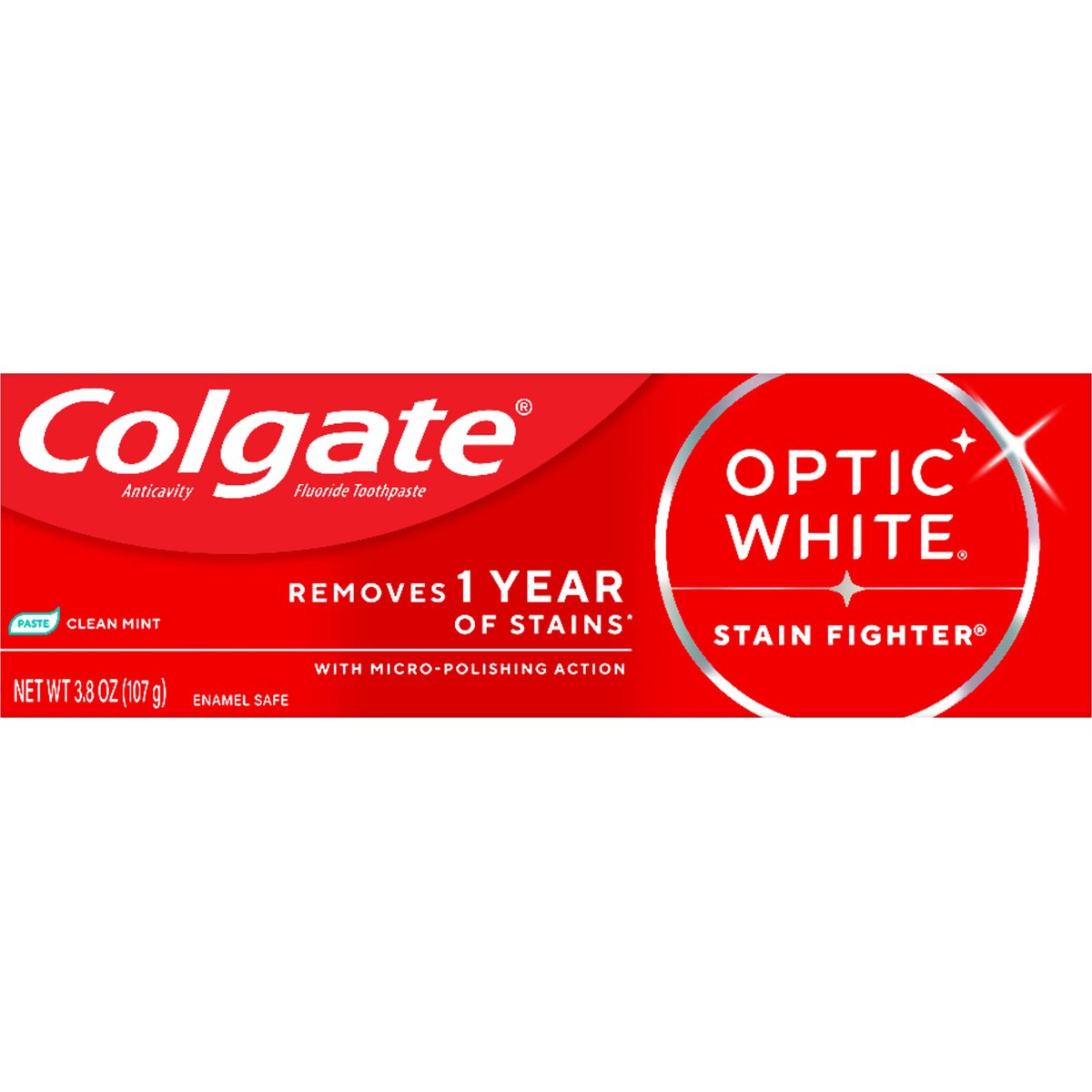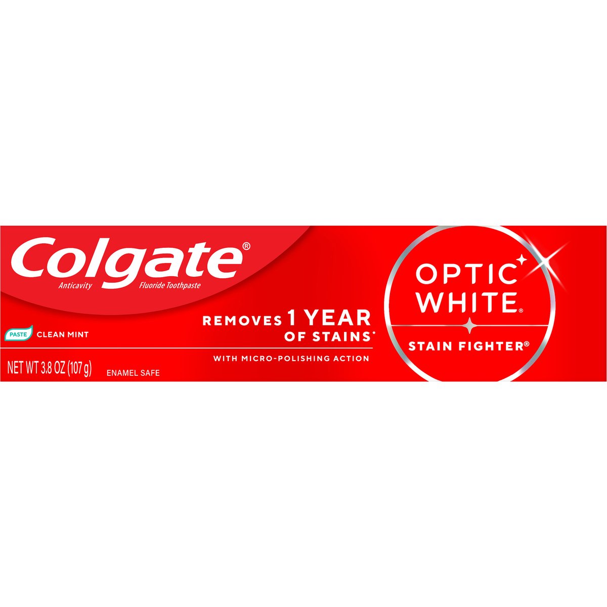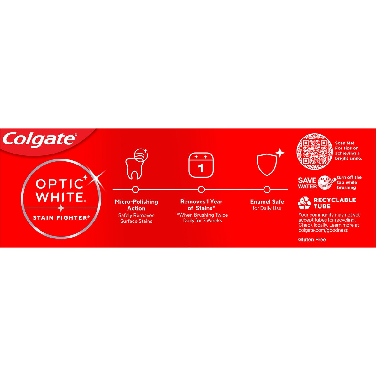 Gluten free. Anticavity fluoride toothpaste. Removes 1 year of stains*. With micro-polishing action. Enamel safe. Optic White. Micro-Polishing Action. Safely removes surface stains. Removes 1 year of stains*. Enamel safe for daily use. * When brushing twice daily for 3 weeks. www.colgateopticwhite.com. Scan! For tips on achieving a bright smile. SmartLabel app enabled. Questions? 1-800-468-6502. Save Water. Turn off the tap while brushing. Recyclable Tube: Your community may not yet accept tubes for recycling. Check locally. Learn more at colgate.com/goodness. Made in Mexico.