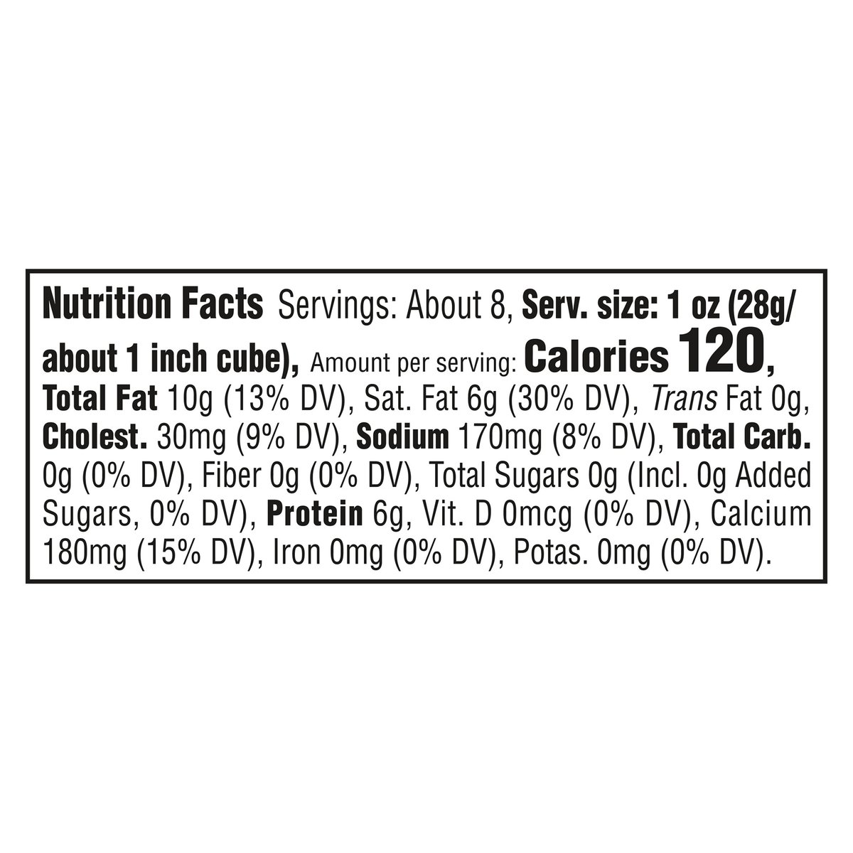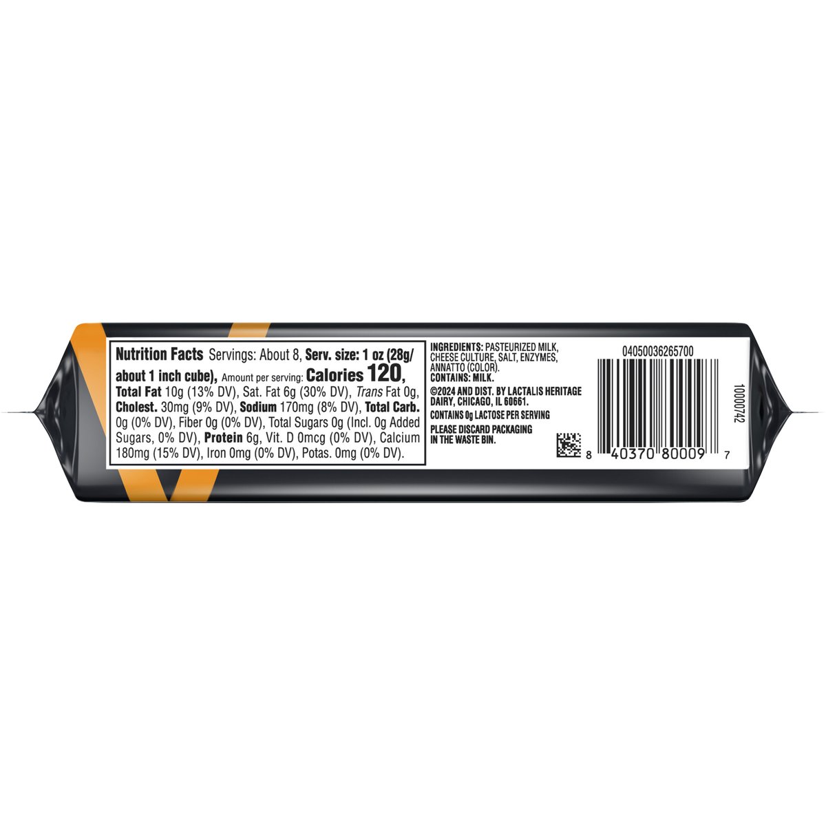 120 calories per 1 oz. Contains 0 g lactose per serving. See nutrition information for fat and saturated fat content. Our rich & bold cheddar, perfect for pairing. crackerbarrelcheese.com. 1-855-237-8748 Please discard packaging in the waste bin.