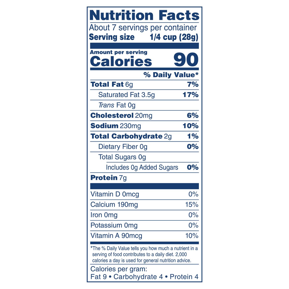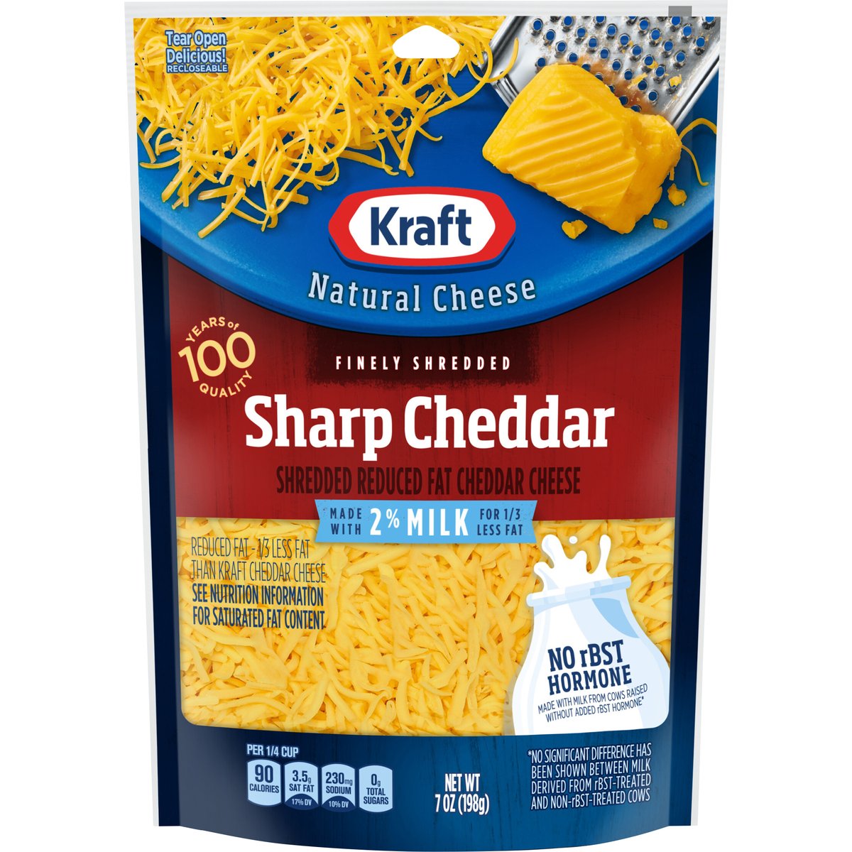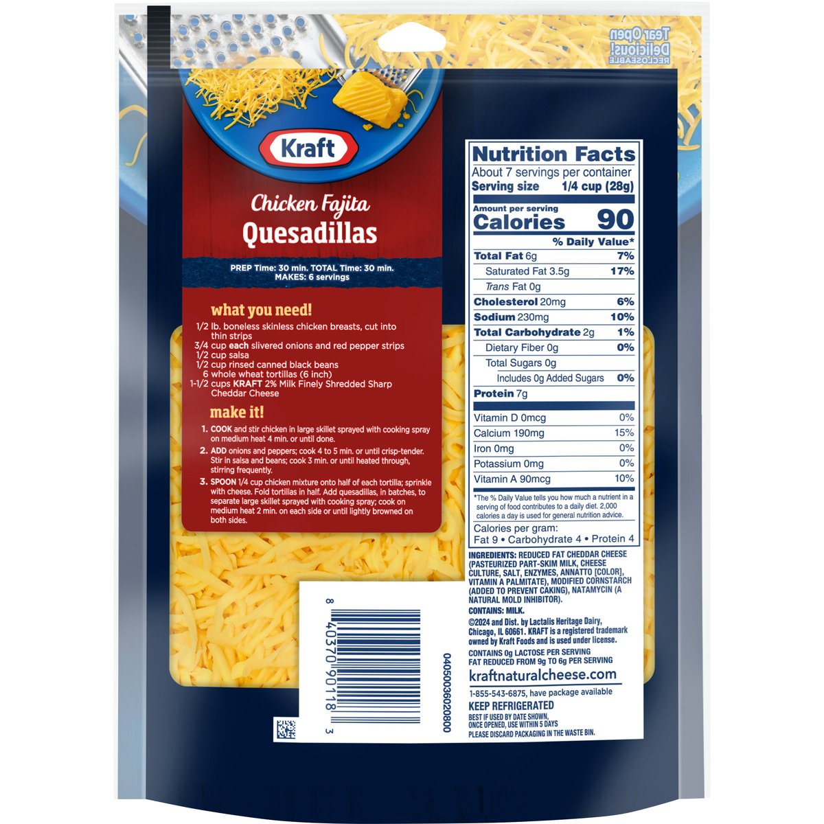Natural cheese. Shredded reduced fat cheddar cheese. Per 1/4 Cup: 90 calories; 3.5 g sat fat (17% DV); 230 mg sodium (10% DV); 0 g total sugars. Contains 0 g lactose per serving. Reduced fat - 1/3 less fat than kraft cheddar cheese. See nutrition information for saturated fat content. Fat reduced from 9 g to 6 g per serving. Delicious! 100 years of quality. No rBST hormone. Made with milk from cows raised without added rBST hormone*. * No significant difference has been shown between milk derived from rBST-treated and non-rBST-treated cows. kraftnaturalcheese.com. 1-855-543-6875, have package available. Recloseable. Please discard packaging in the waste bin.