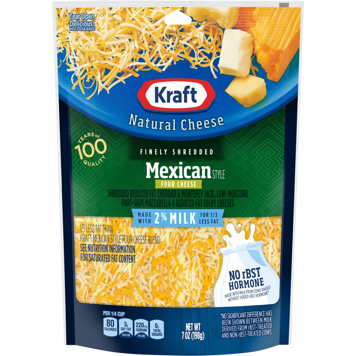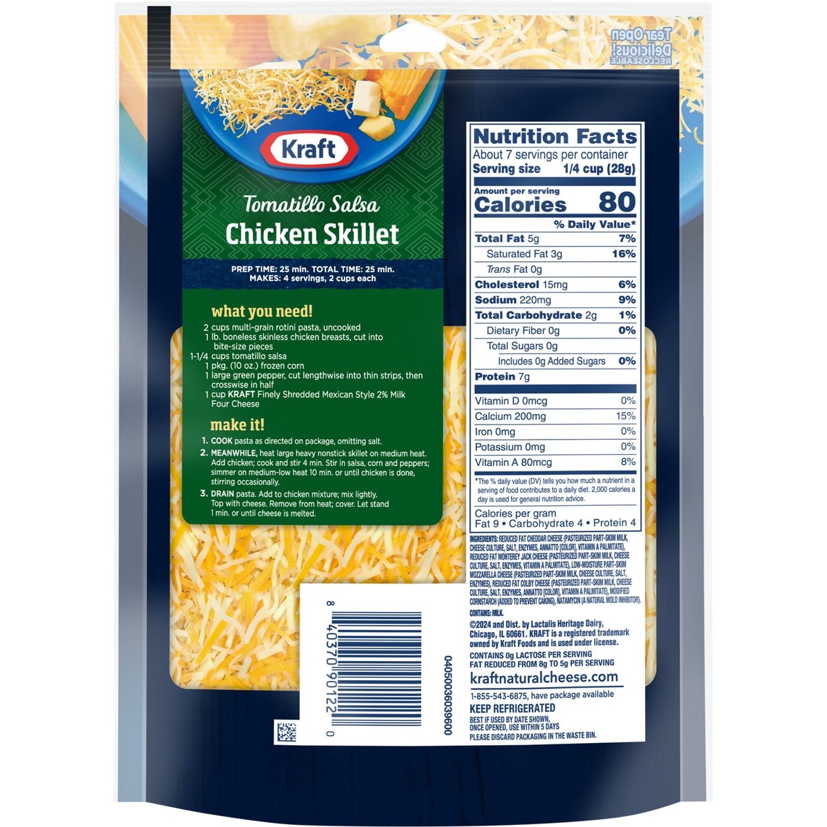 Shredded reduced fat cheddar & monterey jack, low-moisture part-skim mozzarella & reduced fat colby cheeses. Per 1/4 Cup: 80 calories; 3 g sat fat (16% DV); 220 mg sodium (9% DV); 0 g total sugars. Contains 0 g lactose per serving. 1/3 less fat than Kraft Mexican Style Four Cheese Blend. See nutrition information for saturated fat content. 100 years of quality. No rBST hormone. Made with milk from cows raised without added rBST hormone*. * No significant difference has been shown between milk derived from rBST-treated and non-rBST-treated cows. kraftnaturalcheese.com. 1-855-543-6875, have package available. Recloseable. Please discard packaging in the waste bin.