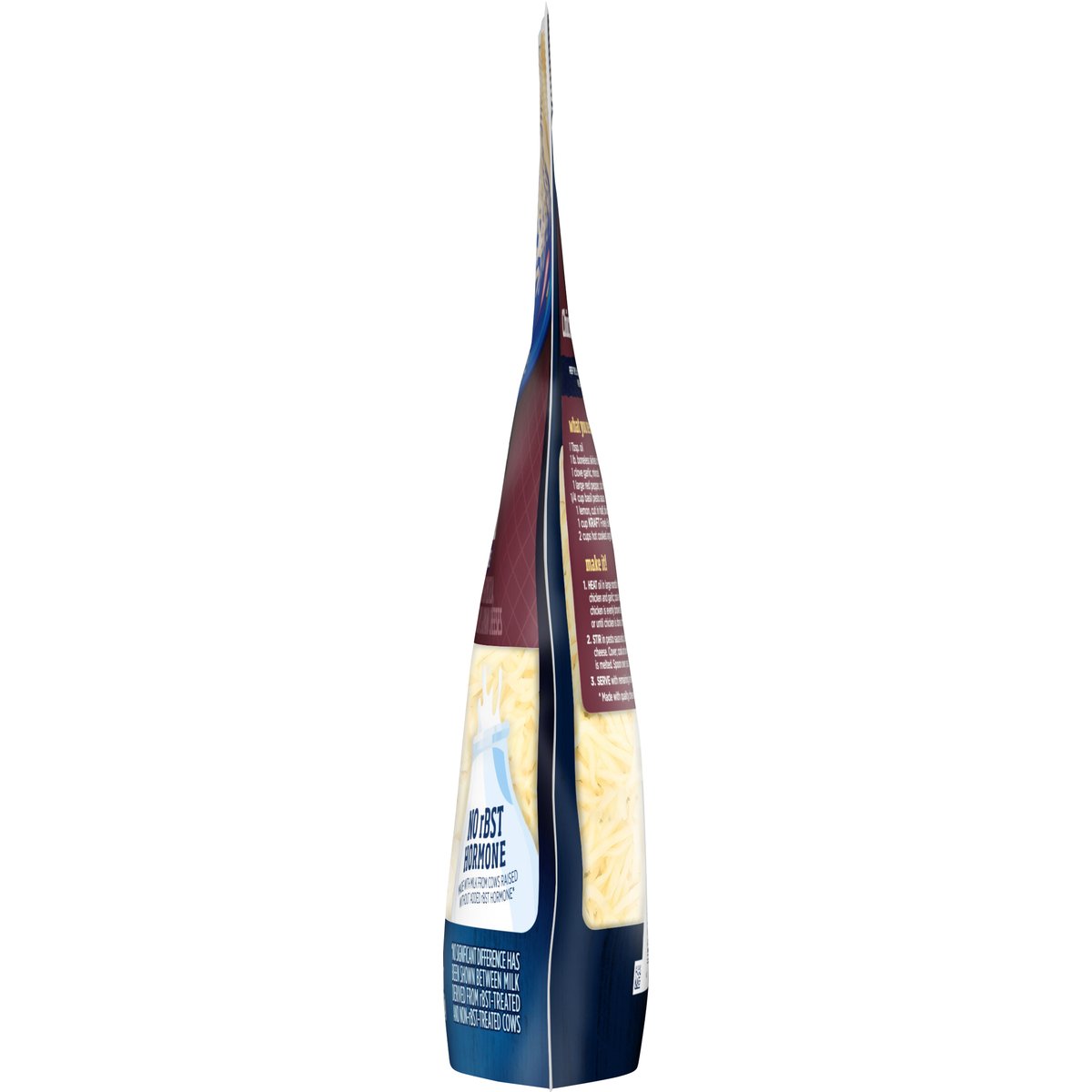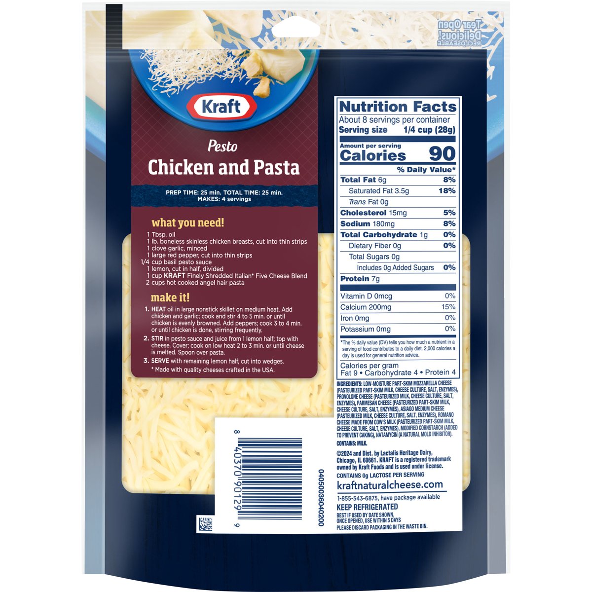 Natural cheese. Shredded low-moisture part-skim Mozzarella, Provolone, Parmesan, Asiago Medium, & Romano cheeses. Per 1/4 Cup: 90 calories; 3.5 g sat fat (18% DV); 180 mg sodium (8% DV); 0 g total sugars. Contains 0 g lactose per serving. Delicious! 100 years of quality. No rBST hormone - Made with milk from cows raised without added rBST hormone*. * No significant difference has been shown between milk derived from rBST-treated and non-treated-rBST treated cows. kraftnaturalcheese.com. kraftnaturalcheese.com. 1-855-543-6875, have package available. Recloseable. Please discard packaging in the waste bin. Made with quality cheeses crafted in the USA.