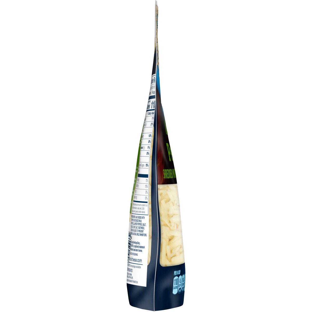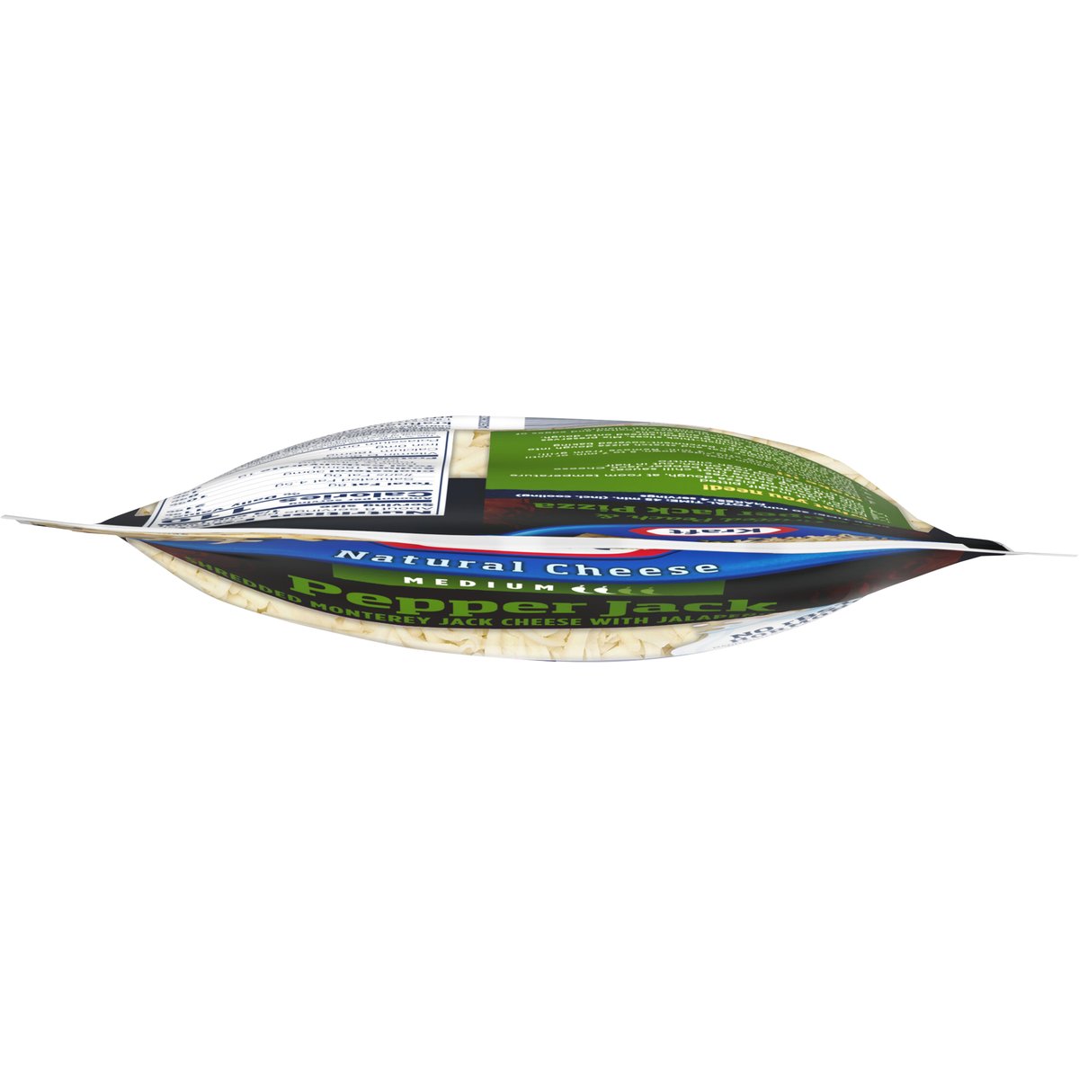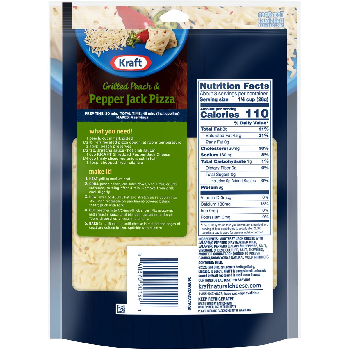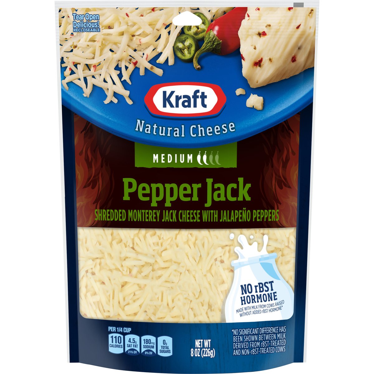Shredded monterey jack cheese with jalapeno peppers. Per 1/4 Cup: 100 calories; 4.5 g sat fat (21% DV); 180 mg sodium (8% DV); 0 g total sugars. Contains 0 g lactose per serving. No rBST hormone. Made with milk from cows raised without added rBST hormone*. * No significant difference has been shown between milk derived from rBST-treated and non-rBST treated cows. kraftnaturalcheese.com. 1-855-543-6875, have package available. Recloseable! Please discard packaging in the waste bin.