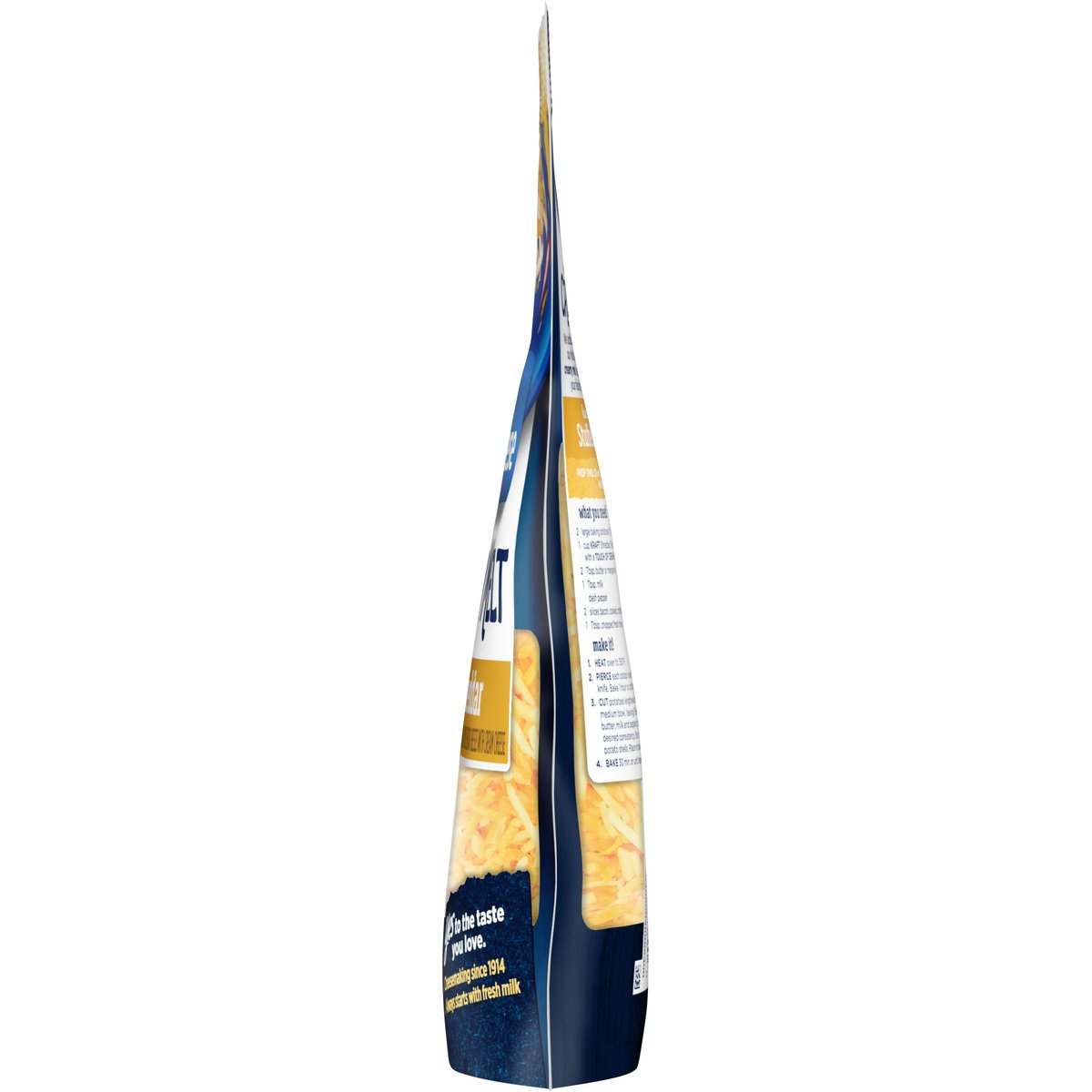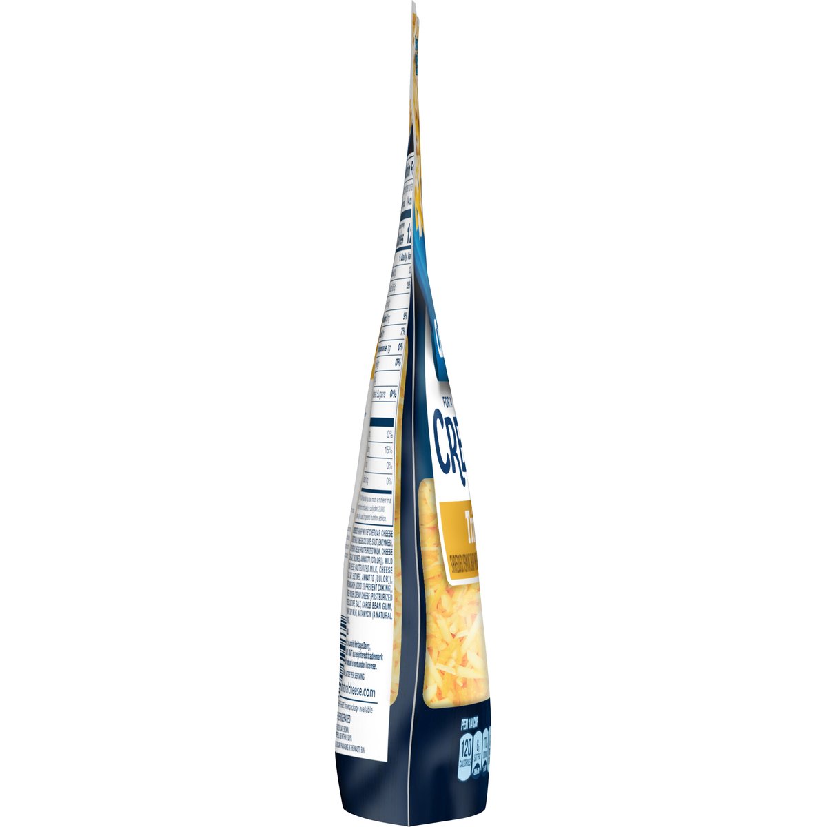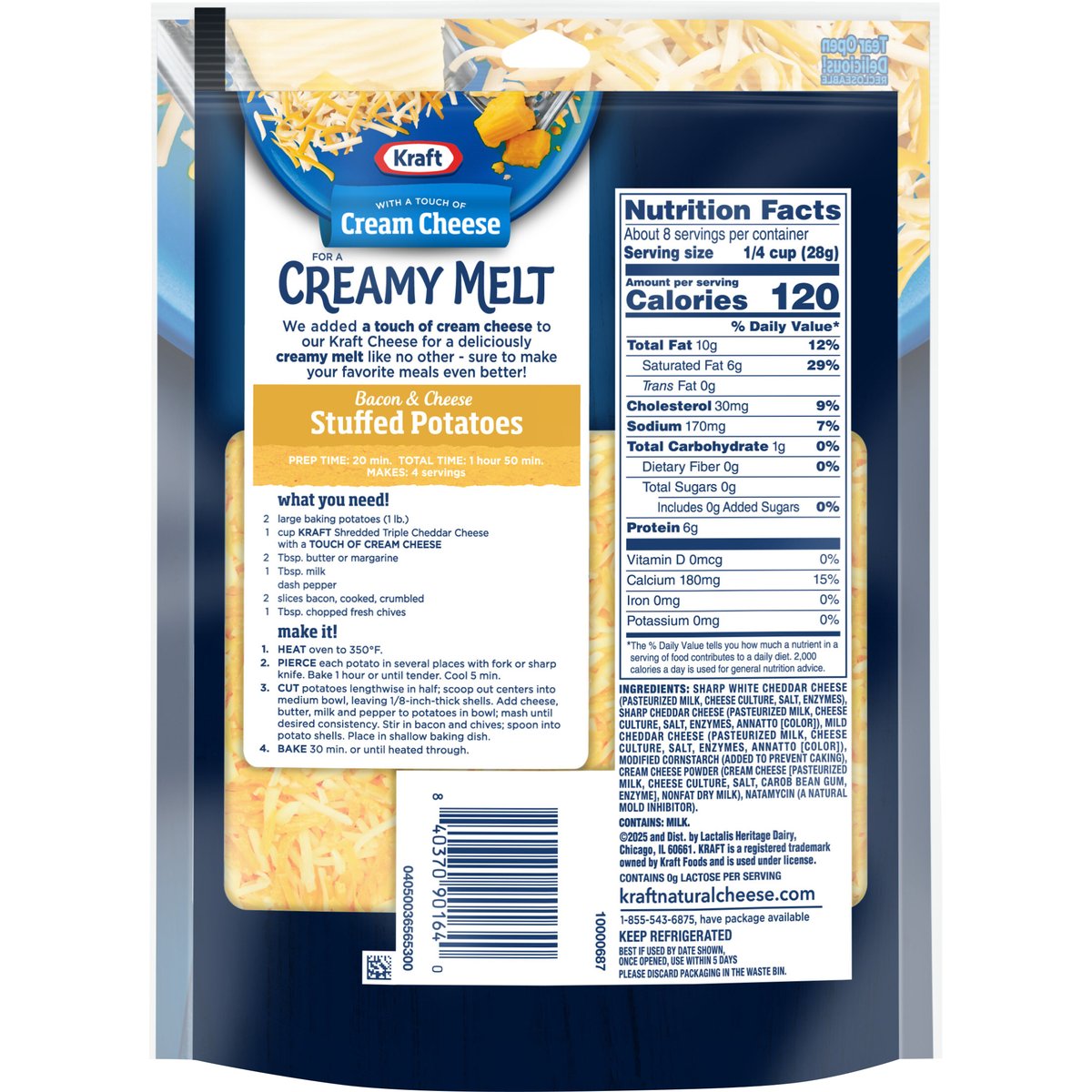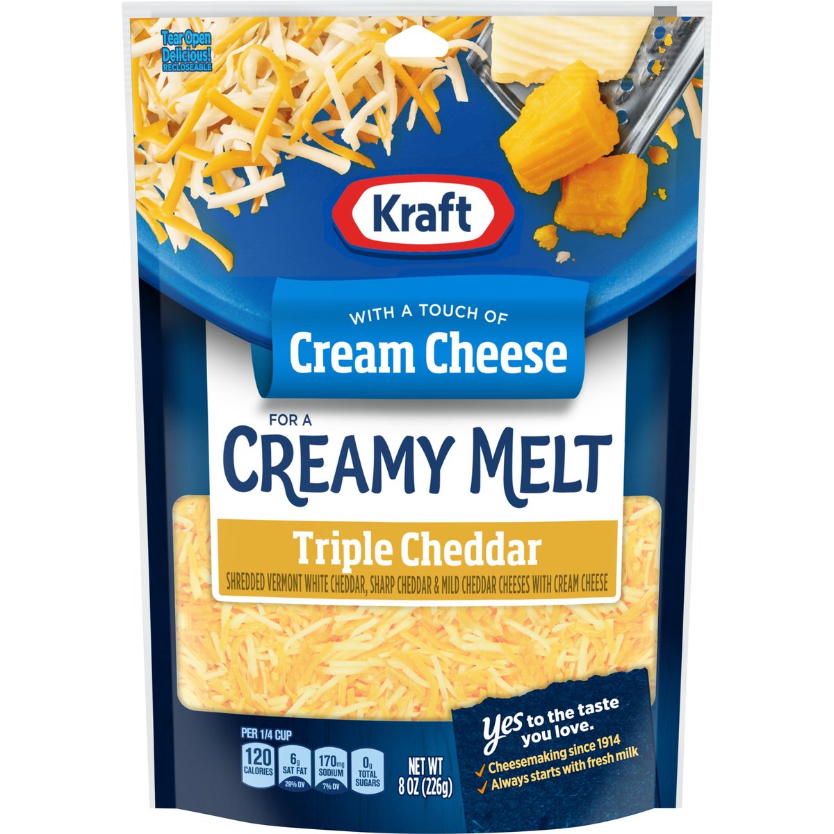 With a touch of cream cheese. Shreded vermont white cheddar, sharp cheddar & mid cheddar cheeses with cream cheese. Per 1/4 Cup: 120 calories; 6 g sat fat (29% DV); 170 mg sodium (7% DV); 0 g total sugars. Contains 0 g lactose per serving. Yes to the taste you love. Cheesemaking since 1914. Always stars with fresh milk. We added a touch of cream cheese to our Kraft Cheese for a deliciously creamy melt like no other - sure to make your favorite meals even better! kraftnaturalcheese.com. 1-855-543-6875, have package available. Please discard packaging in the waste bin.