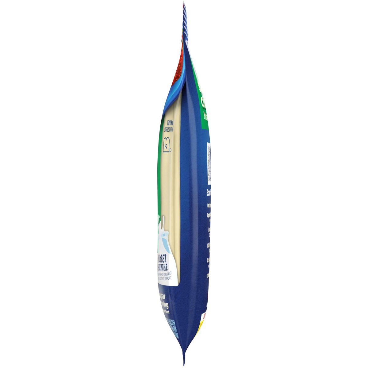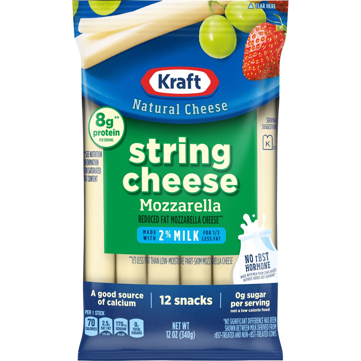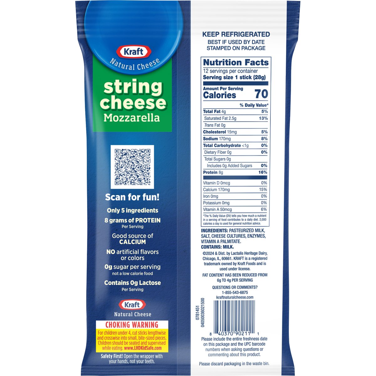 Natural cheese. No artificial flavors or colors. 8 g** protein per serving. 0 g sugar per serving. Per 1 Stick: 70 calories; 2.5 g sat fat (13% DV); 170 mg sodium (0% DV); 0 g total sugars. 8 grams of protein per serving. Contains 0 g lactose per serving. ** See nutrition information for saturated fat content. Reduced fat mozzarella cheese***. A good source of calcium. Not a low calorie food. Fat content has been reduced from 6 g to 4 g per serving. *** 1/3 less fat than low-moisture part-skim mozzarella cheese. No rBST hormone. Made with milk from cows raised without added rBST hormone*. Only 5 ingredients. * No significant difference has been shown between milk derived from rBST-treated and non-rBST-treated cows. kraftnaturalcheese.com. Scan for fun! Questions or comments? 1-855-543-6875; kraftnaturalcheese.com. Please include the entire freshness date on this package and the UPC barcode numbers when asking questions or commenting about this product. Please discard packaging in the waste bin.