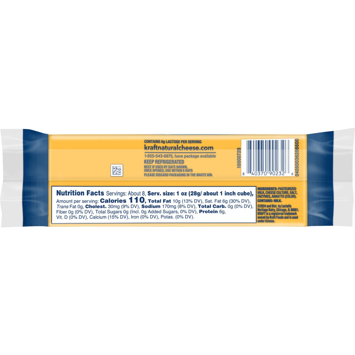 110 calories per 1 oz. Contains 0 g lactose per serving. See nutrition information for fat and saturated fat content. No rBST hormone - Made with milk from cows raised without added rBST hormone*. *No significant difference has been shown between milk derived from rBST-treated and non-treated-rBST treated cows. kraftnaturalcheese.com. kraftnaturalcheese.com. 1-855-543-6875, have package available. Please discard packaging in the waste bin.