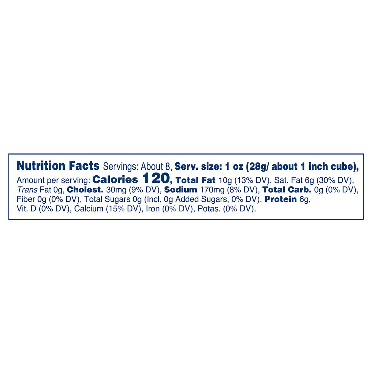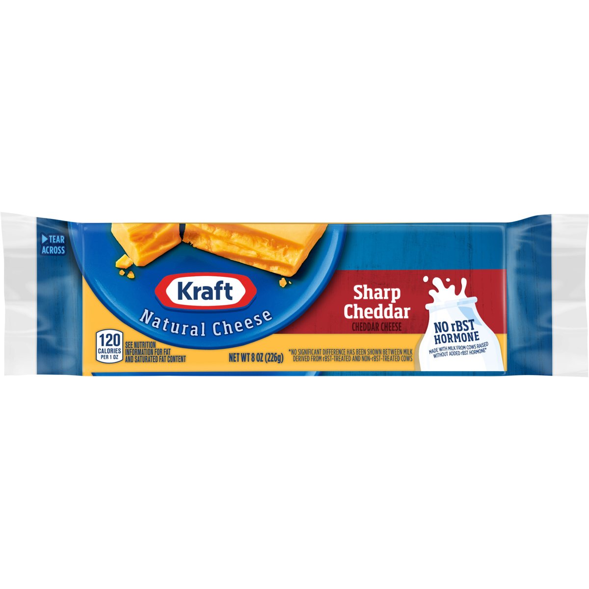 120 calories per 1 oz. Contains 0 g lactose per serving. See nutrition information for fat and saturated fat content. No rBST hormone. Made with milk from cows raised without added rBST hormone*. * No significant difference has been shown between milk derived from rBST-treated and non-rBST-treated cows. kraftnaturalcheese.com. 1-855-543-6875, have package available. Please discard packaging in the waste bin.