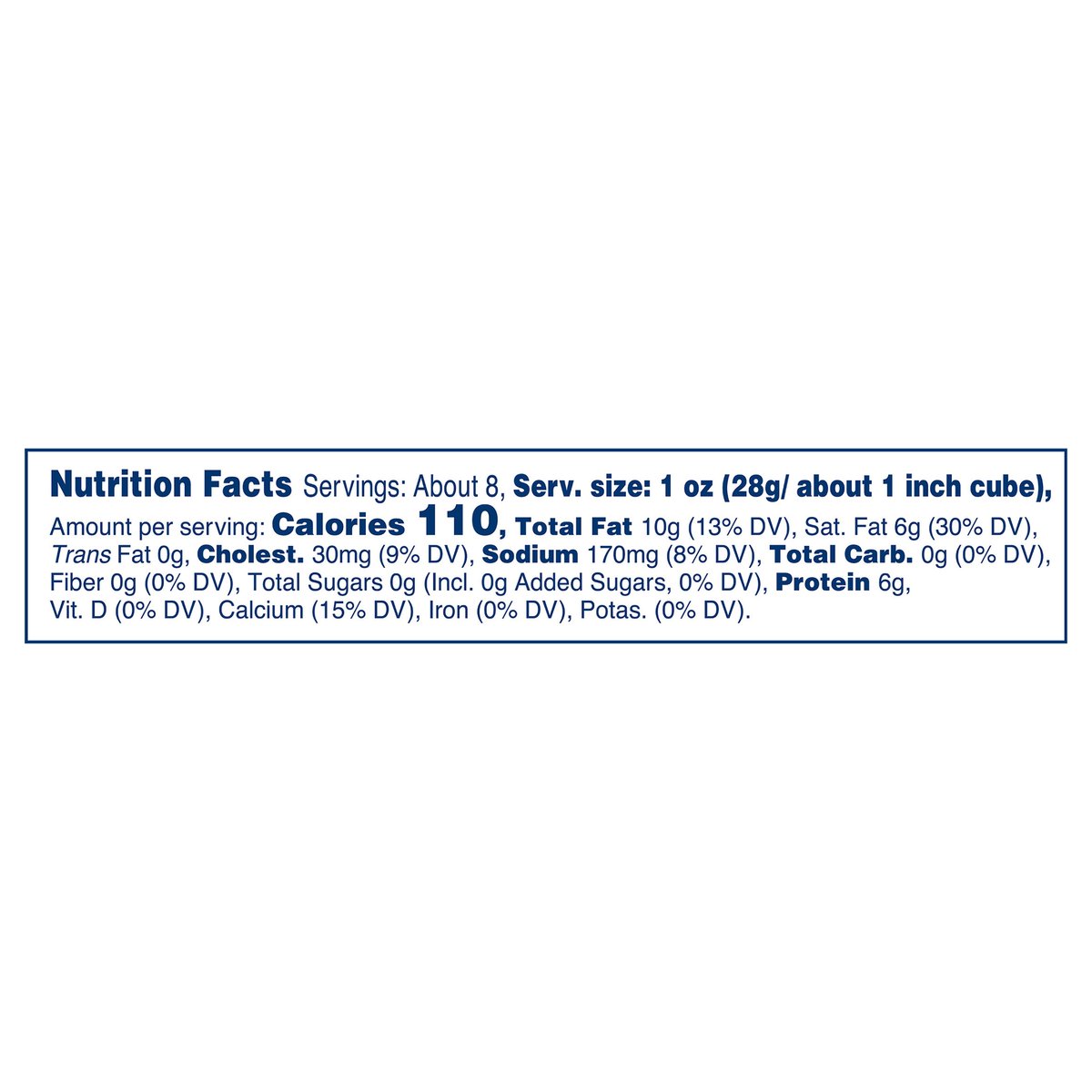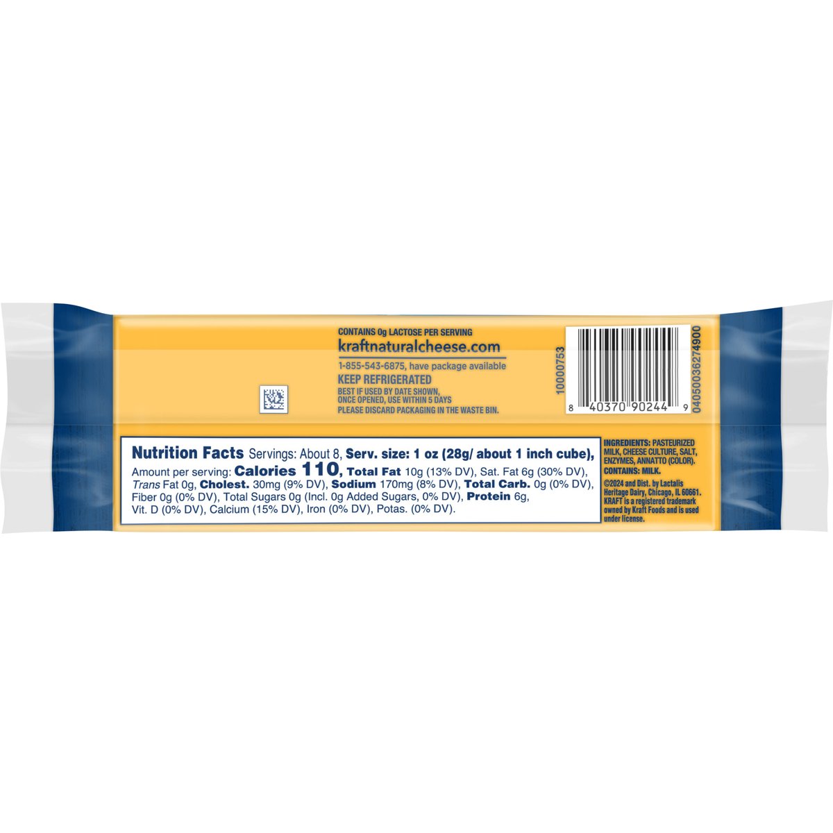 110 calories per 1 oz. Contains 0 g lactose per serving. See nutrition information for fat and saturated fat content. No rBST hormone. Made with milk from cows raised without added rBST hormone*. * No significant difference has been shown between milk derived from rBST-treated and non-rBST-treated cows. kraftnaturalcheese.com. 1-855-543-6875, have package available. Please discard packaging in the waste bin.