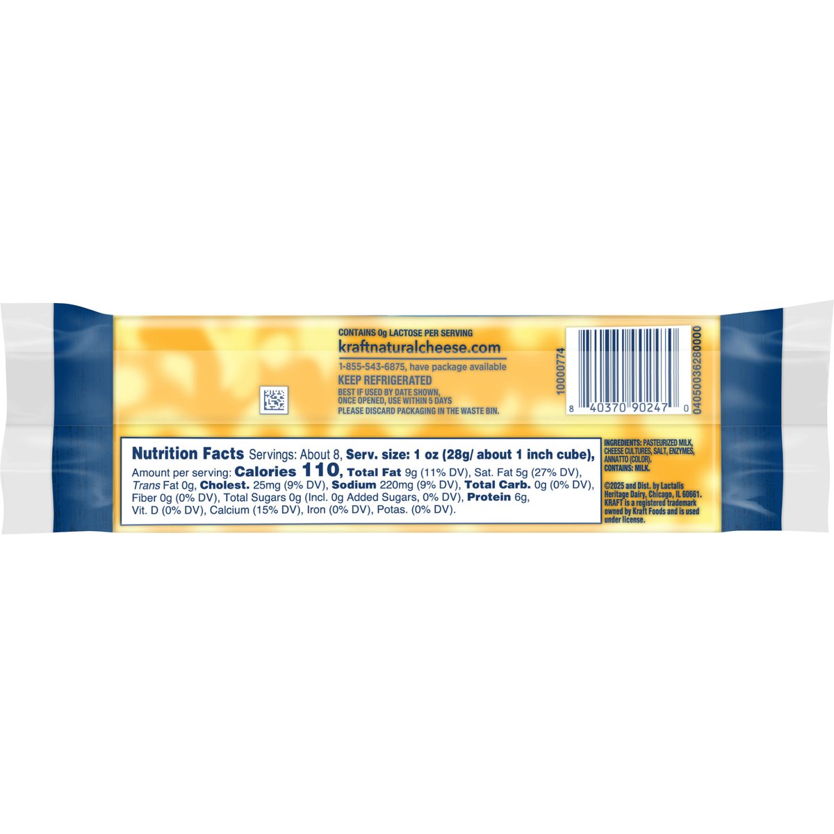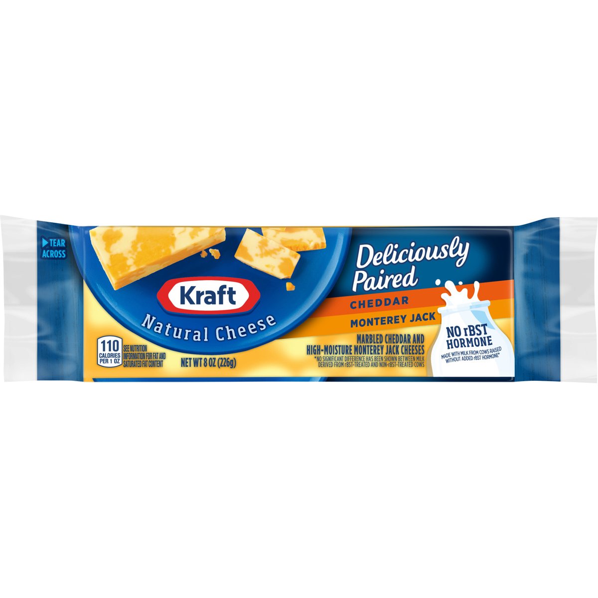 Marbled cheddar and high-moisture monterey jack cheeses. 110 calories per 1 oz. Contains 0 g lactose per serving. See nutrition information for fat and saturated fat content. Deliciously paired. No rBST hormone made with milk from cows raised without added rBST hormone*. * No significant difference has been shown between milk derived from rBST-treated and non-rBST-treated cows. kraftnaturalcheese.com. kraftnaturalcheese.com. 1-855-543-6875, have package available. Please discard packaging in the waste bin.