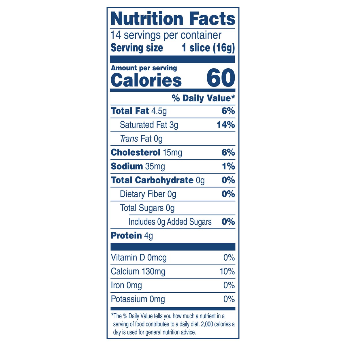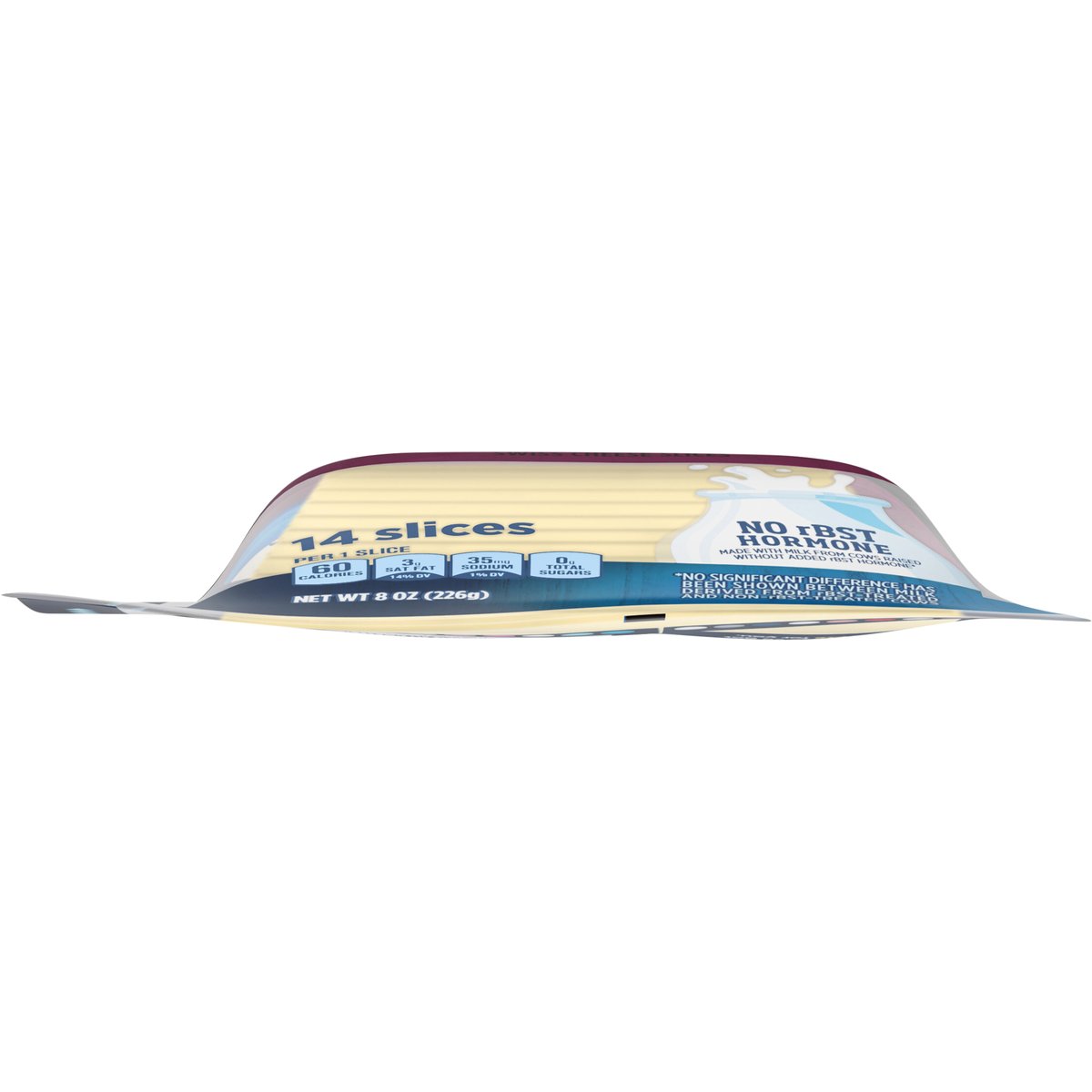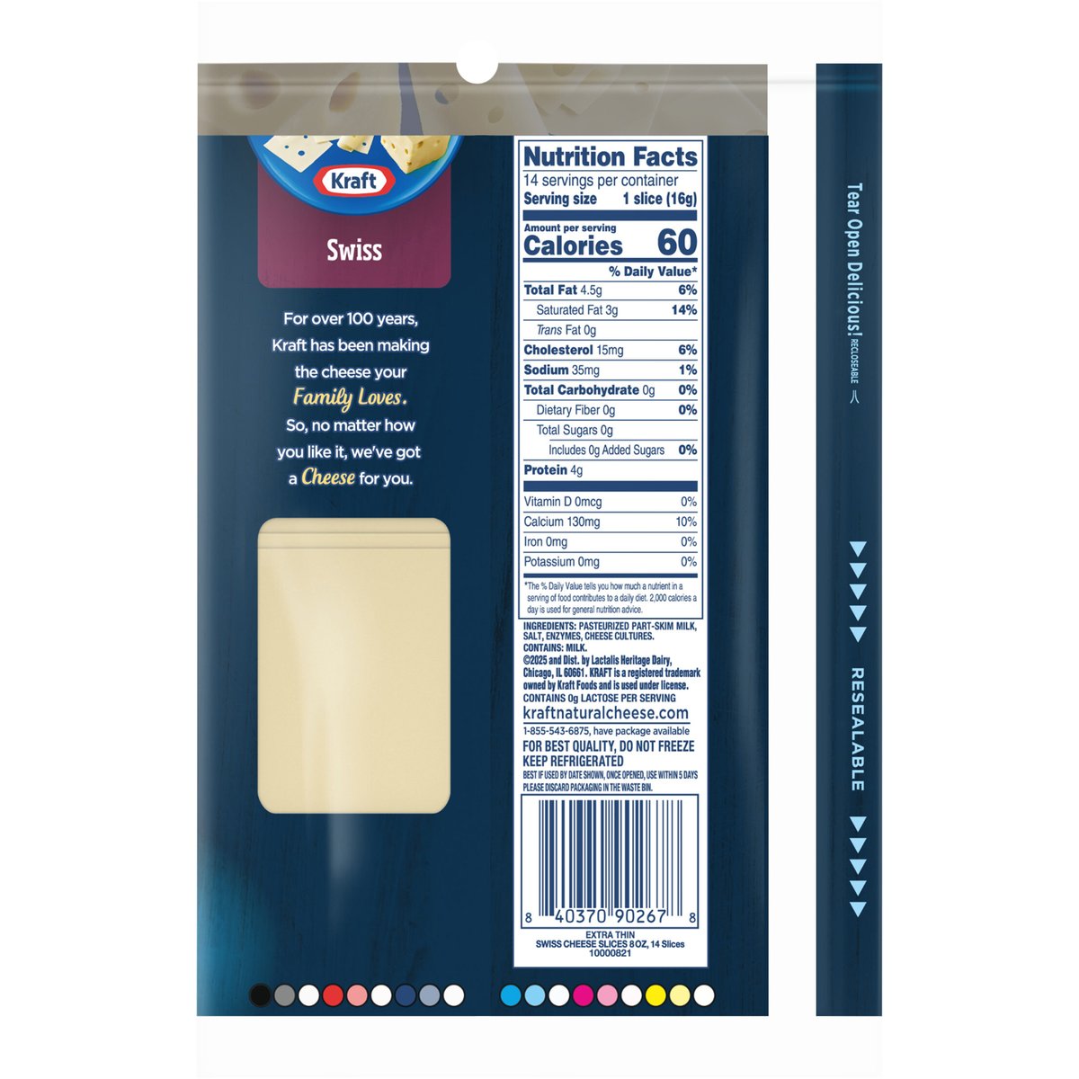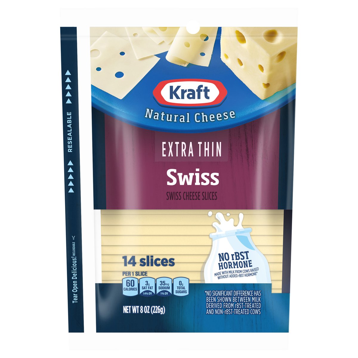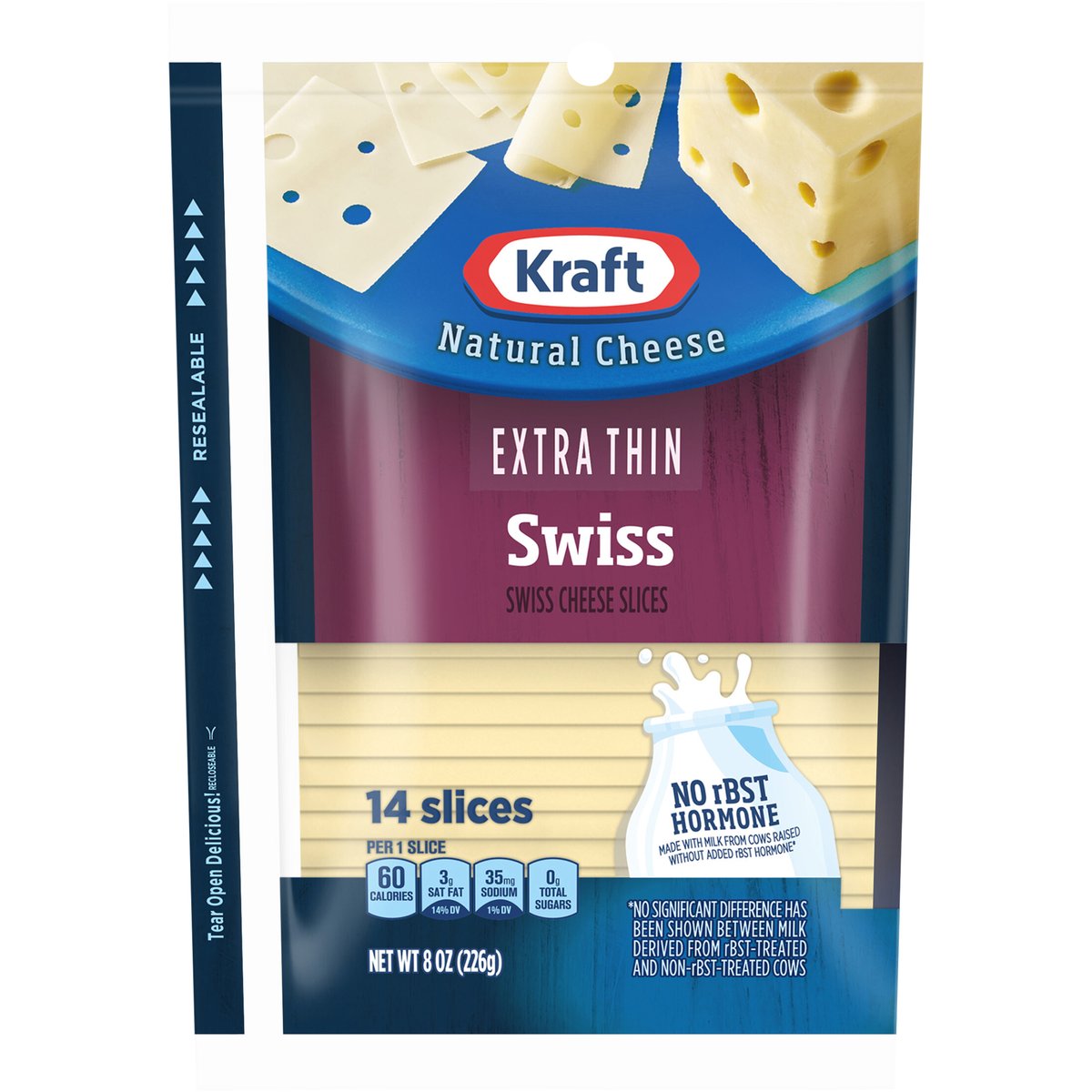 Swiss Cheese Slices. Per 1 Slice: 60 calories; 3 g sat fat (14% DV); 35 mg sodium (1% DV); 0 g total sugars. Contains 0 g lactose per serving. No rBST hormone. For over 100 years, Kraft has been making the cheese your Family Loves. So, no matter how you like it, we've got a Cheese for you. kraftnaturalcheese.com. 1-855-543-6875, have package available. Recloseable. Resealable. Please discard packaging in the waste bin.